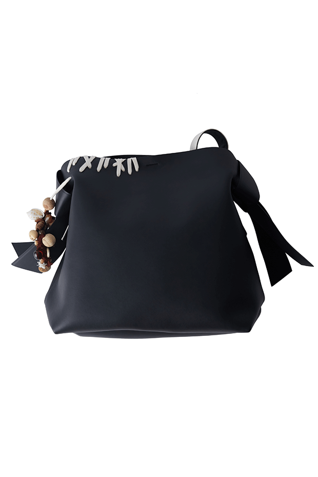 The new bags are decorated with eyelets, lace and charms. The classical Musubi shopper and Musubi handbag are updated in the seasonal colour storm blue in addition to cognac and black. The twisted knot motif inspired by the obi sash of traditional Japanese dresses characterises the design of all the Musubi bags. The hand-stitched details give the products an artisanal look. All bags are made in Italy from the finest calf leather with contrasting lining. – from Acne Studios