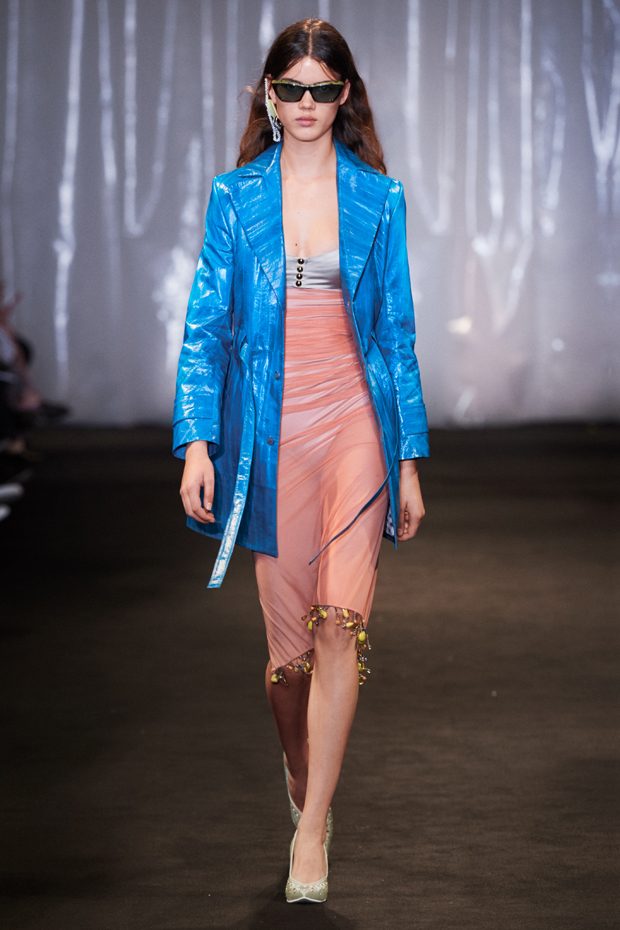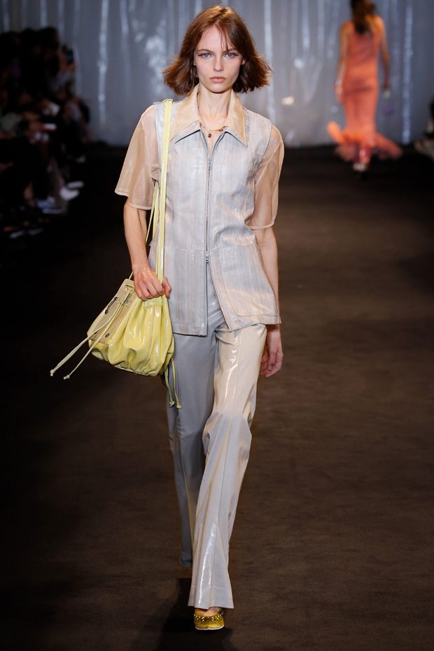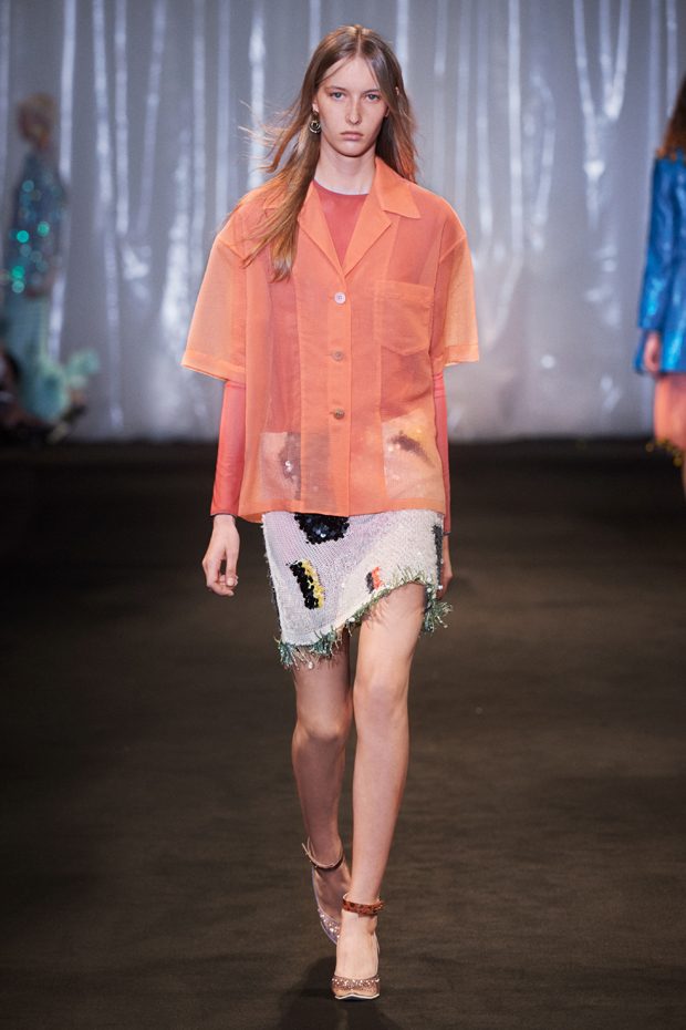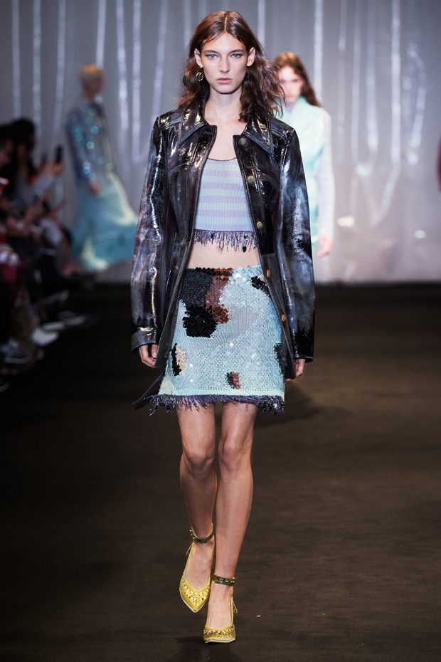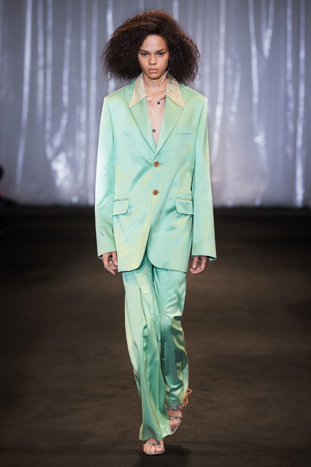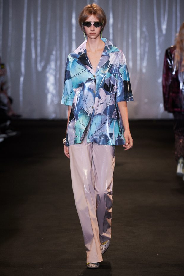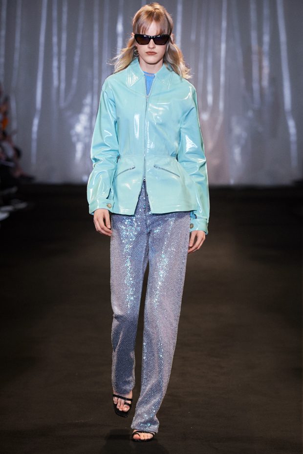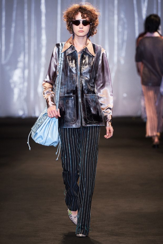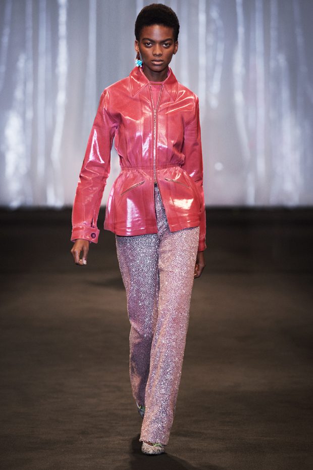 Acne Studios presents the spring summer 2018 collection at Paris Fashion Week. This season’s collection has a ‘70s groove/thrift store/acid vibe. The collection emphasizes separates; satin shorts, sheer tops and dresses, jackets, high waist trousers. Pastel colors filled the runway. Fabrics are treated and embellished, but seem simple. Looks that appear like plastic are actually jersey that has been treated with starch.