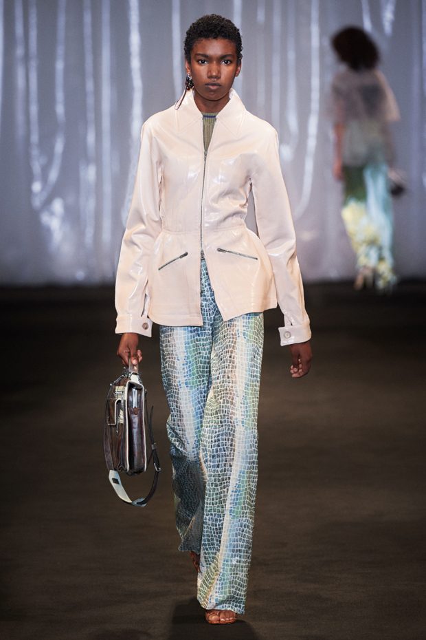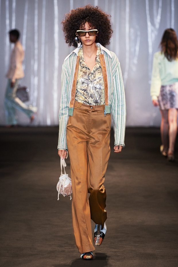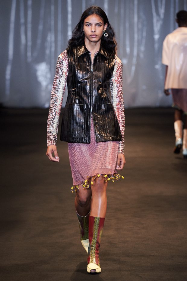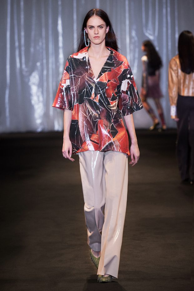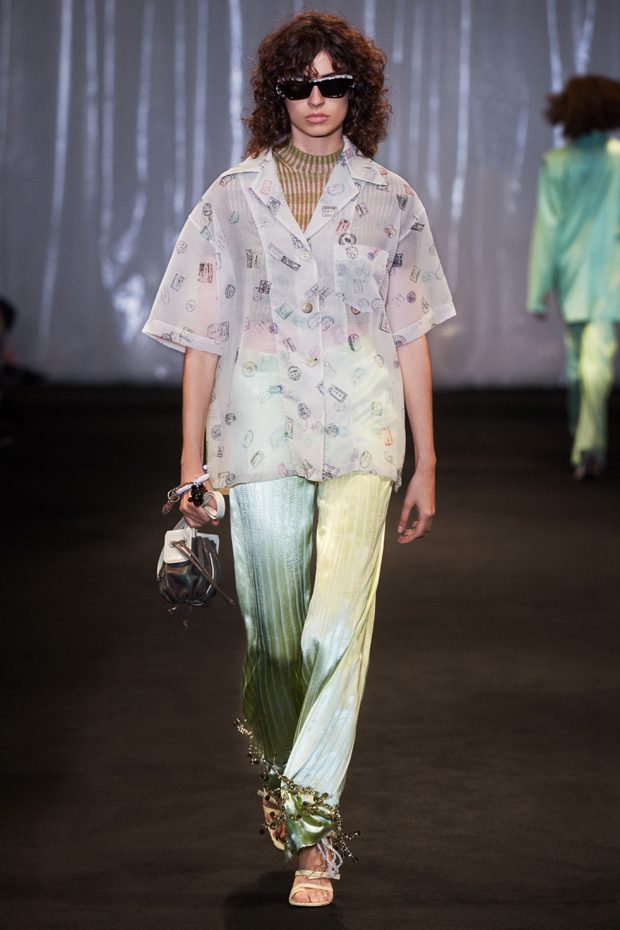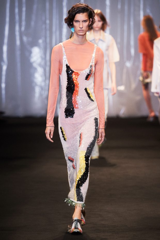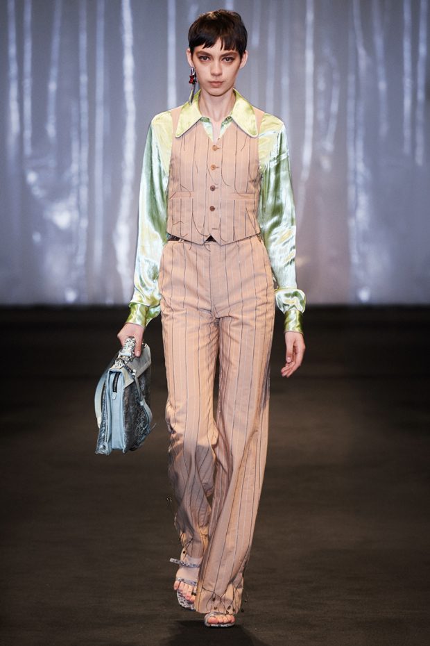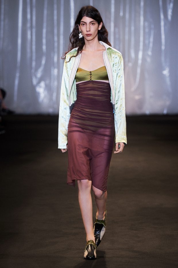 Acne Studios presents the spring summer 2018 collection at Paris Fashion Week. This season’s collection has a ‘70s groove/thrift store/acid vibe. The collection emphasizes separates; satin shorts, sheer tops and dresses, jackets, high waist trousers. Pastel colors filled the runway. Fabrics are treated and embellished, but seem simple. Looks that appear like plastic are actually jersey that has been treated with starch.