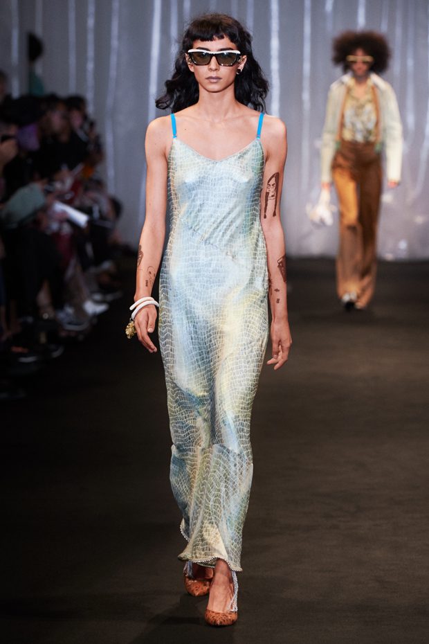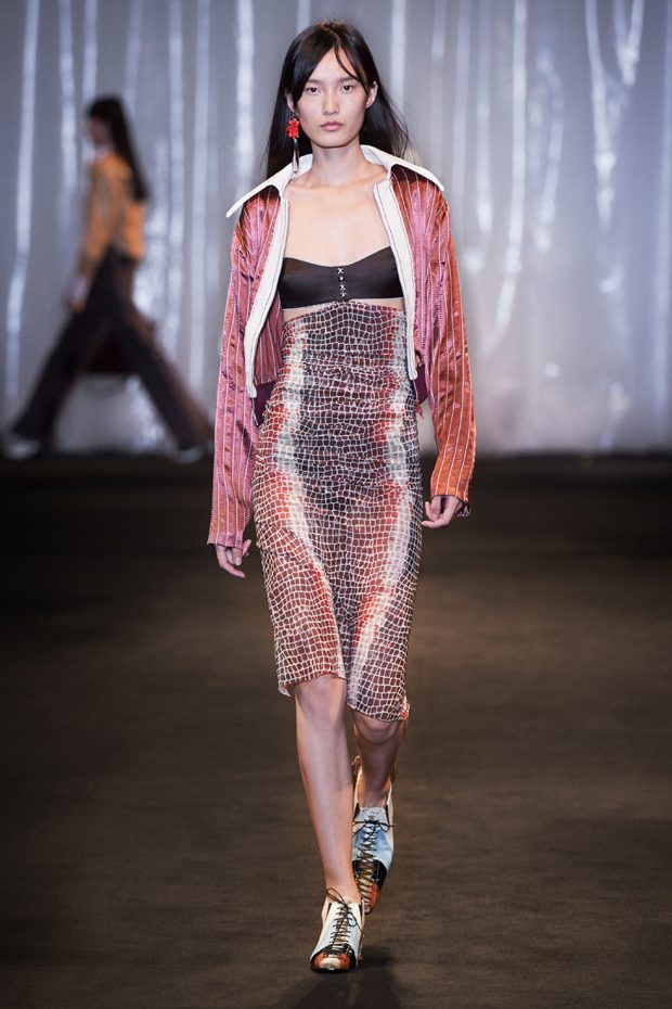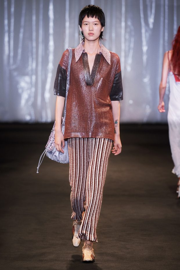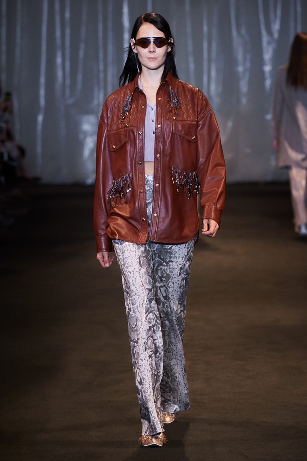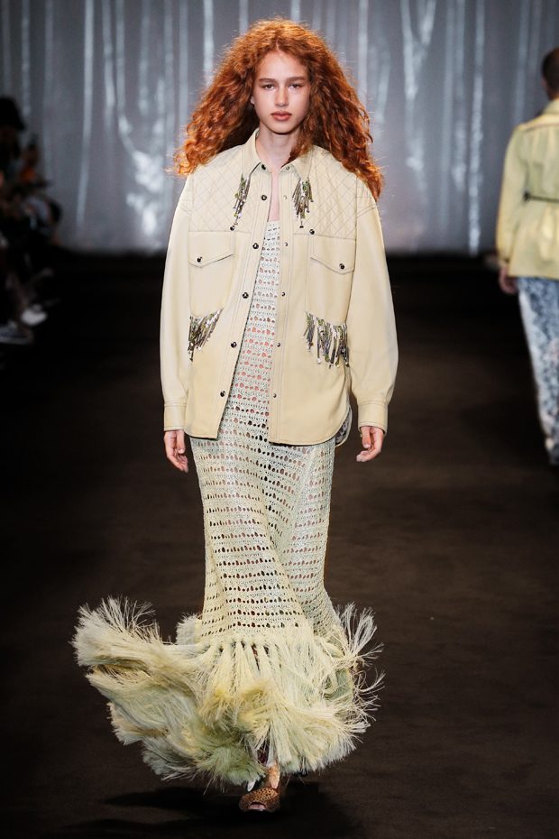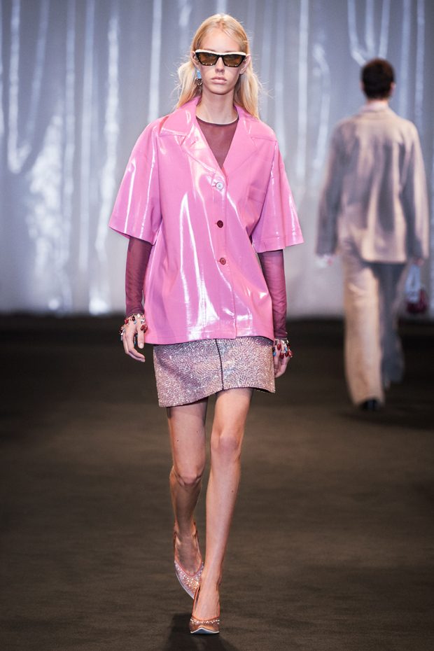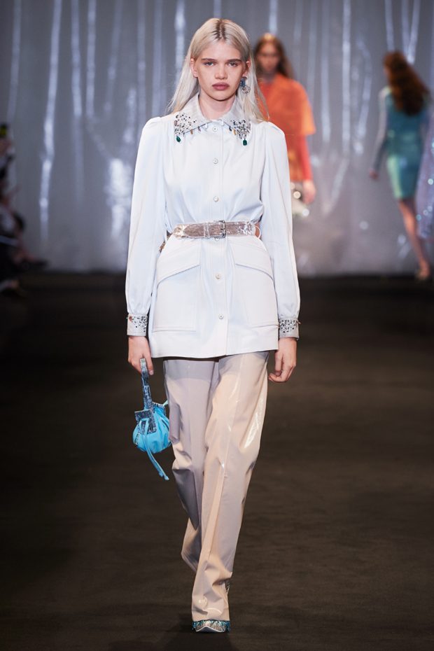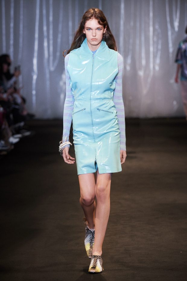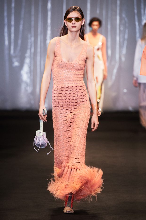 Acne Studios presents the spring summer 2018 collection at Paris Fashion Week. This season’s collection has a ‘70s groove/thrift store/acid vibe. The collection emphasizes separates; satin shorts, sheer tops and dresses, jackets, high waist trousers. Pastel colors filled the runway. Fabrics are treated and embellished, but seem simple. Looks that appear like plastic are actually jersey that has been treated with starch.
