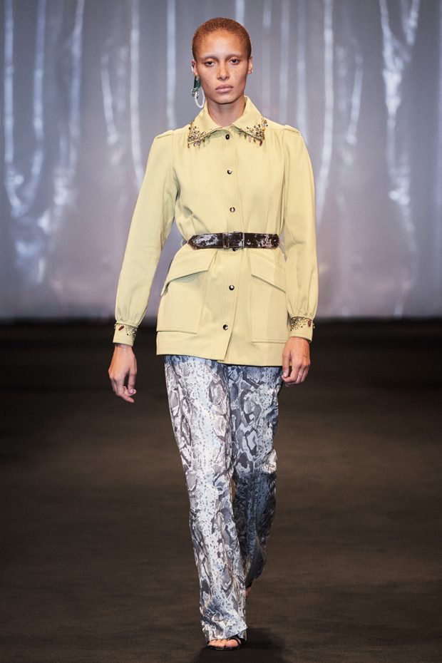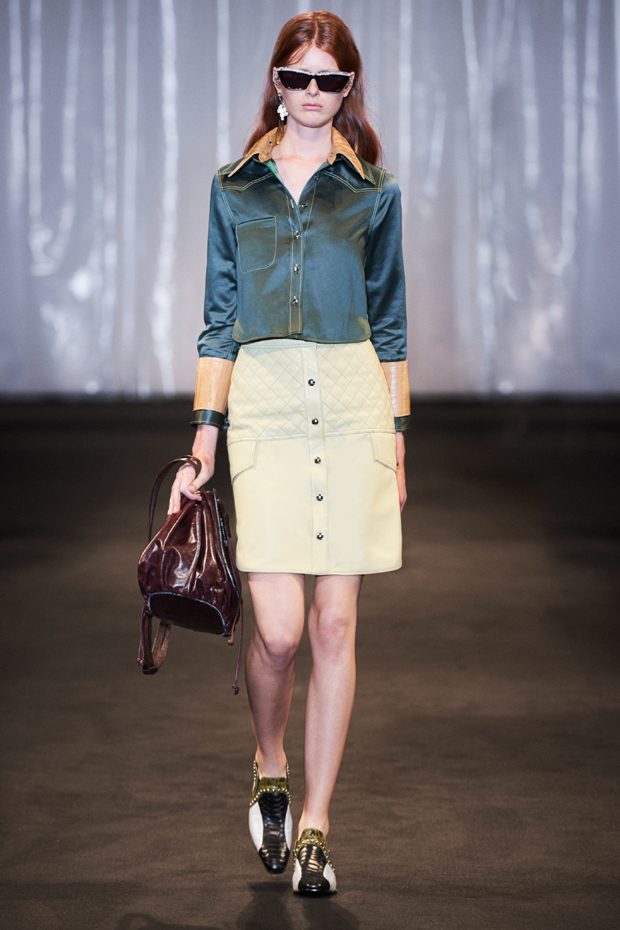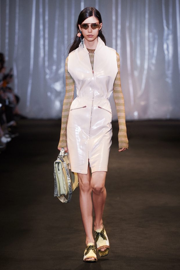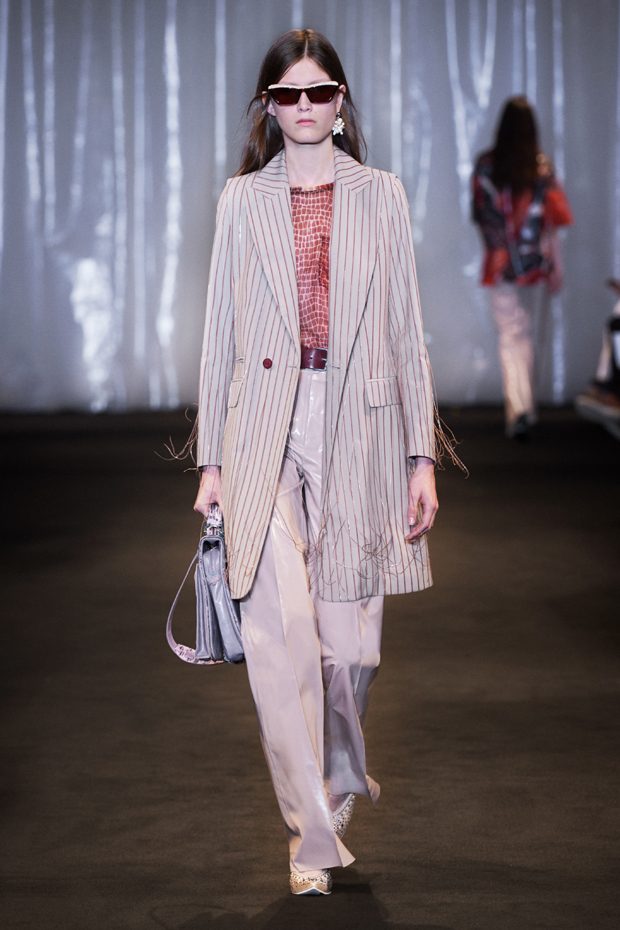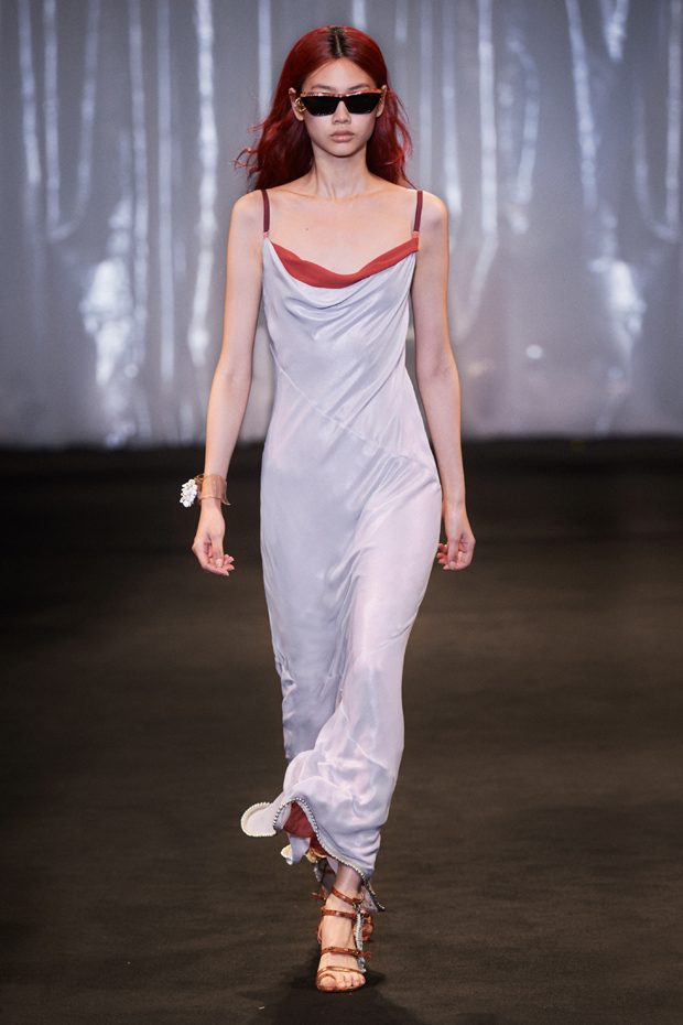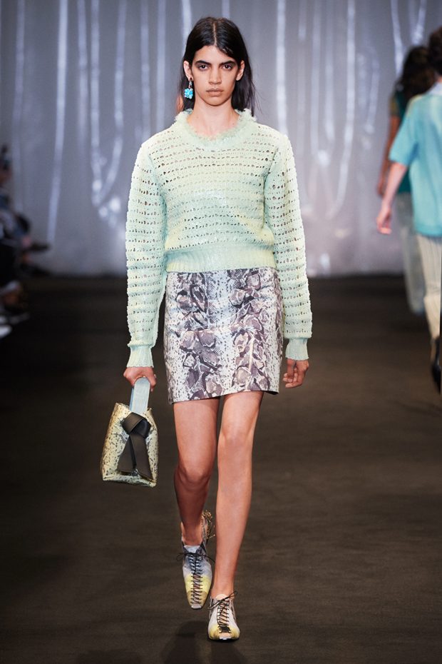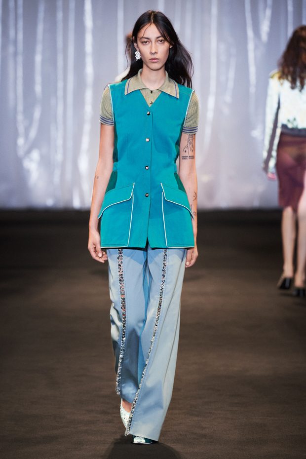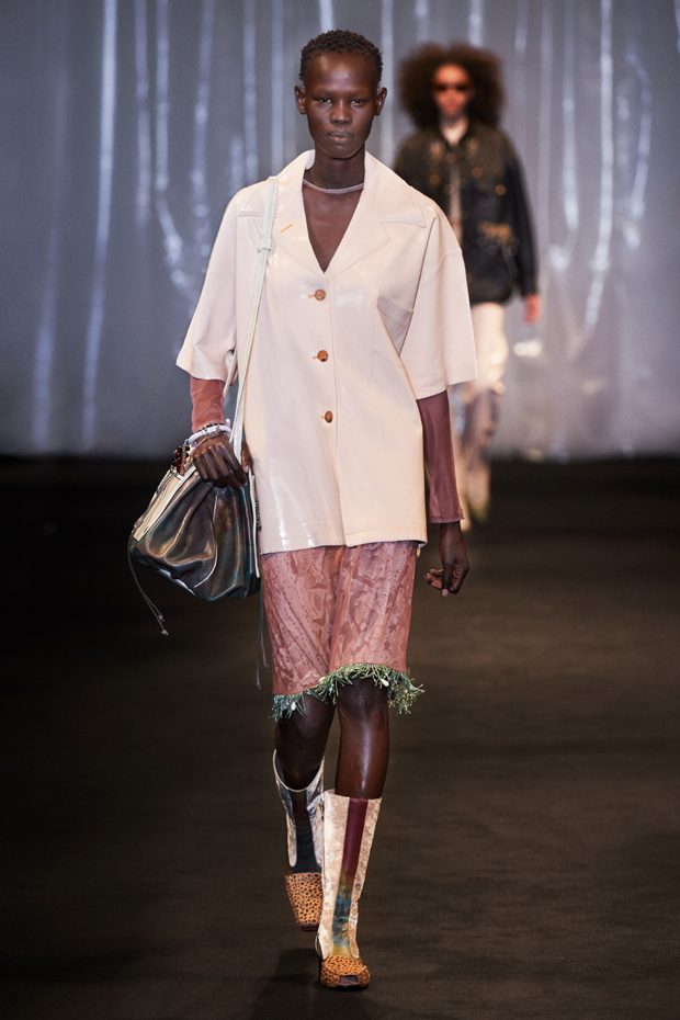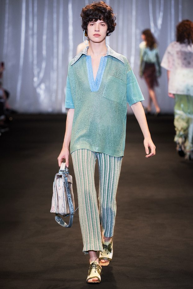 Acne Studios presents the spring summer 2018 collection at Paris Fashion Week. This season’s collection has a ‘70s groove/thrift store/acid vibe. The collection emphasizes separates; satin shorts, sheer tops and dresses, jackets, high waist trousers. Pastel colors filled the runway. Fabrics are treated and embellished, but seem simple. Looks that appear like plastic are actually jersey that has been treated with starch.