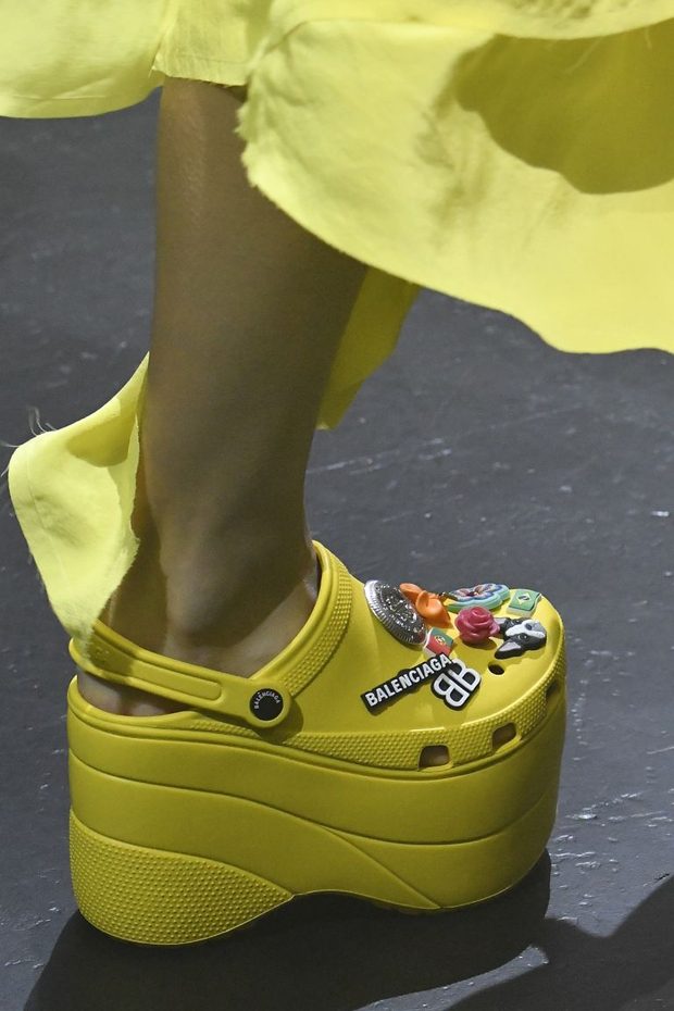 Balenciaga x Crocs collaboration debuted at Paris Fashion Week. Models walked down the runway this season wearing platform Crocs. Designer Demna Gvasalia combined luxury fashion and what most would consider being the ugliest (but no doubt comfortable) shoe. Gvasalia adds a four inch platform to the crocs clog and covers them with newly redesigned Balenciaga logos and other kitschy pins. ‘Foams’ as the shoe is called, will be available exclusively at Balenciaga worldwide and on the Balenciaga website from spring 2018. We’ll leave it up to you to decide whether this is a must-have shoe or a total fail.