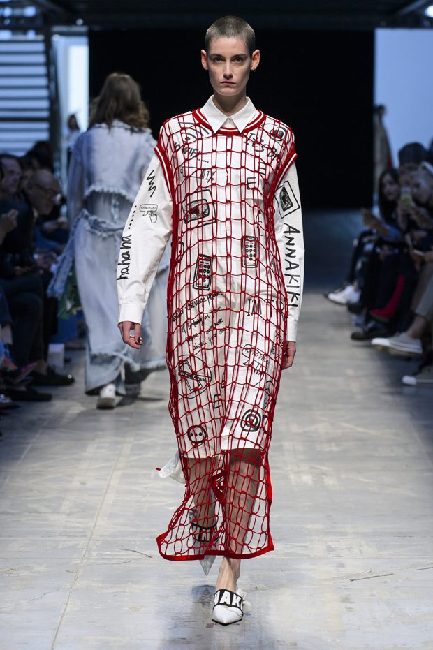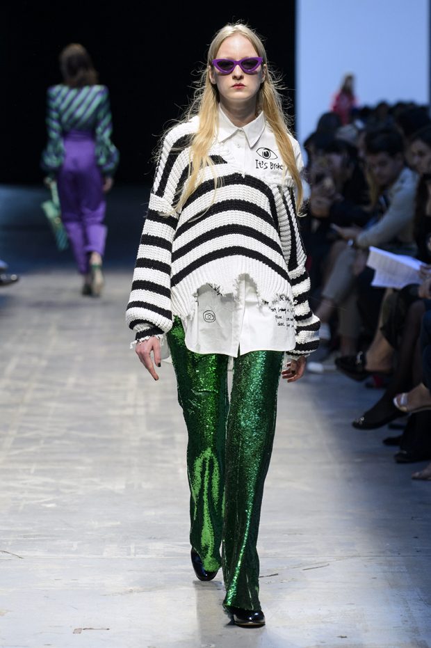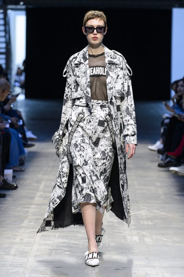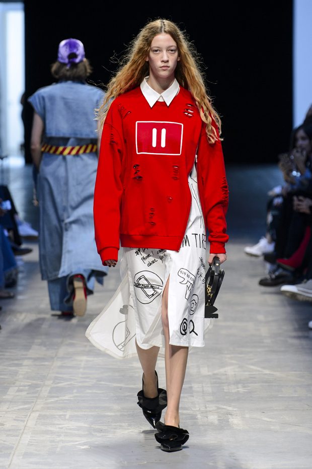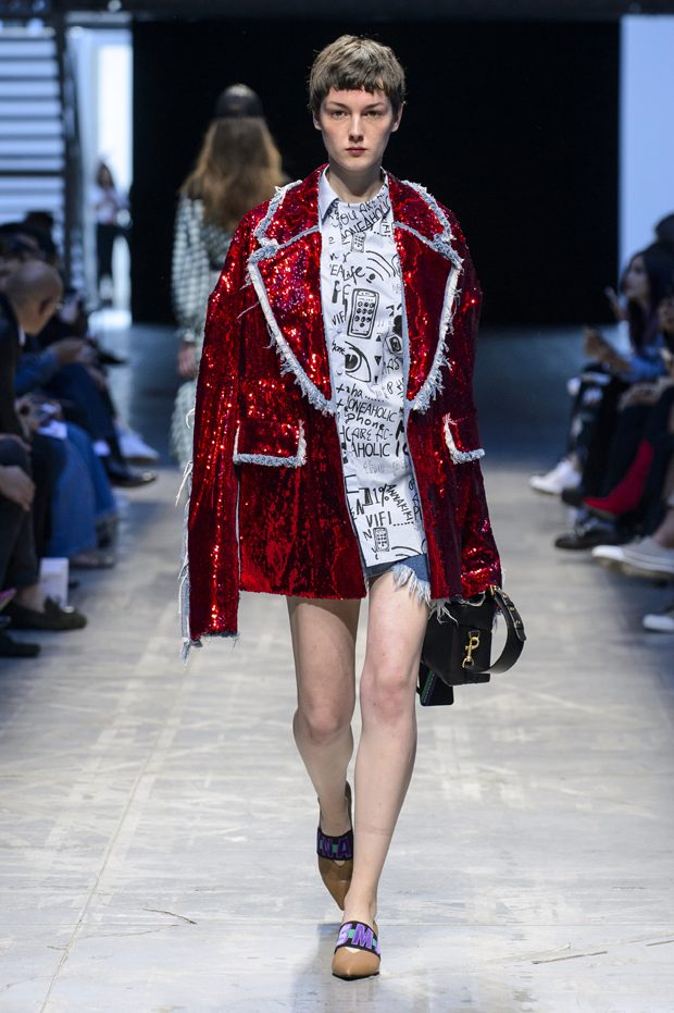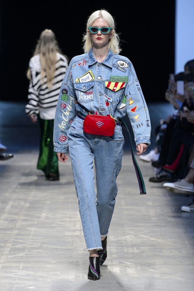 ‘On a mission to simplify our code of conduct, which is ultimately dictated by smartphones and social media, the designer has conceived an ultra provocative collection, which resonates with viewers as much in its conceptual implications as it does in its aesthetic form; a continuous interweaving of the two, in which each garment is both an expression of reality and an ironic admonishment to everyone who has unlearned the skill of observing it. The collection is rich with vintage iconographic references, yet perfectly capable of portraying contemporary society. Indeed, graffiti, applied slogans, and third millennium cyber pop culture images instantly transport the viewer into the current-day frenzy of phoneaholism.