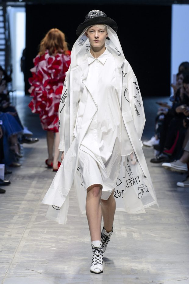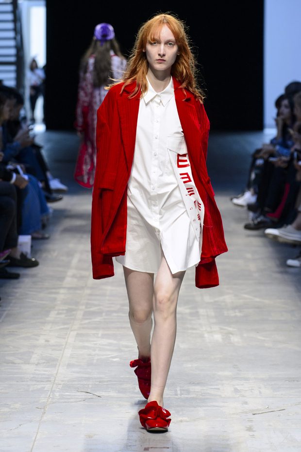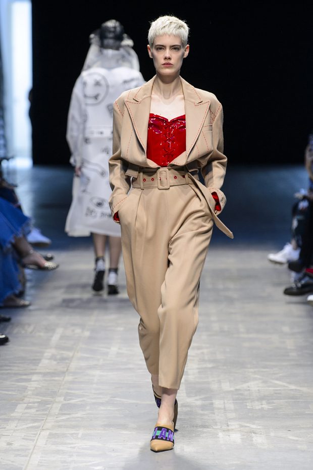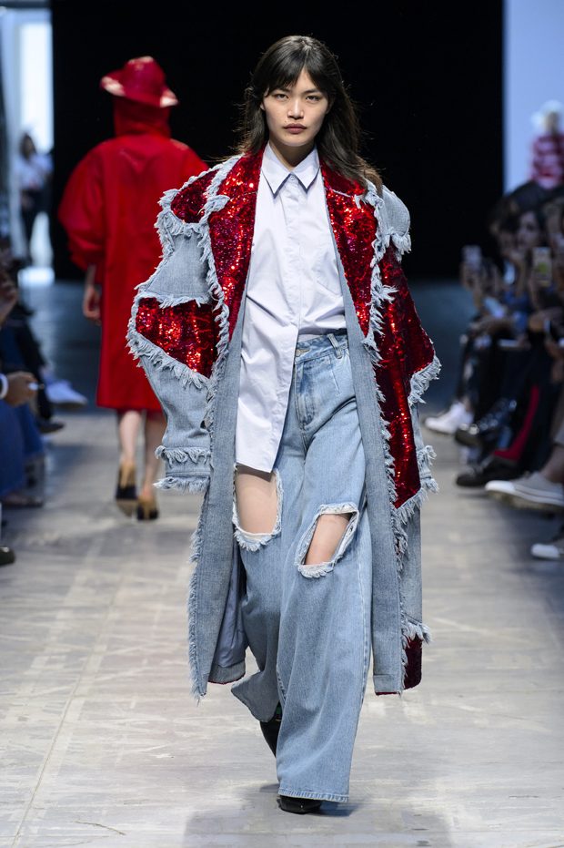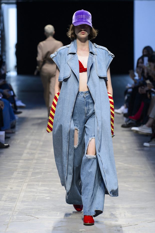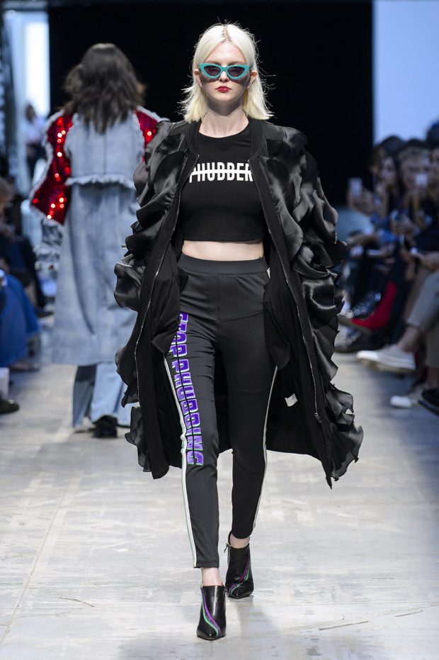 ‘On a mission to simplify our code of conduct, which is ultimately dictated by smartphones and social media, the designer has conceived an ultra provocative collection, which resonates with viewers as much in its conceptual implications as it does in its aesthetic form; a continuous interweaving of the two, in which each garment is both an expression of reality and an ironic admonishment to everyone who has unlearned the skill of observing it. The collection is rich with vintage iconographic references, yet perfectly capable of portraying contemporary society. Indeed, graffiti, applied slogans, and third millennium cyber pop culture images instantly transport the viewer into the current-day frenzy of phoneaholism.
