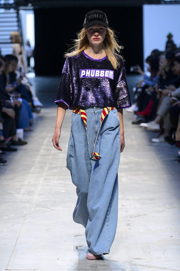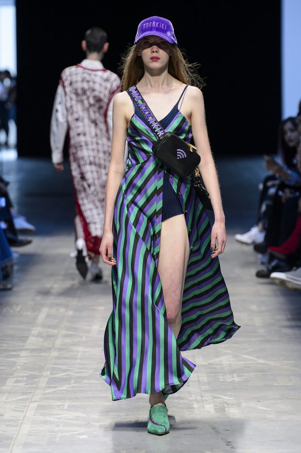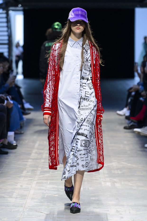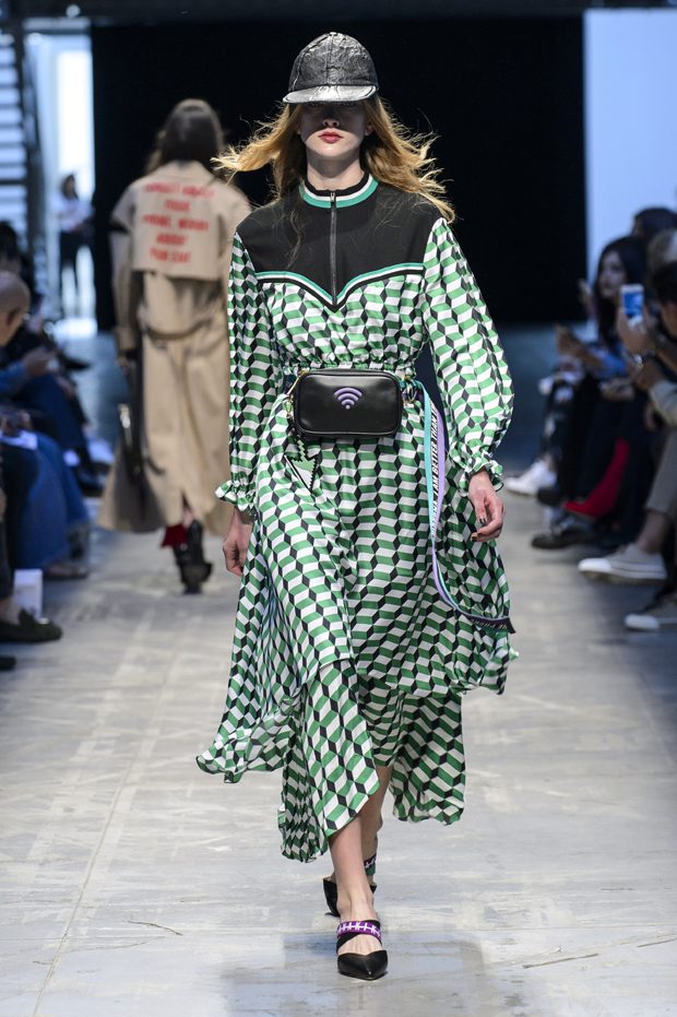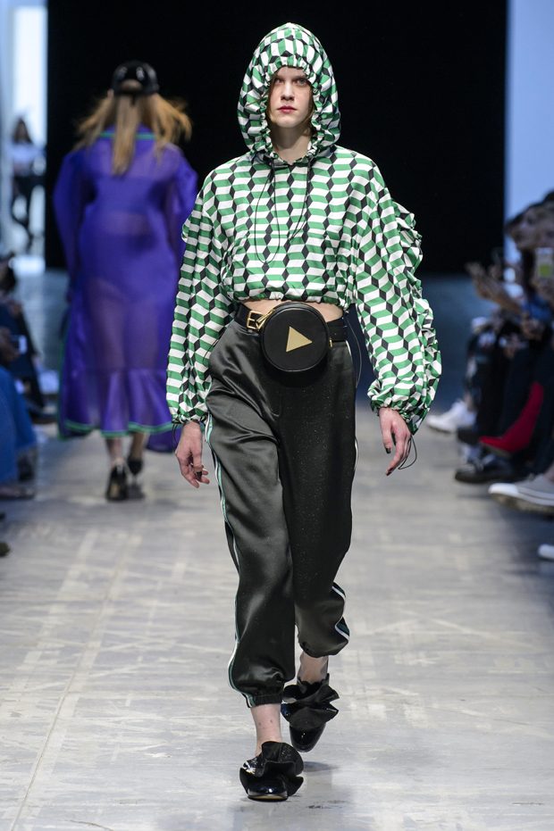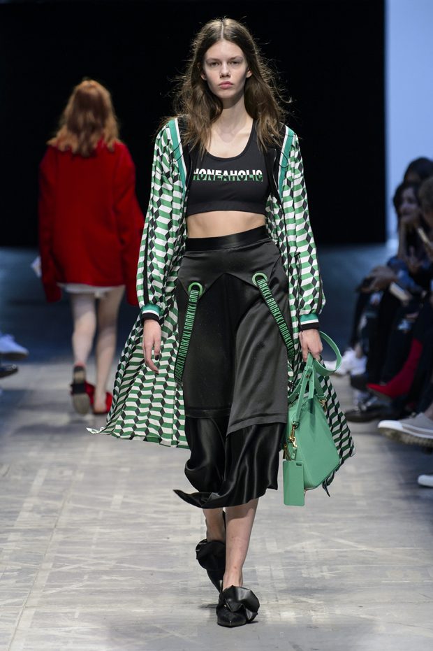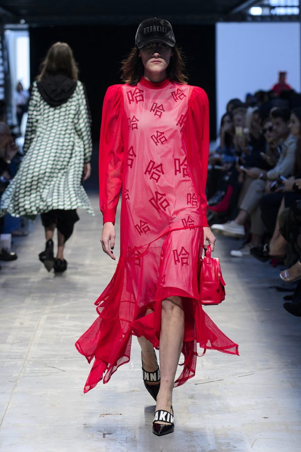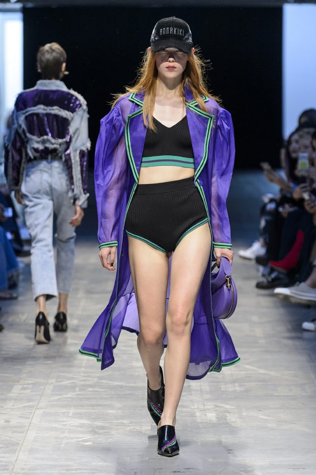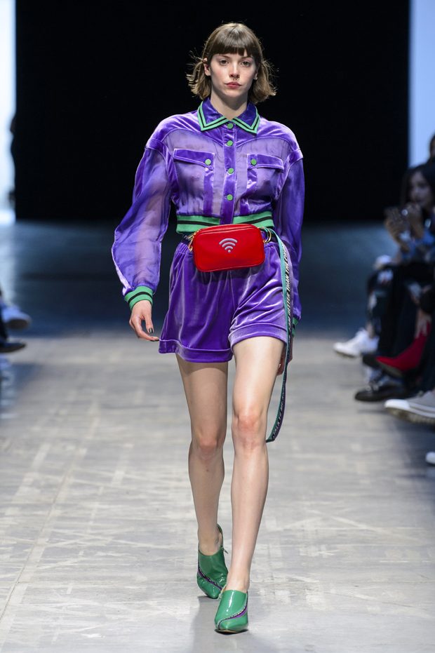 Annakiki presents the spring summer 2018 collection at Milan Fashion Week. The theme behind the collection is ‘Phoneaholism’- A cell phone notification, followed by another, and then another. A rhythmic and persistent beat; the new frequency of our entire life system. Transforming a tool that is merely useful into something that is indispensable. The collection has an ‘80s vibe, elevated with bold colors, asymmetry, and transparency. An accessories line that includes shoes, bags, and caps completes the collection.