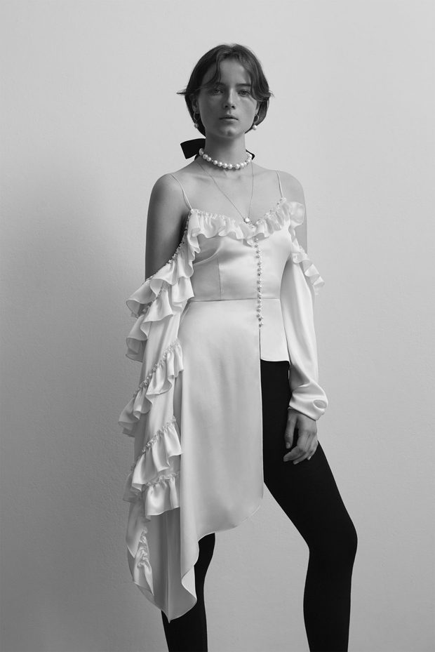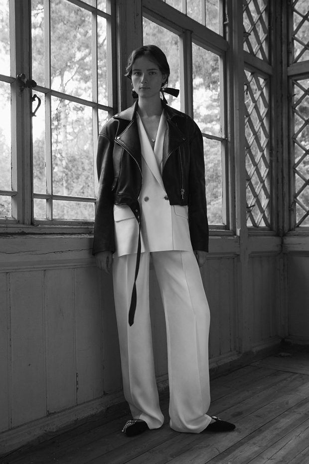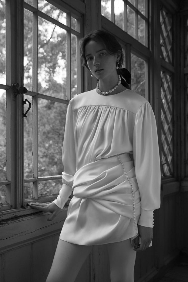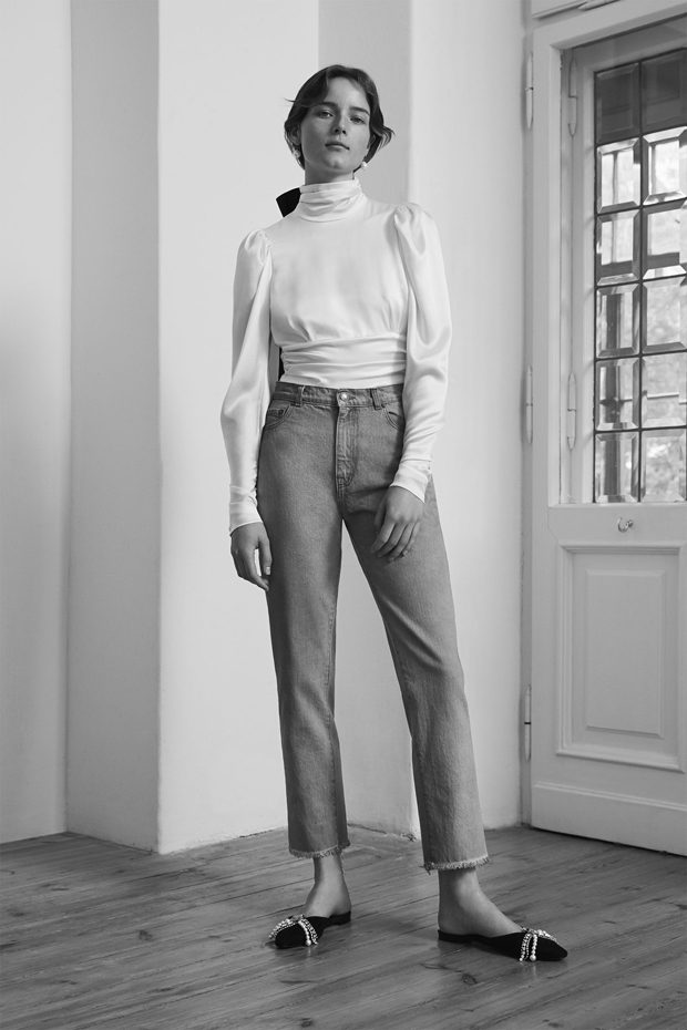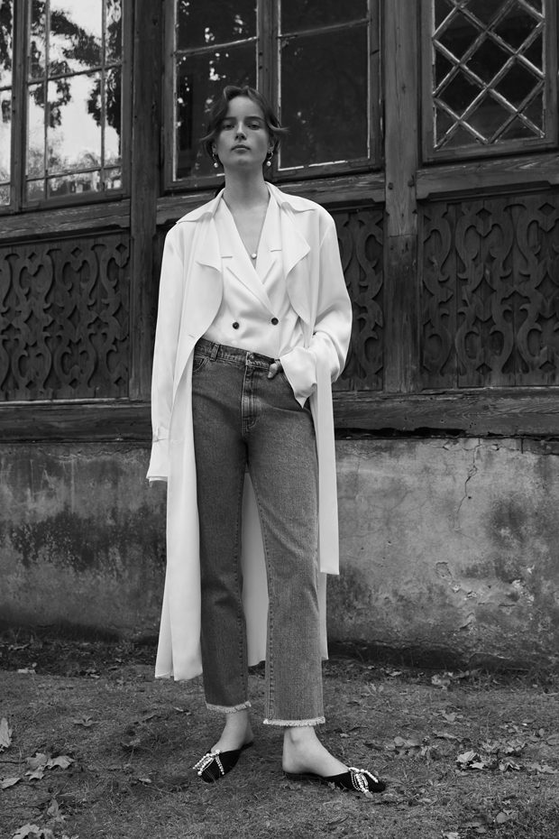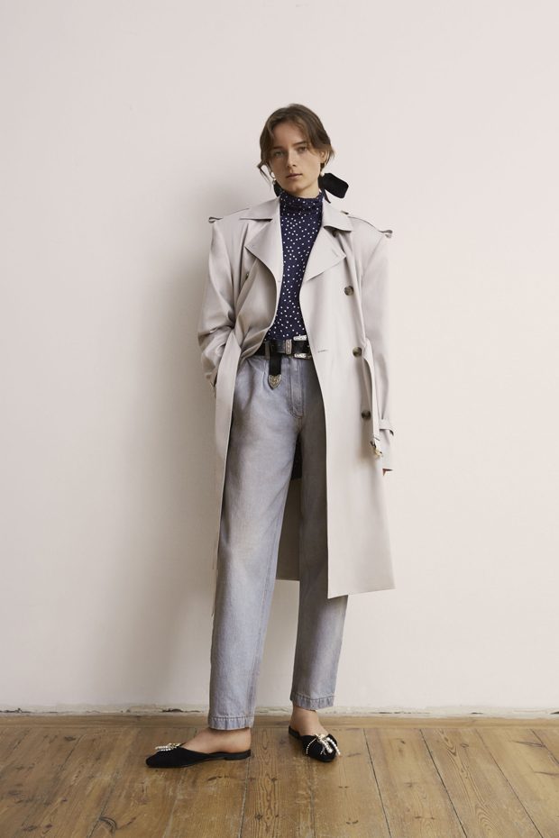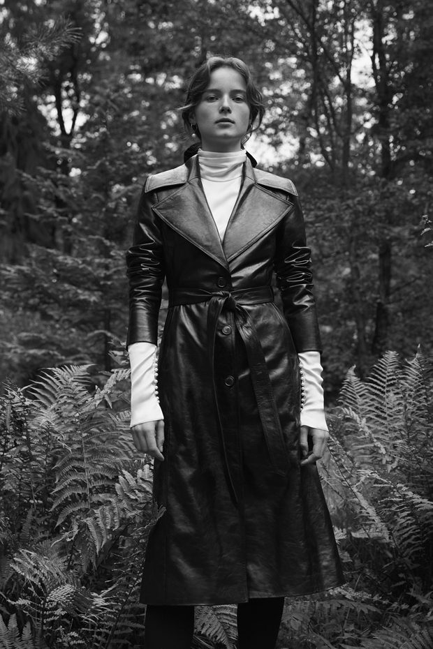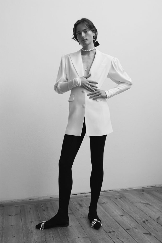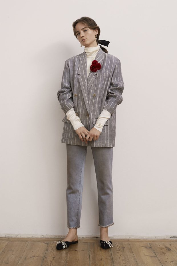 “The collection sees Magda perfectly encapsulate the feel and mood of the classic era with the nonchalance of the 80s. Everyday designs in exaggerated proportions are elevated with timeless tailoring and clean cuts; the classic trench coat is deconstructed, silk blazers and large sleeved leather jackets are cropped and oversized, with dropped shoulders for added air of insouciance. Statement sleeves in silk, effortlessly play against the eighties Working Girl aesthetic of wide drop shoulders and high waist raw denim.”
