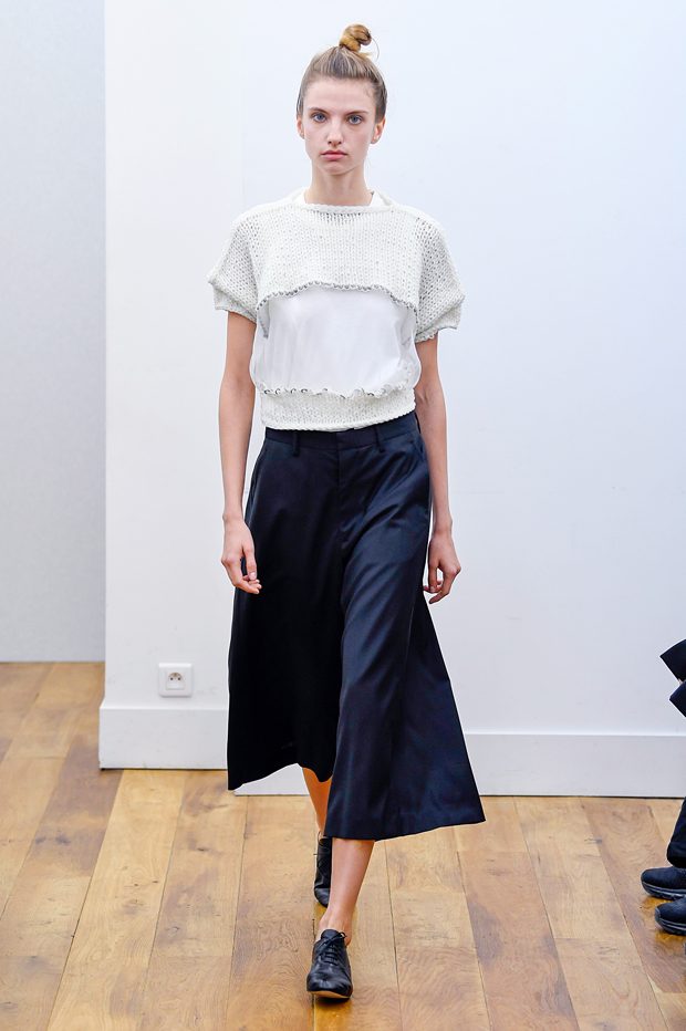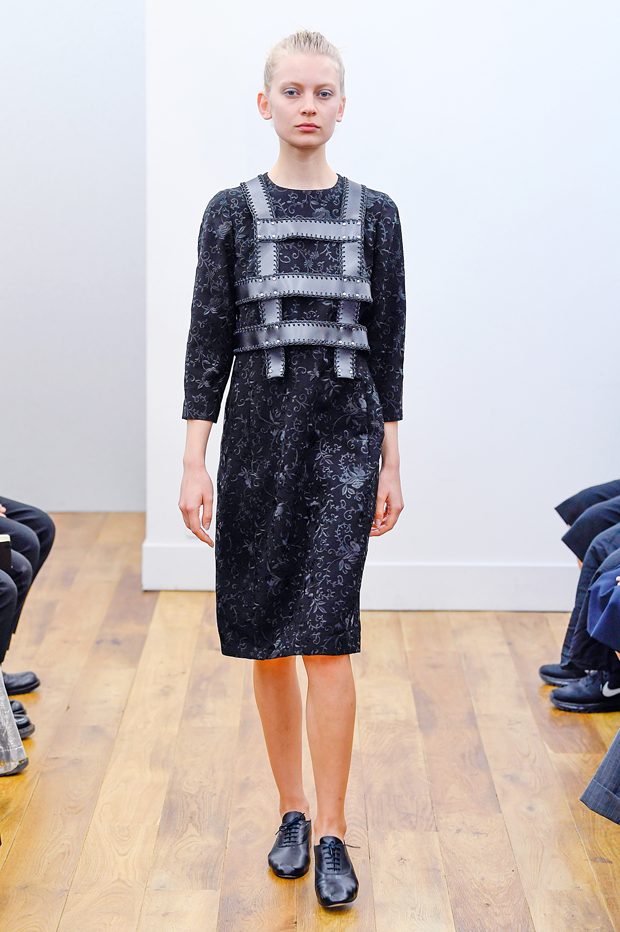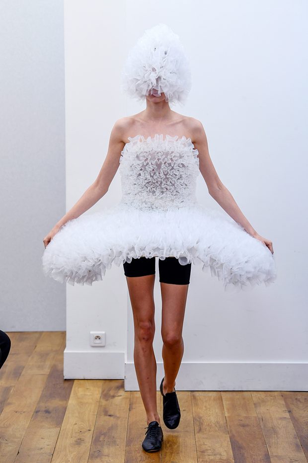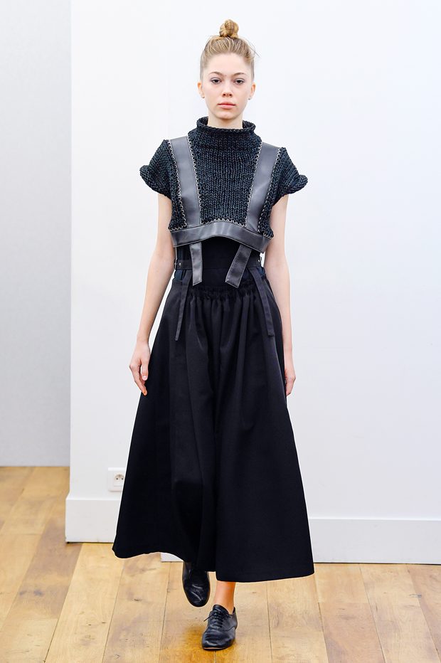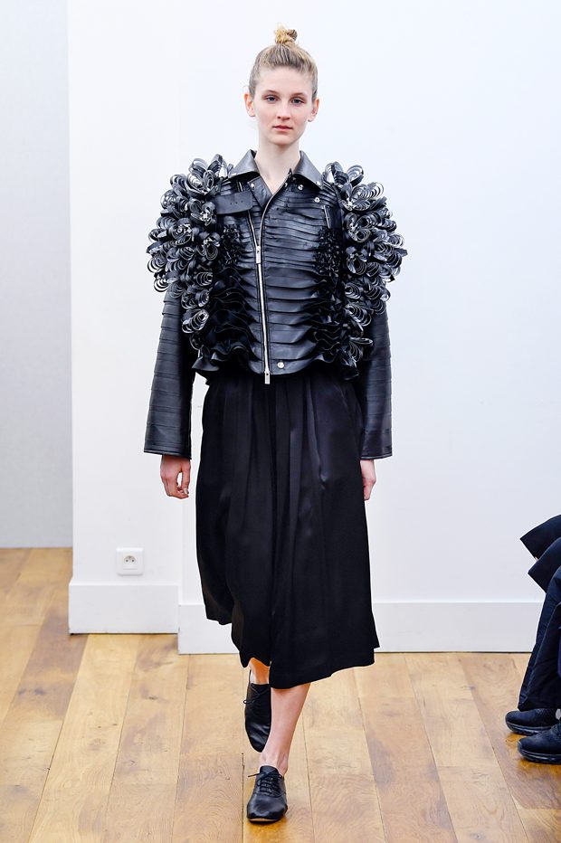 Noir Kei Ninomiya presents the spring summer 2018 collection at Paris Fashion Week. The collection consists of long black dresses, biker jackets in transparent mesh, and knits created by threading yarn through eyelets on a leather structure before knitting. Kei Ninomiya used black thread, drawing the outline of a jacket. Navy is also a prime color in the collection, while the color white is more a space than a color, as the designer had said. The garments had volume; voluminous sleeves on dresses made of tulle.