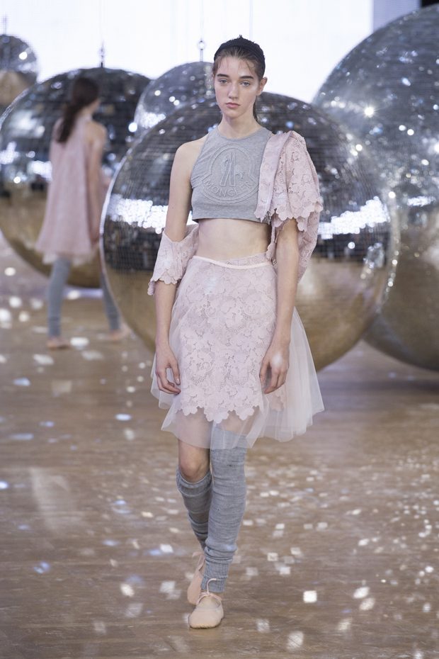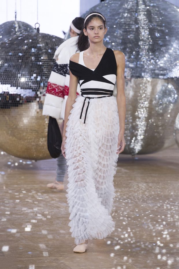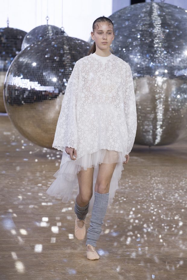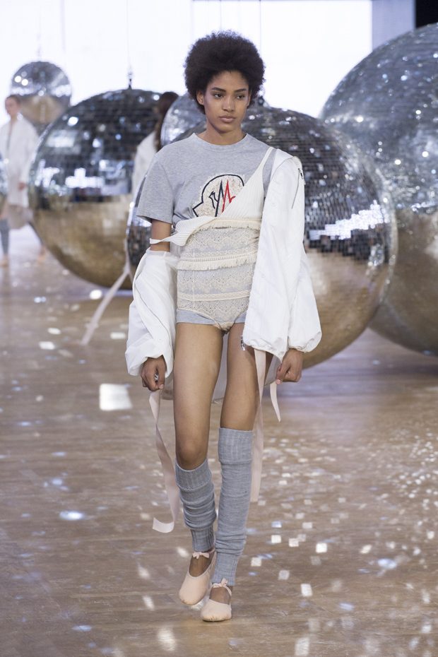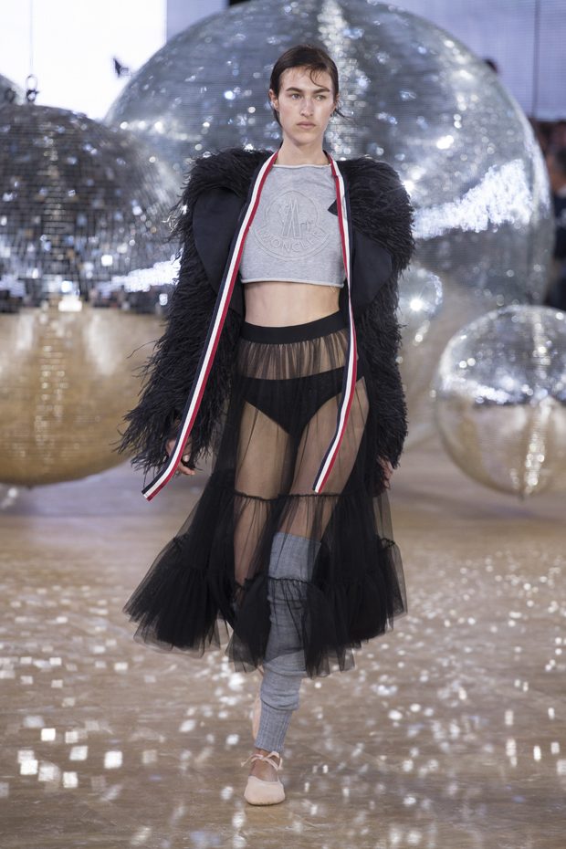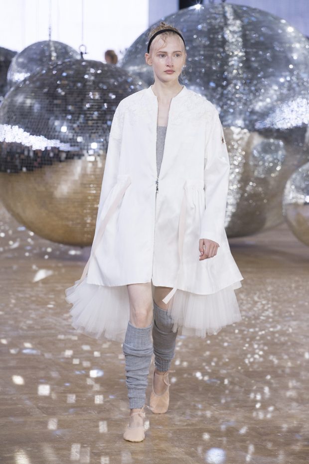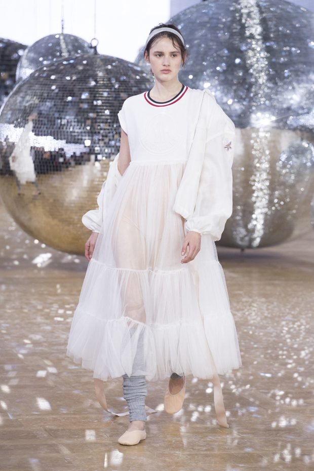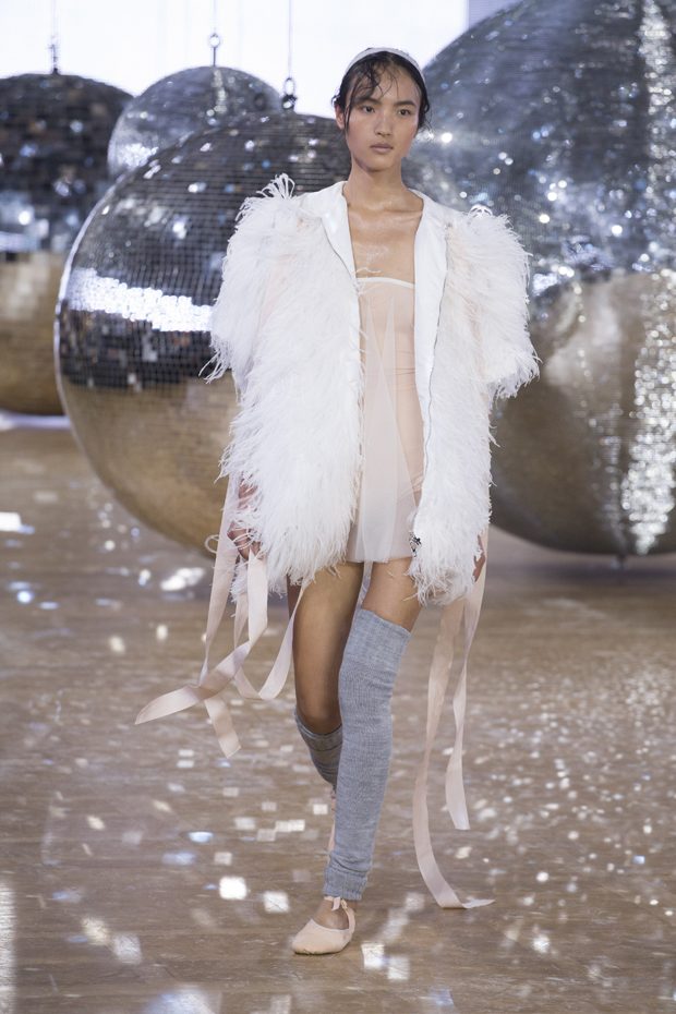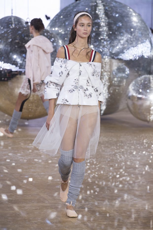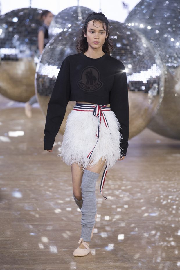 Moncler Gamme Rouge presents the women’s spring summer 2018 collection at Paris Fashion Week. The show was opened with hip hop ballerinas from Chicago’s Creative Media & Digital Culture Program, followed by models wearing designs inspired by contemporary dance. Sheer skirts, feathered skirts, ruffles, and legwarmers were paired with ballet shoes. Red, black and navy broke up the neutral color palette that was consistent throughout the collection.