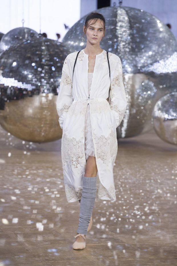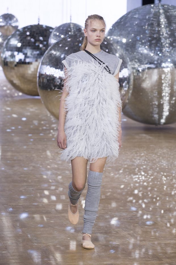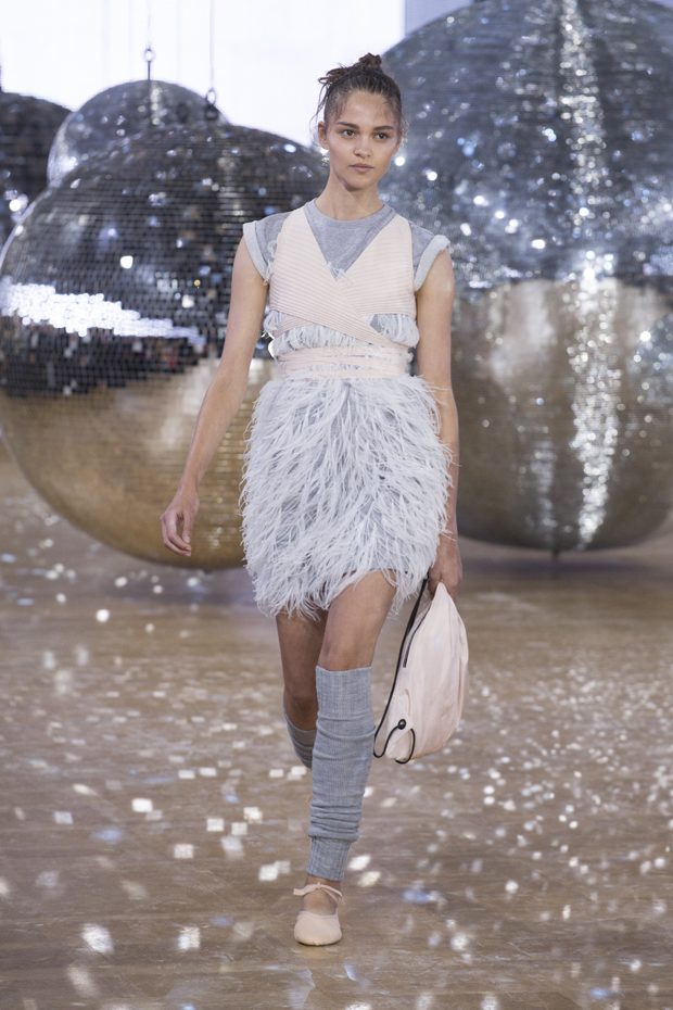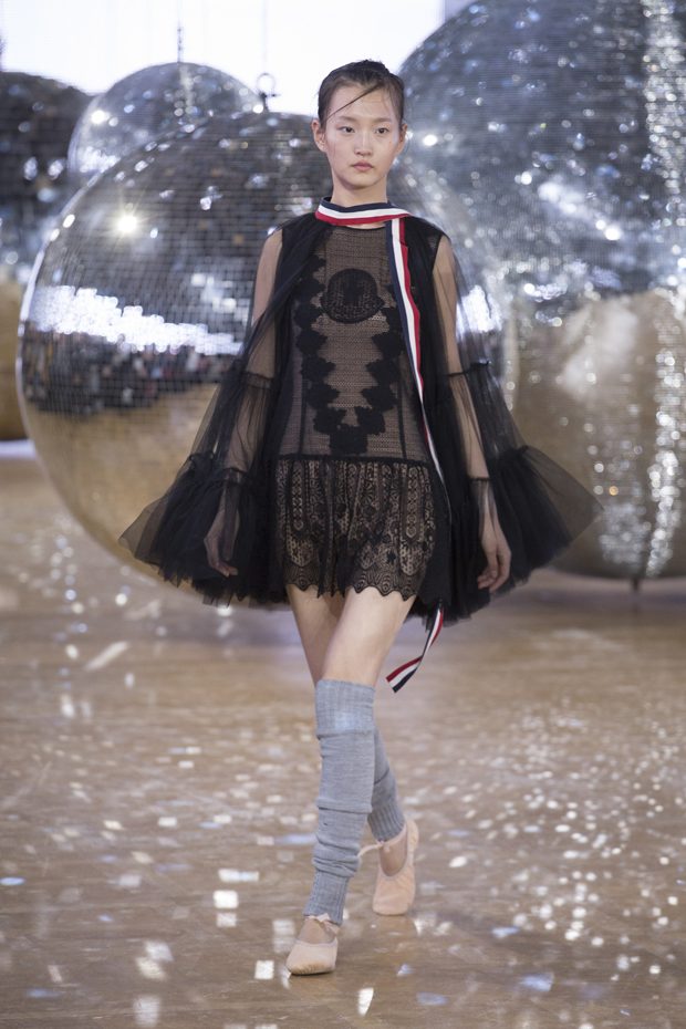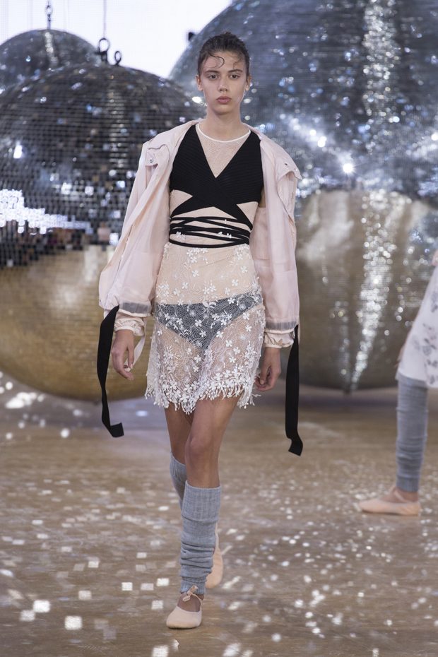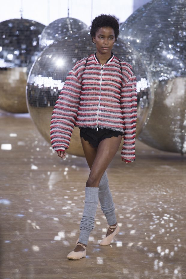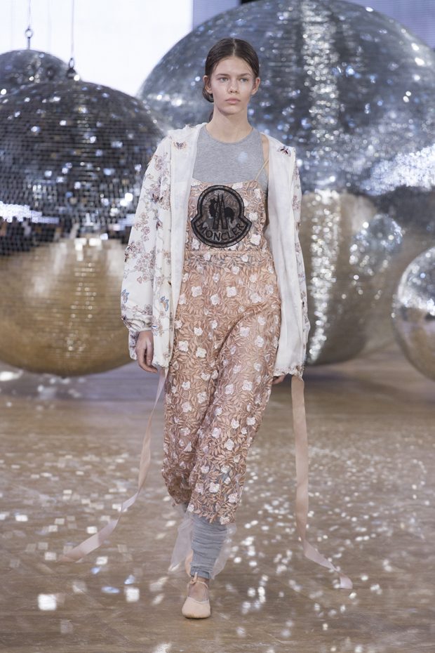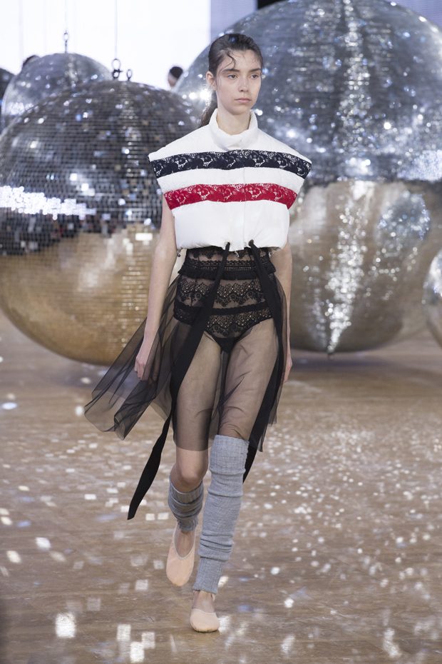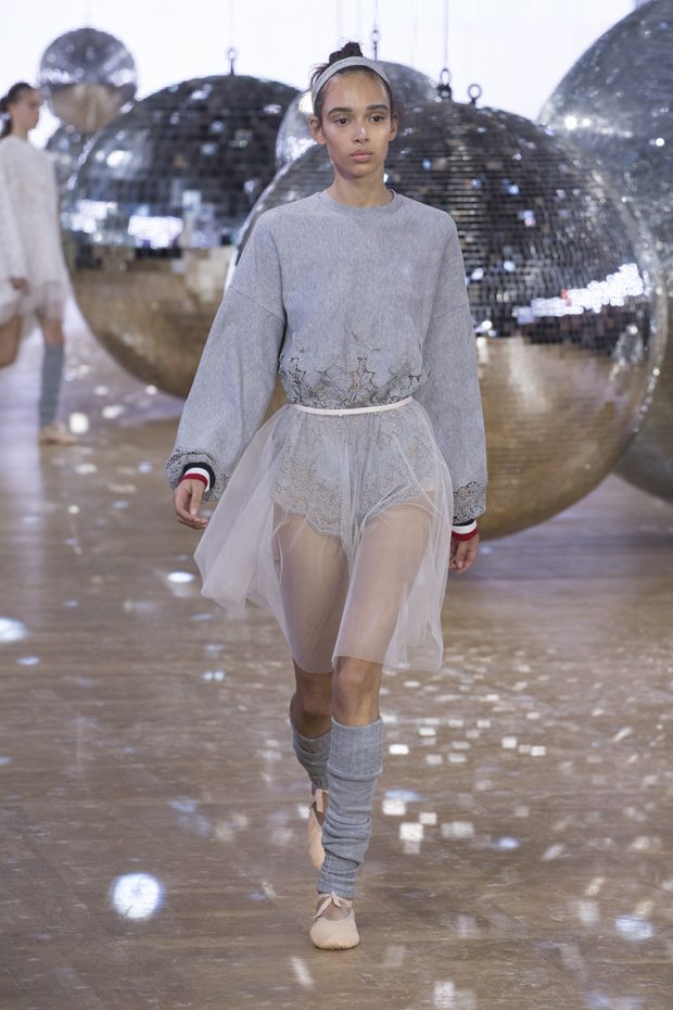Moncler Gamme Rouge presents the women’s spring summer 2018 collection at Paris Fashion Week. The show was opened with hip hop ballerinas from Chicago’s Creative Media & Digital Culture Program, followed by models wearing designs inspired by contemporary dance. Sheer skirts, feathered skirts, ruffles, and legwarmers were paired with ballet shoes. Red, black and navy broke up the neutral color palette that was consistent throughout the collection.