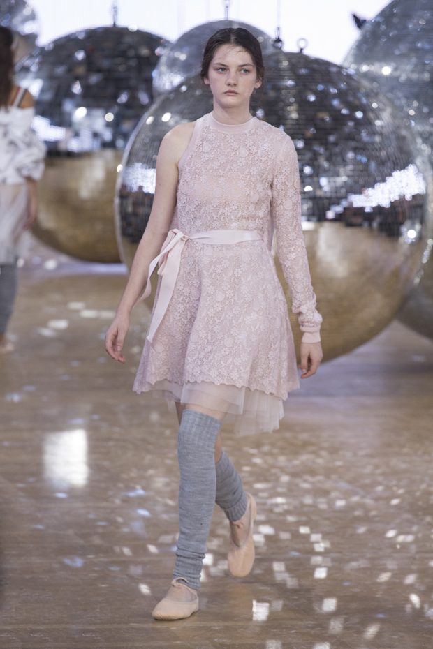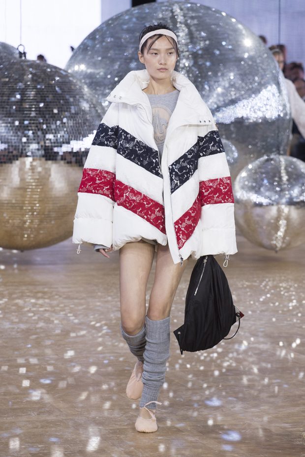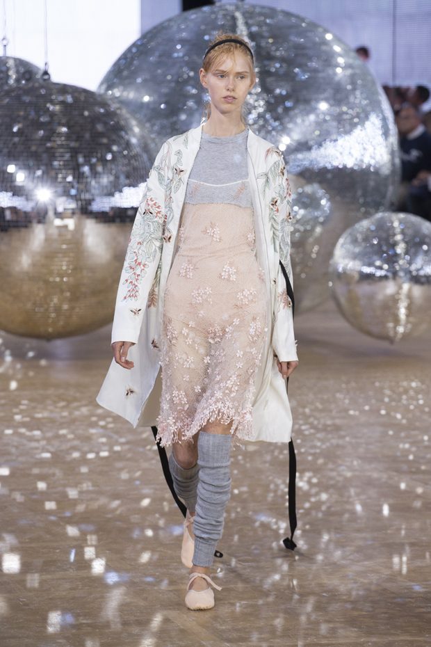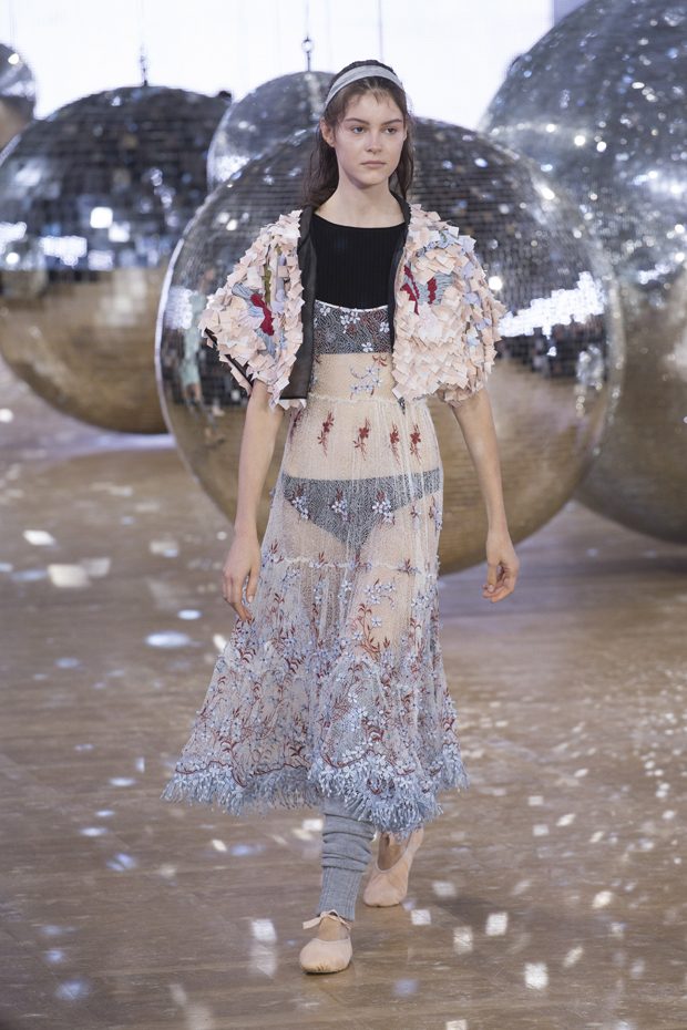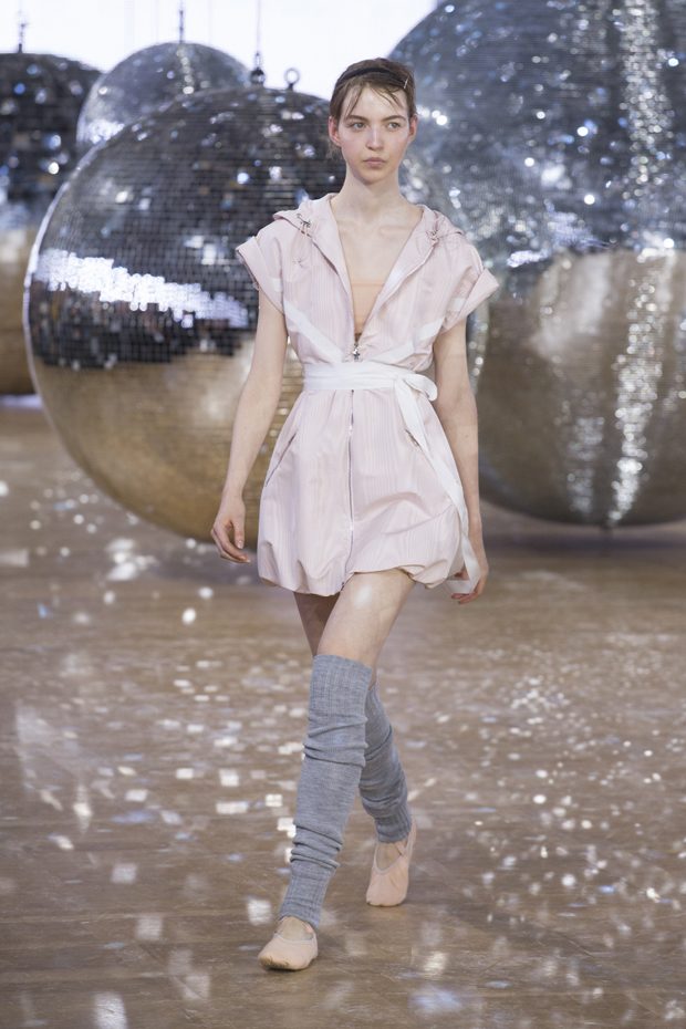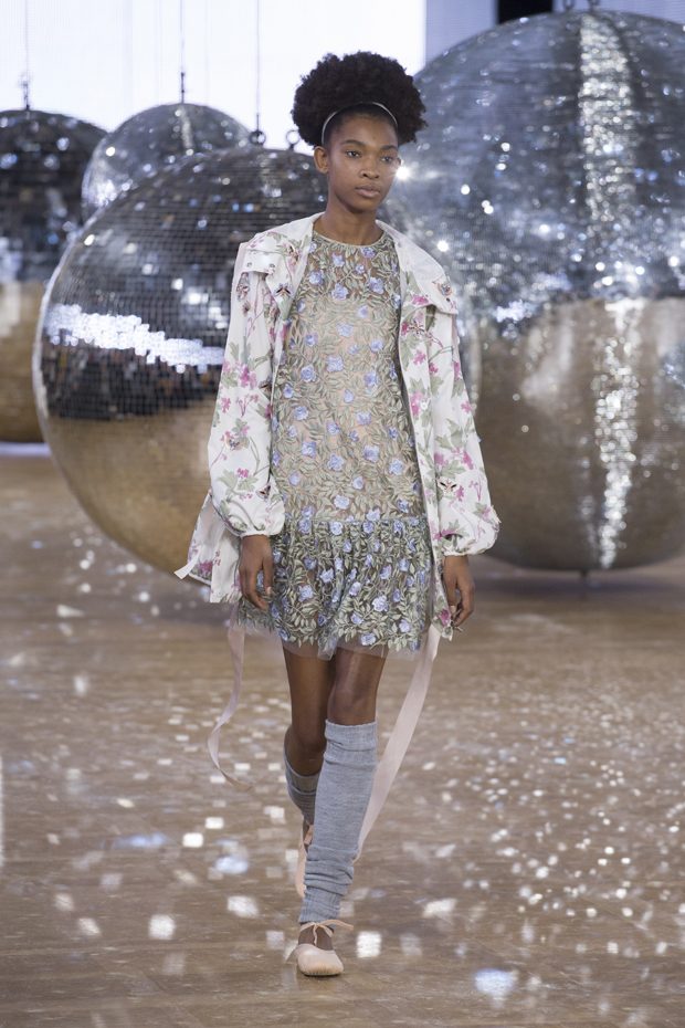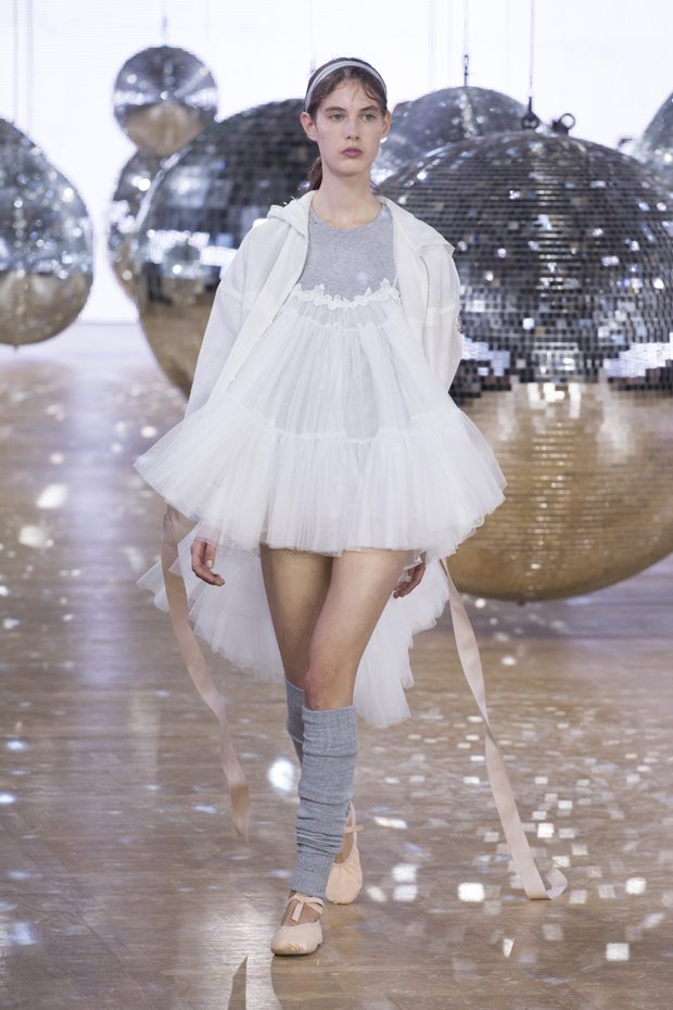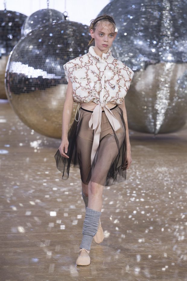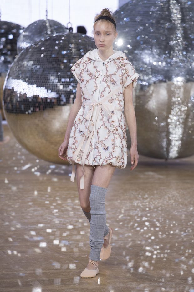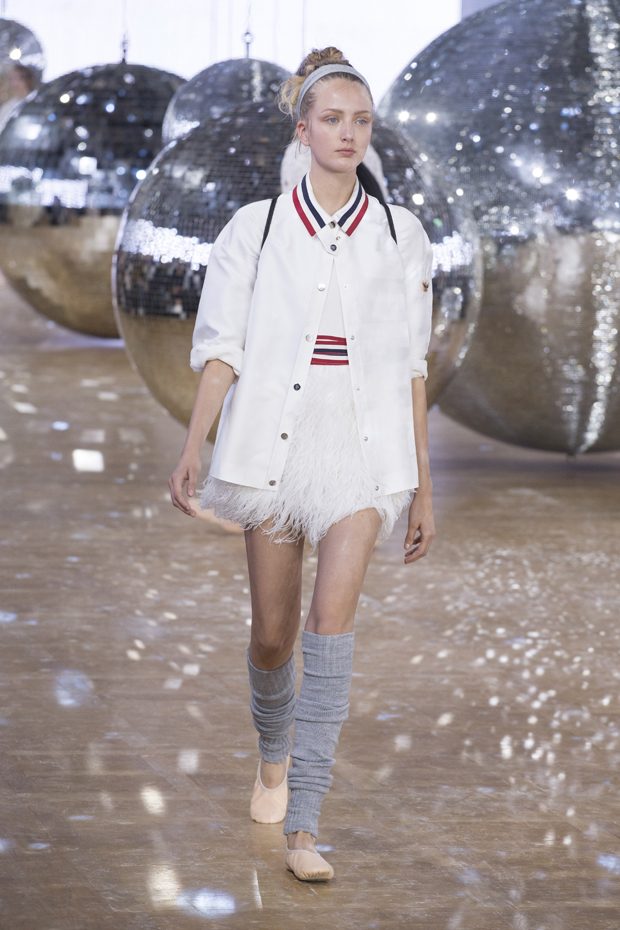 Moncler Gamme Rouge presents the women’s spring summer 2018 collection at Paris Fashion Week. The show was opened with hip hop ballerinas from Chicago’s Creative Media & Digital Culture Program, followed by models wearing designs inspired by contemporary dance. Sheer skirts, feathered skirts, ruffles, and legwarmers were paired with ballet shoes. Red, black and navy broke up the neutral color palette that was consistent throughout the collection.