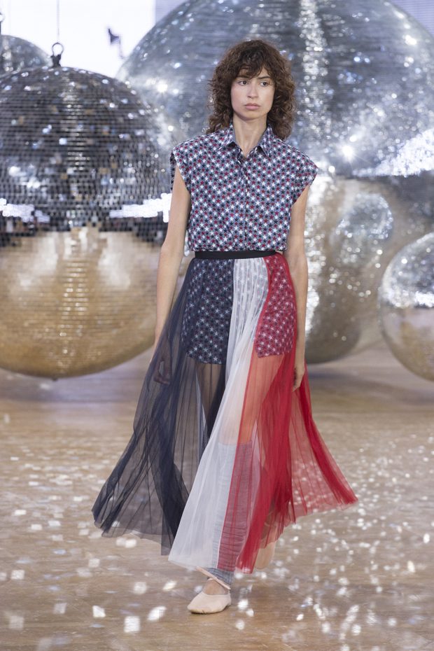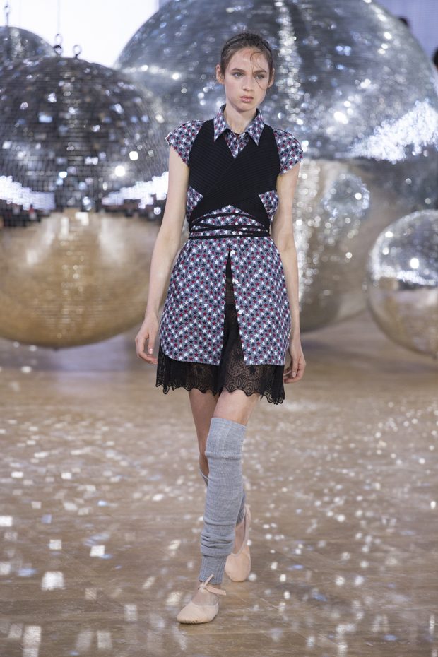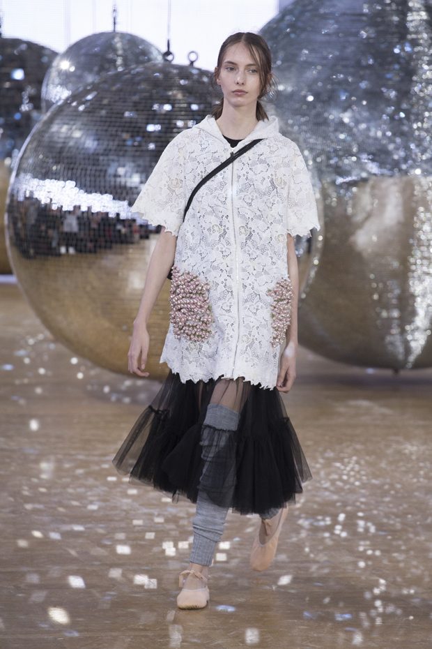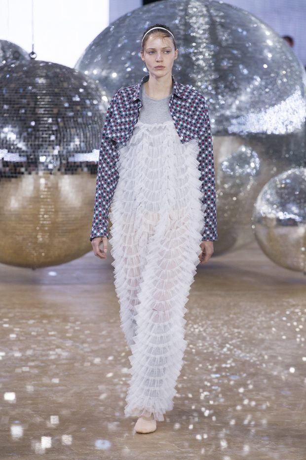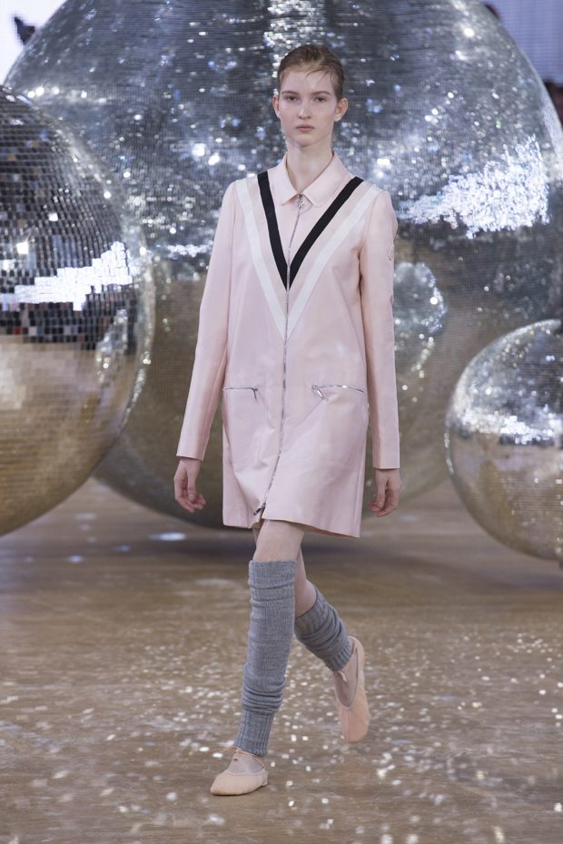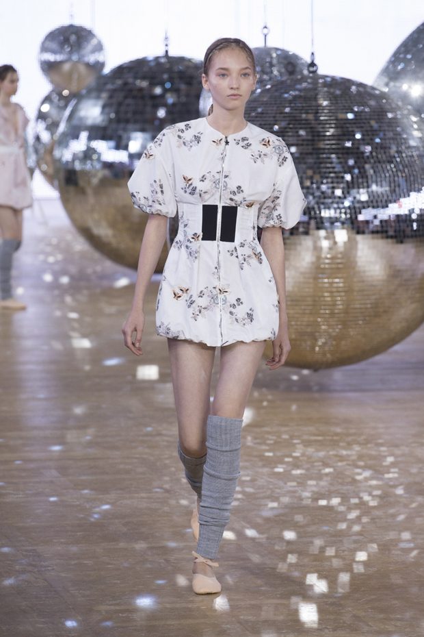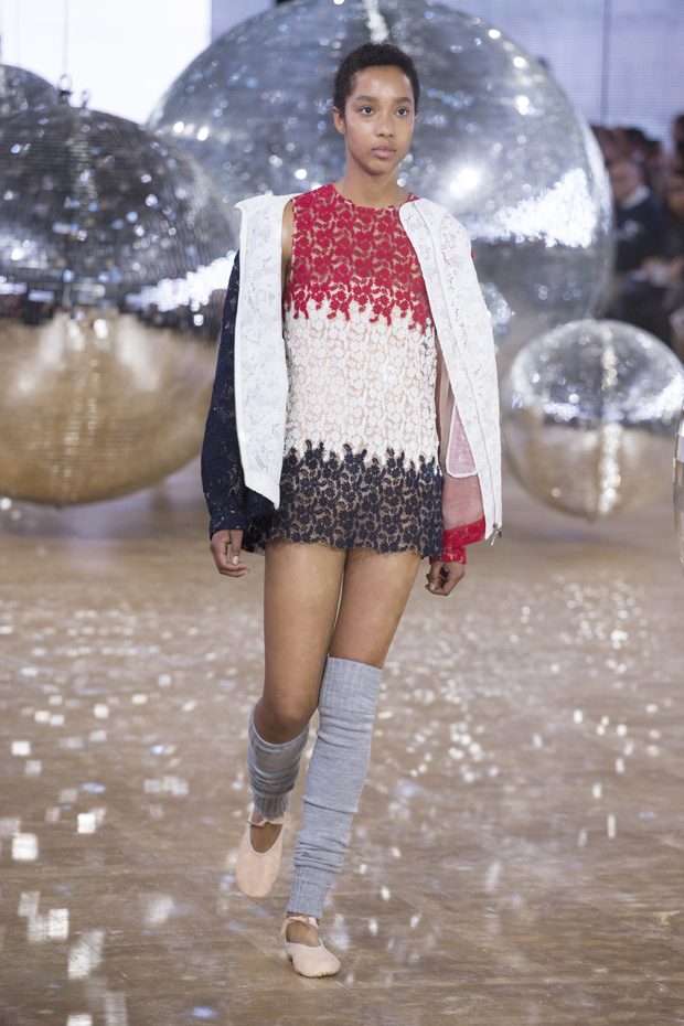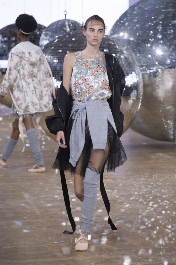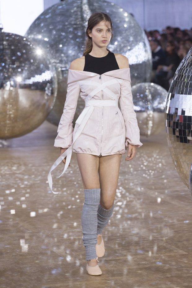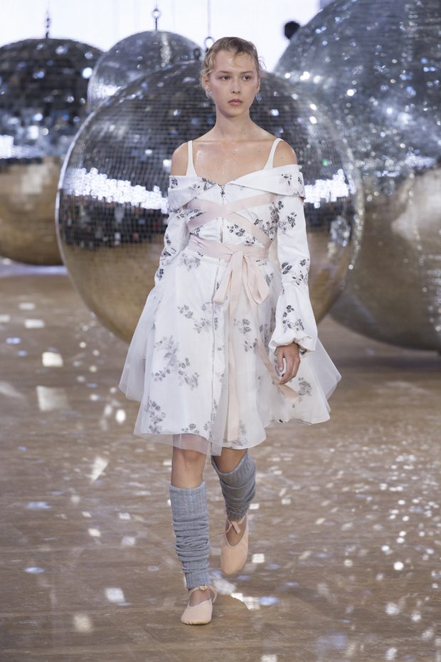Moncler Gamme Rouge presents the women’s spring summer 2018 collection at Paris Fashion Week. The show was opened with hip hop ballerinas from Chicago’s Creative Media & Digital Culture Program, followed by models wearing designs inspired by contemporary dance. Sheer skirts, feathered skirts, ruffles, and legwarmers were paired with ballet shoes. Red, black and navy broke up the neutral color palette that was consistent throughout the collection.