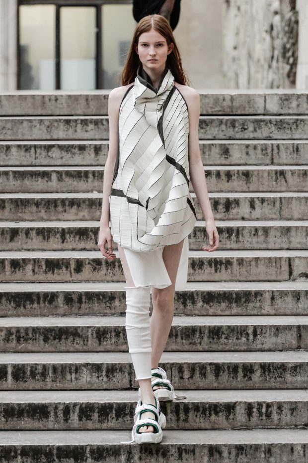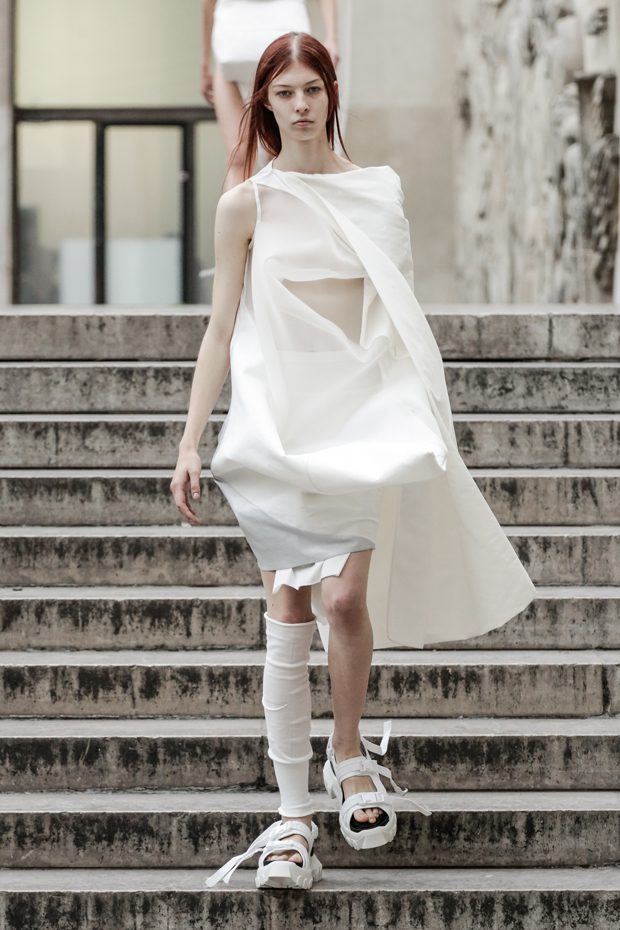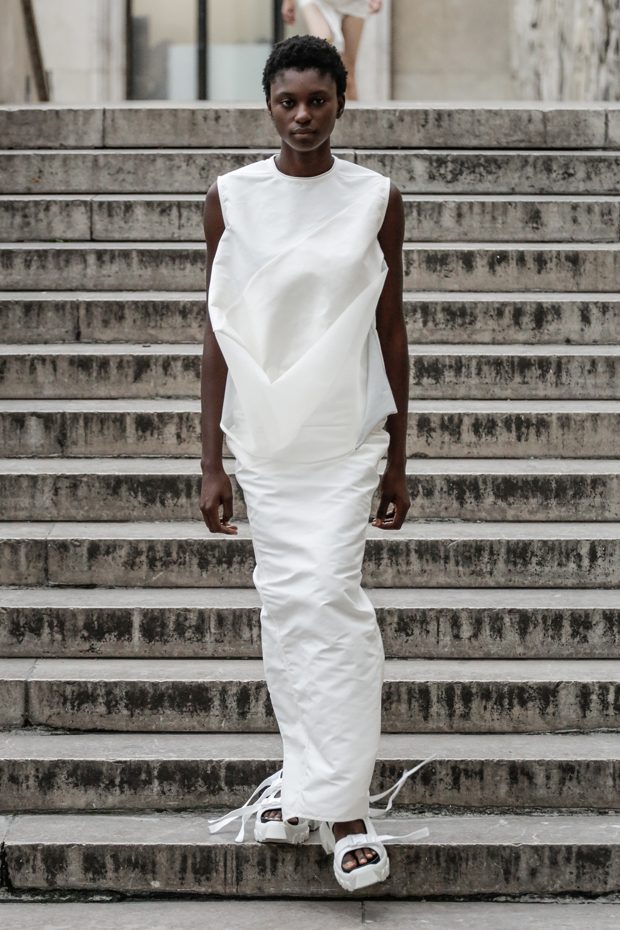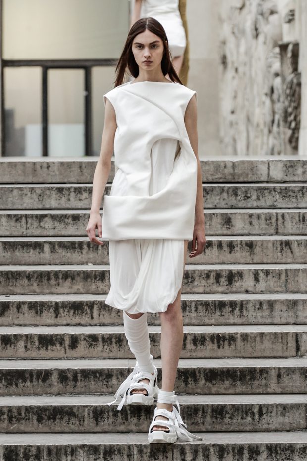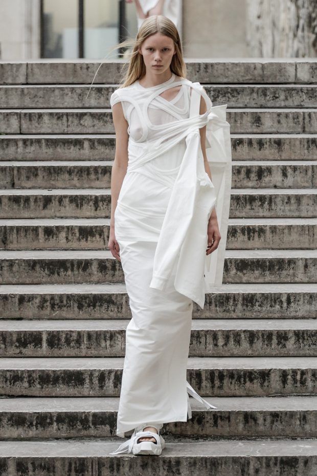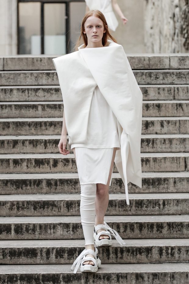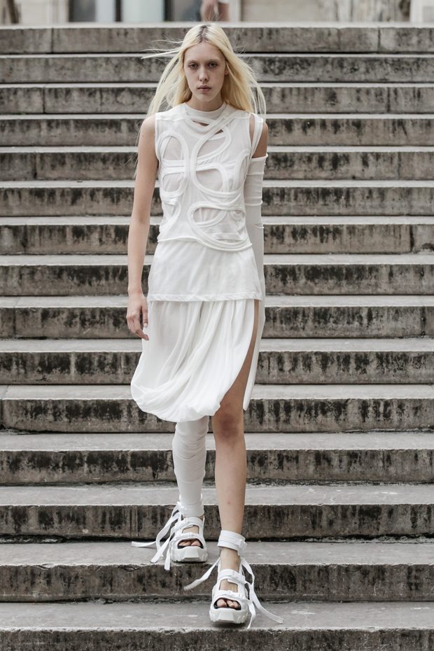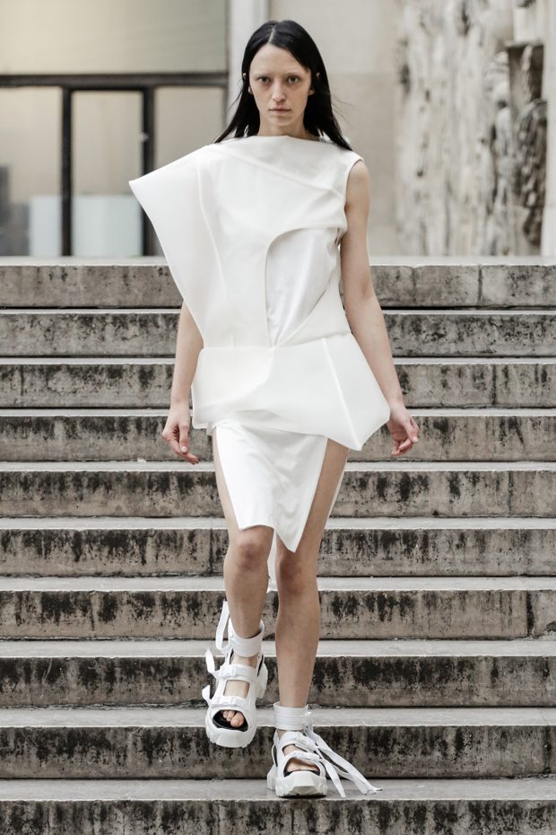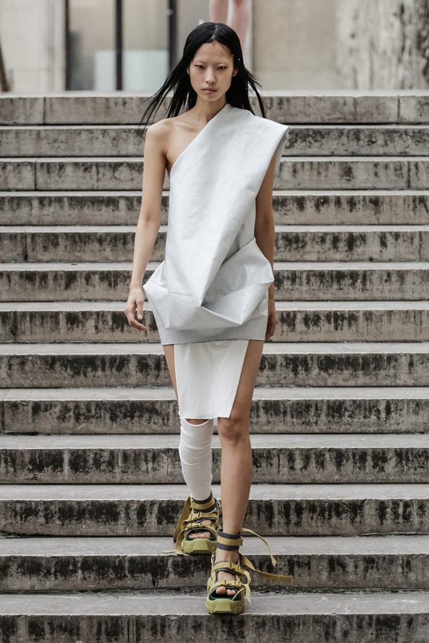 Rick Owens presents the women’s spring summer 2018 collection at courtyard of the Palais de Tokyo at Paris Fashion Week. The collection represents stoicism, fertility, futurism, hope; Rick Owens translates this into his designs in twisted and flanged forms that hang around the body. In layers of neck holes and armholes, thin white t-shirts are stretched over the body creating a crude American’s brutalist interpretation of French confection. Using different forms of canvas as the prime fabric for the collection; such as a nylon/cotton technical canvas with the sheen of a duchesse, stiff cotton sateen canvas, a chalky matte rubber and cotton canvas, shiny lacquered canvas, metal mega-bugle beaded canvas, “canvas as a modest material to sculpt and paint on has always appealed to me since art school; canvas just feels like potential and a fresh start” says Rick Owens.