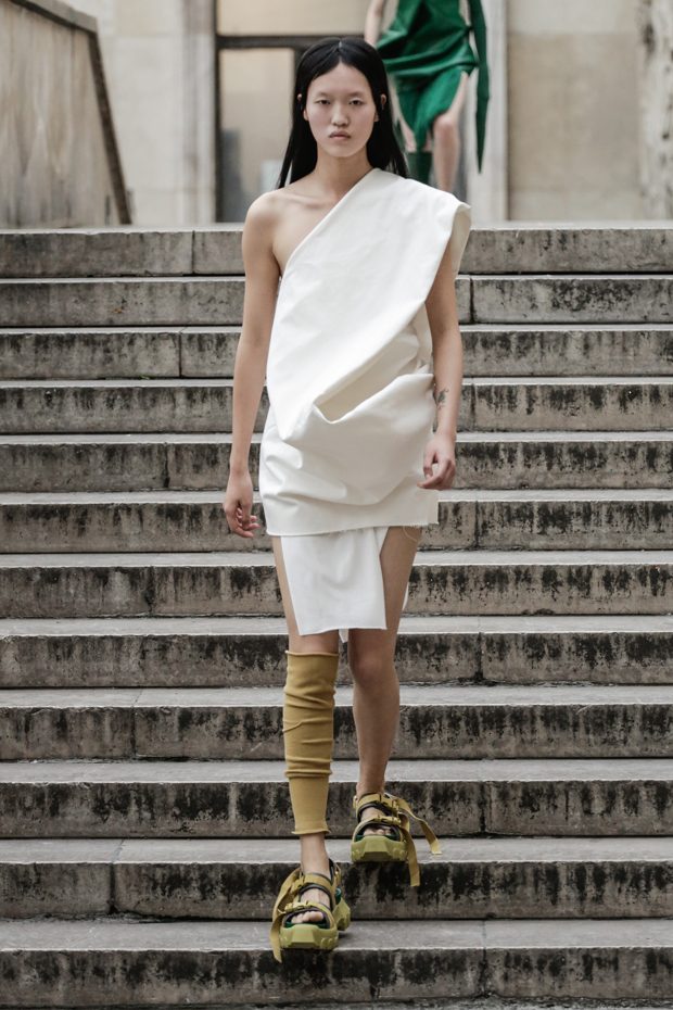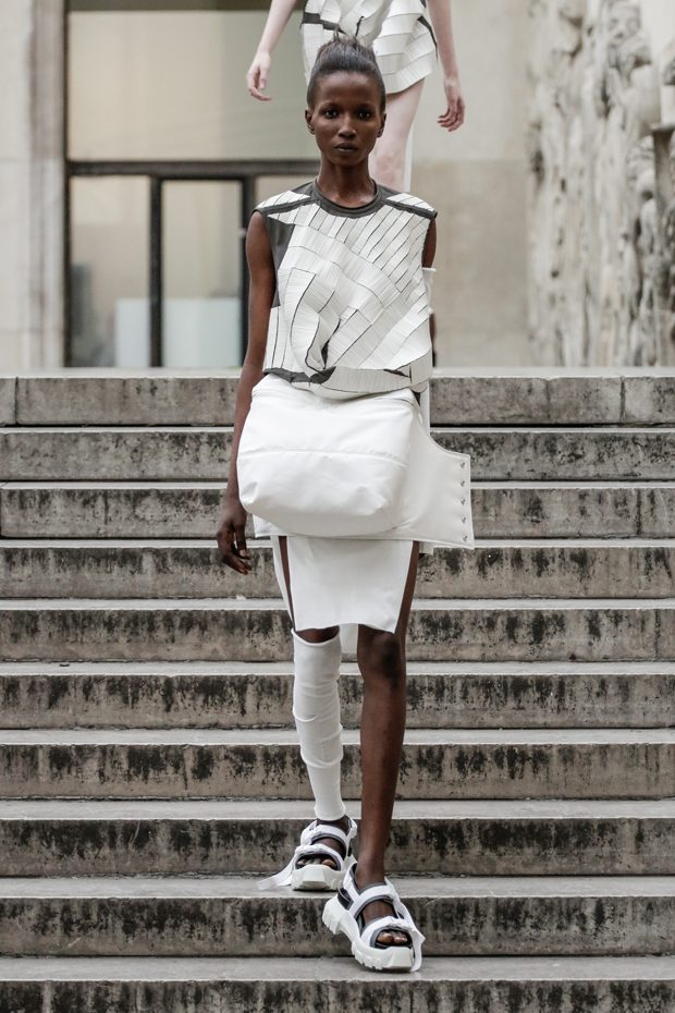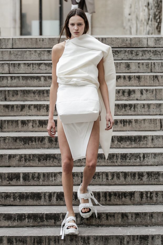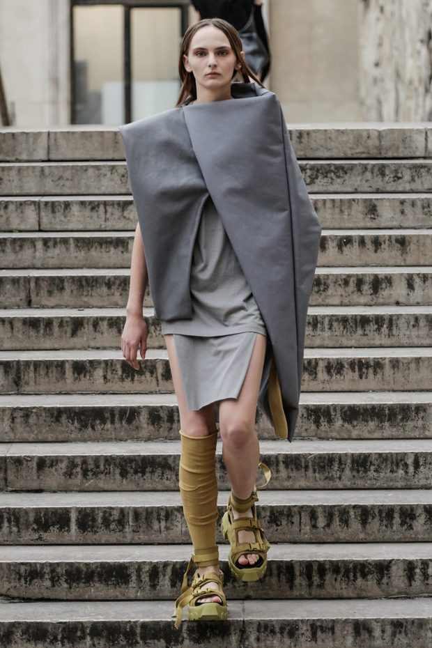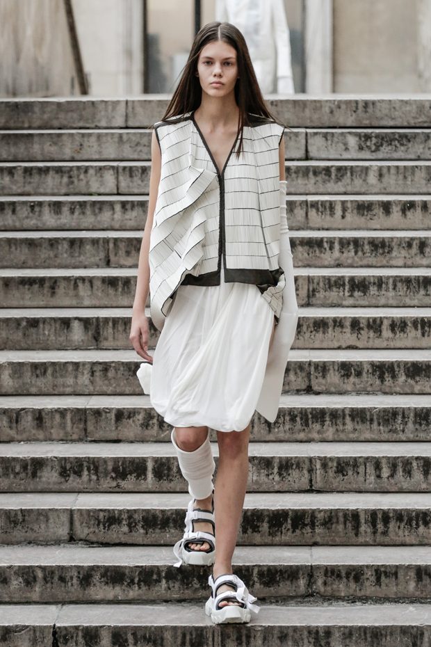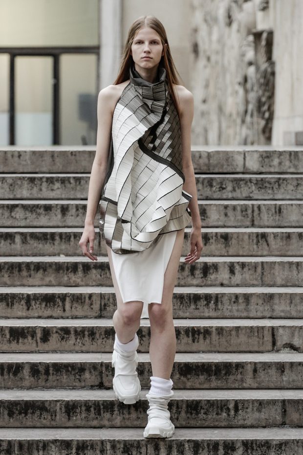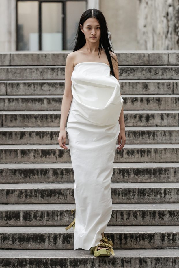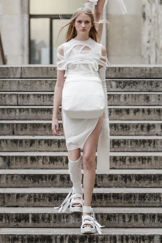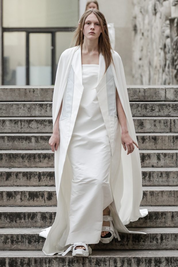 Rick Owens presents the women’s spring summer 2018 collection at courtyard of the Palais de Tokyo at Paris Fashion Week. The collection represents stoicism, fertility, futurism, hope; Rick Owens translates this into his designs in twisted and flanged forms that hang around the body. In layers of neck holes and armholes, thin white t-shirts are stretched over the body creating a crude American’s brutalist interpretation of French confection. Using different forms of canvas as the prime fabric for the collection; such as a nylon/cotton technical canvas with the sheen of a duchesse, stiff cotton sateen canvas, a chalky matte rubber and cotton canvas, shiny lacquered canvas, metal mega-bugle beaded canvas, “canvas as a modest material to sculpt and paint on has always appealed to me since art school; canvas just feels like potential and a fresh start” says Rick Owens.