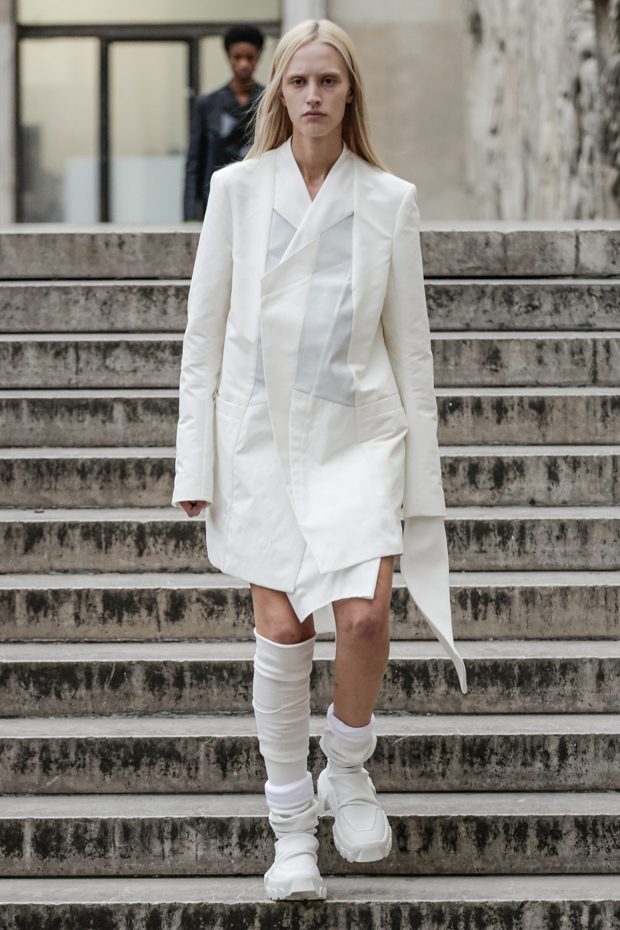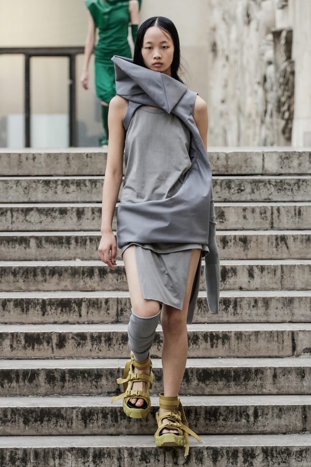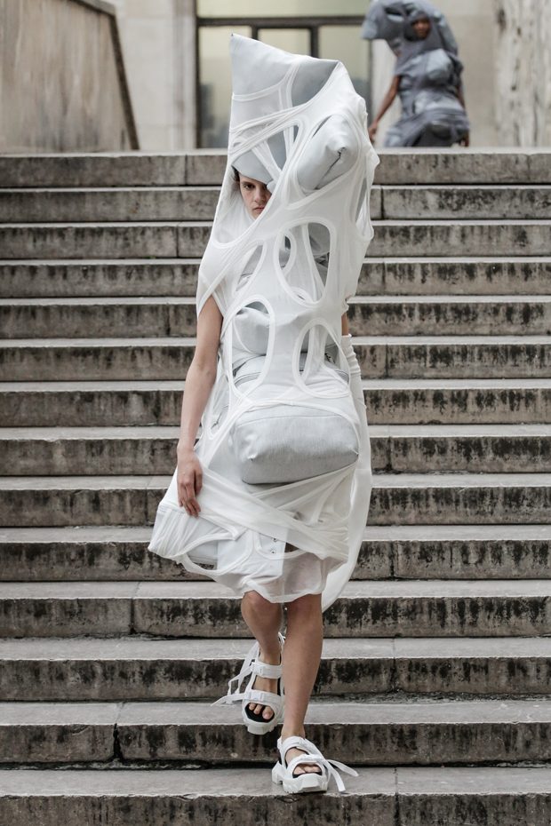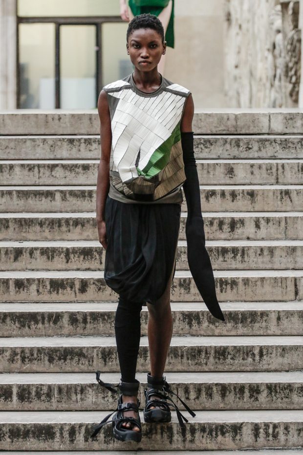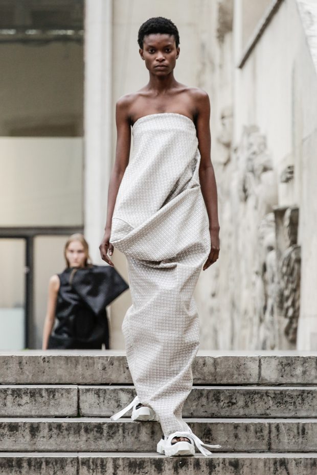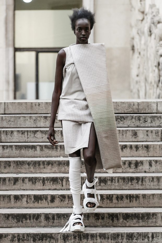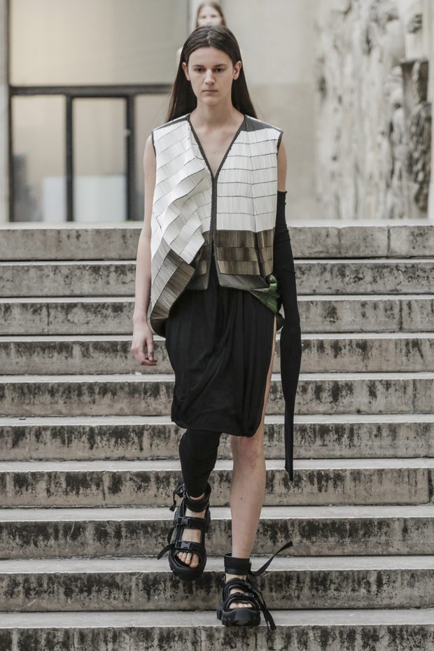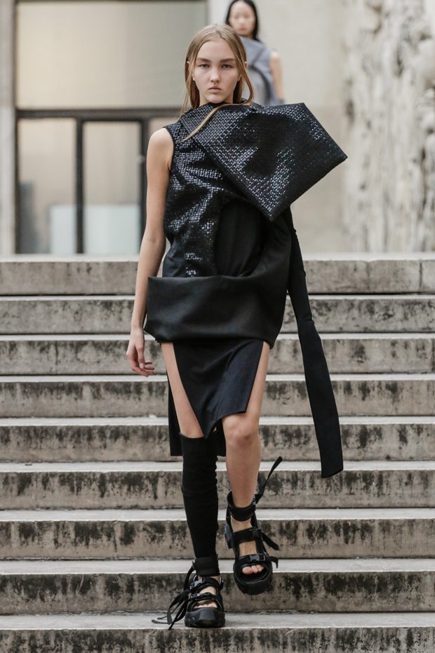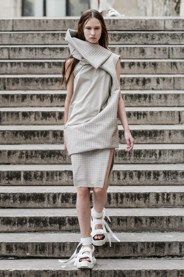 Rick Owens presents the women’s spring summer 2018 collection at courtyard of the Palais de Tokyo at Paris Fashion Week. The collection represents stoicism, fertility, futurism, hope; Rick Owens translates this into his designs in twisted and flanged forms that hang around the body. In layers of neck holes and armholes, thin white t-shirts are stretched over the body creating a crude American’s brutalist interpretation of French confection. Using different forms of canvas as the prime fabric for the collection; such as a nylon/cotton technical canvas with the sheen of a duchesse, stiff cotton sateen canvas, a chalky matte rubber and cotton canvas, shiny lacquered canvas, metal mega-bugle beaded canvas, “canvas as a modest material to sculpt and paint on has always appealed to me since art school; canvas just feels like potential and a fresh start” says Rick Owens.