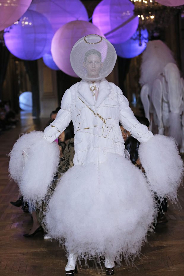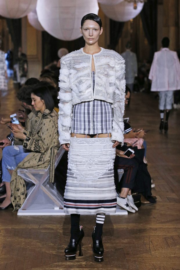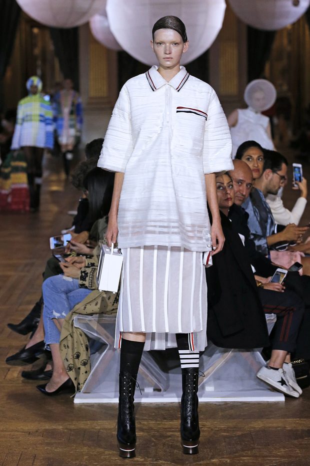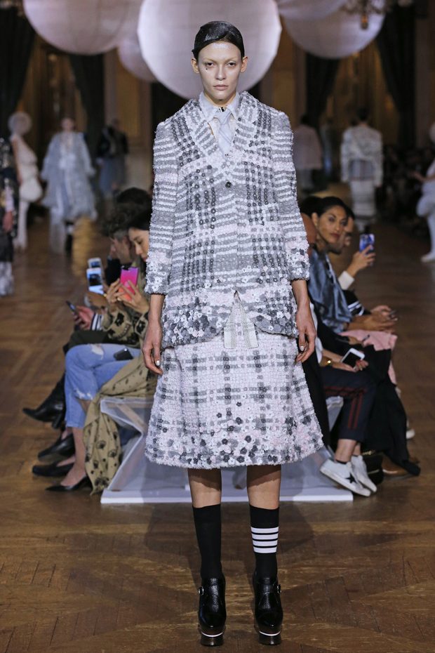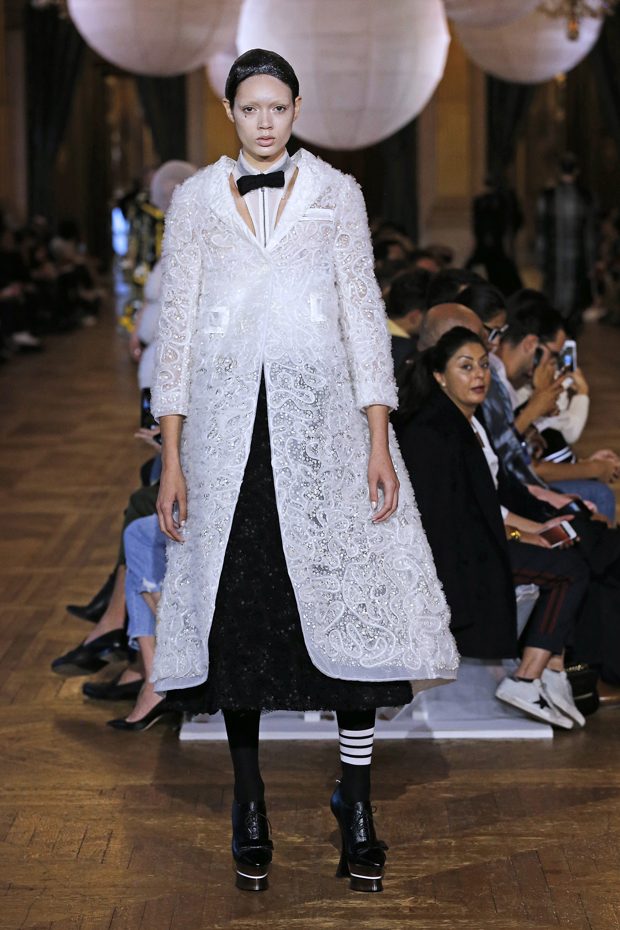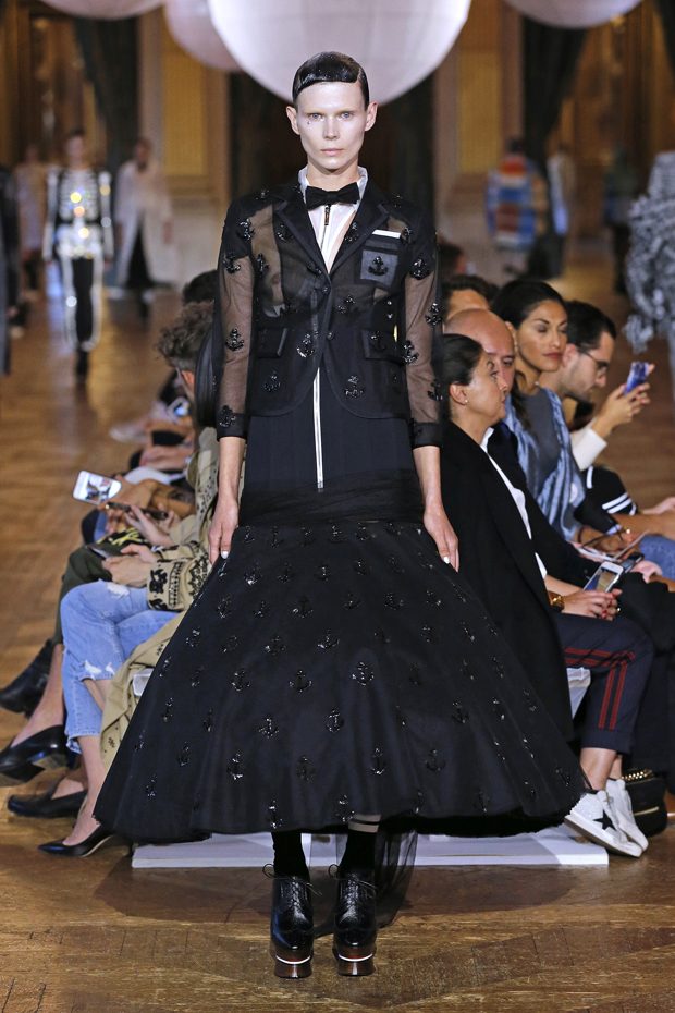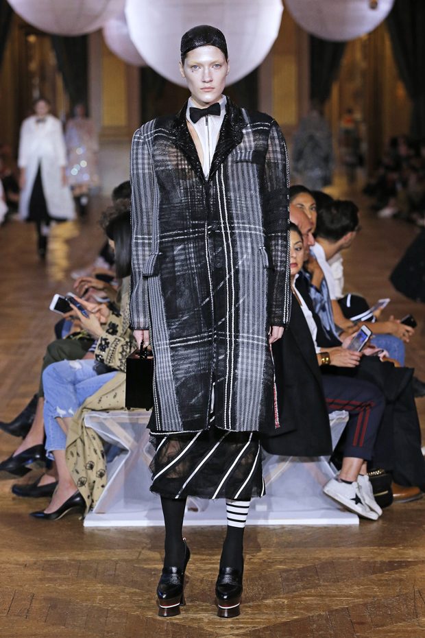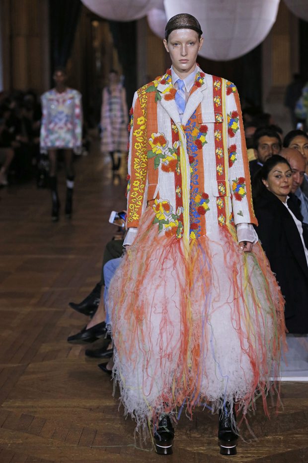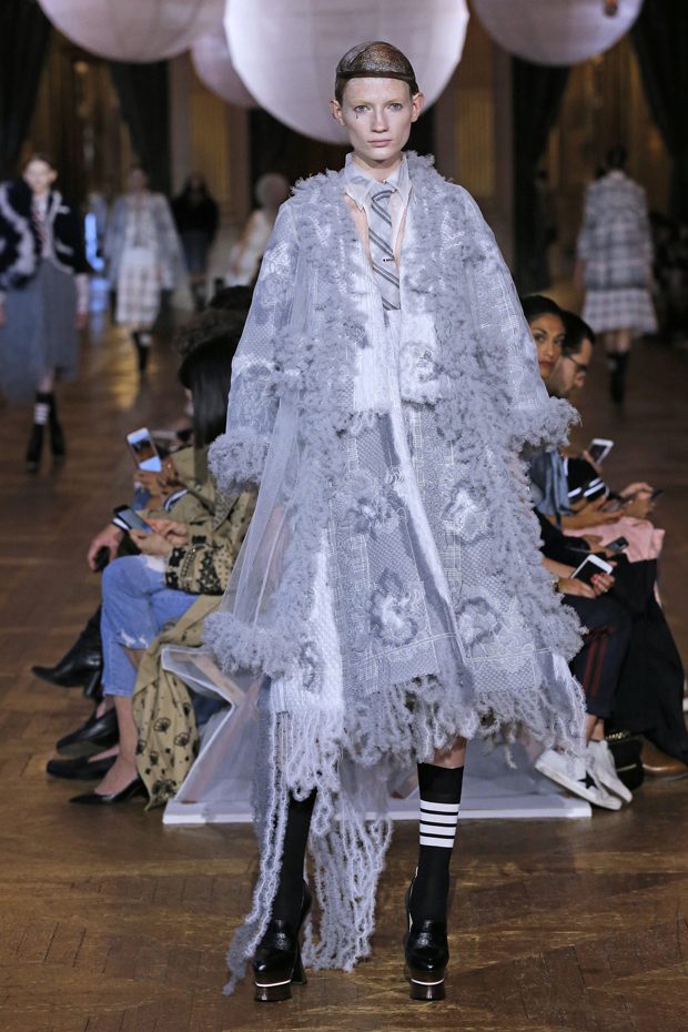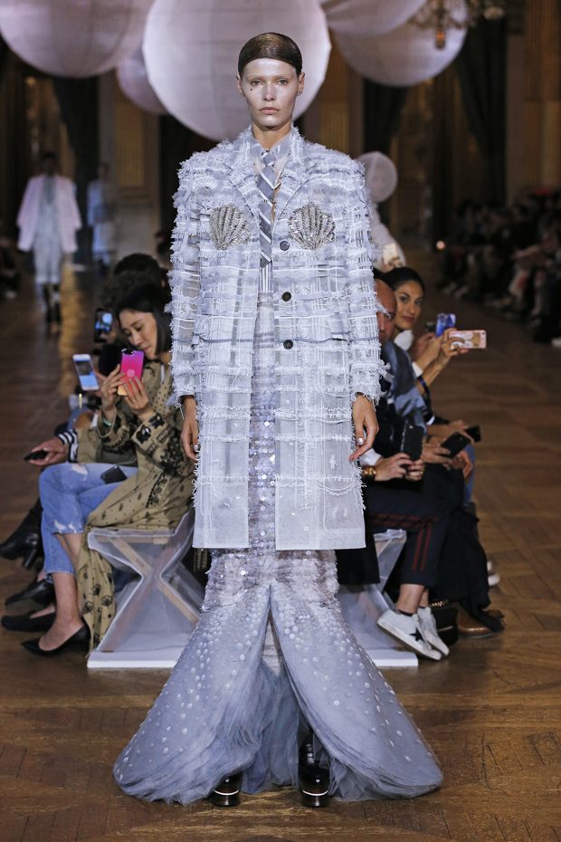 Thom Browne presents the spring summer 2018 collection at Paris Fashion Week. The collection is a dream of tulle; with tulle as the tool, light, frilly, and floating. A double dream, dreamt on another planet, dreaming of another beauty that is in fact reality. The fabric is twisted, gathered, and ruffled in shades of grey, blue, black, but also multicolor.