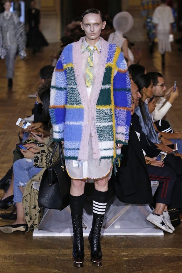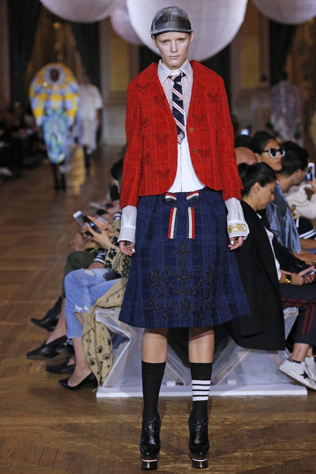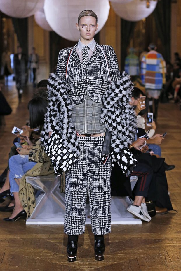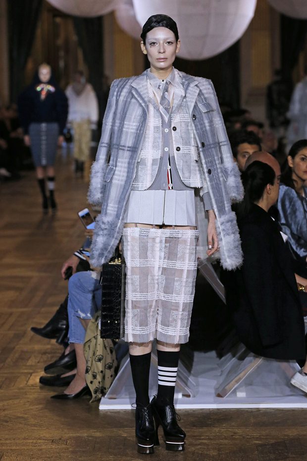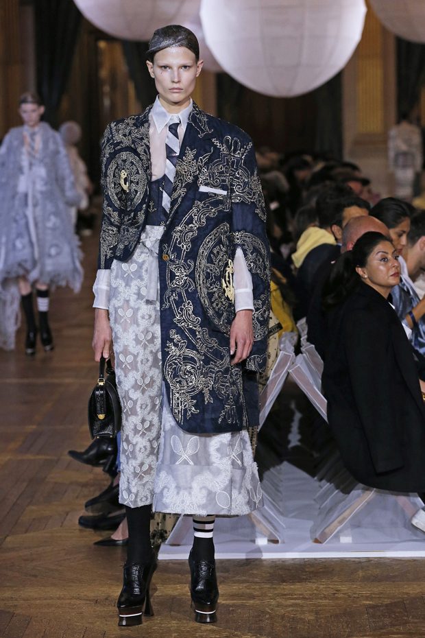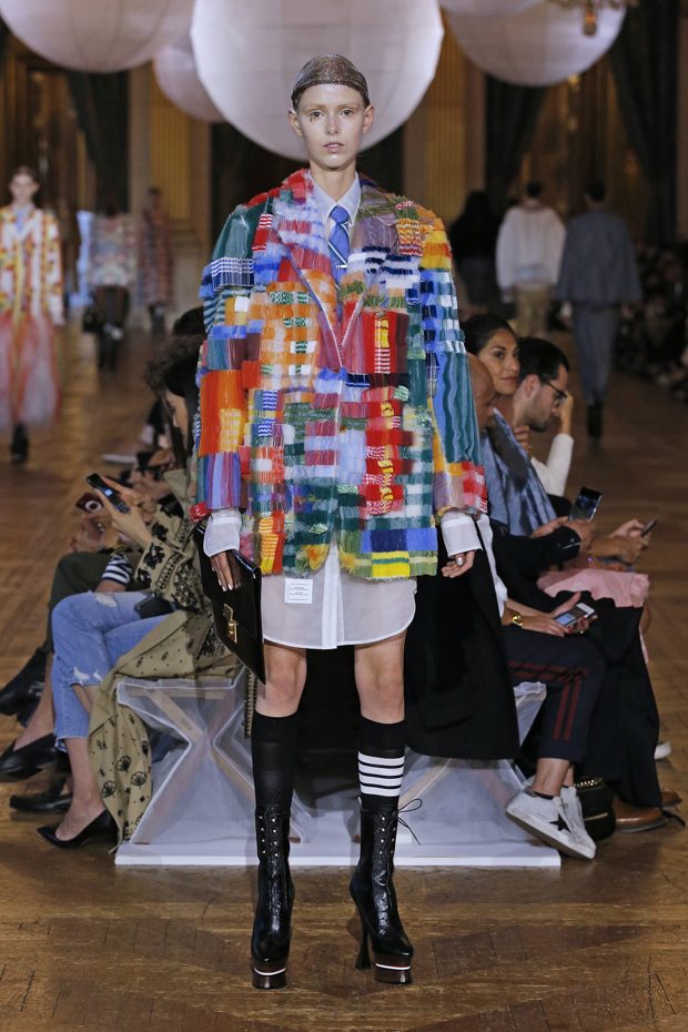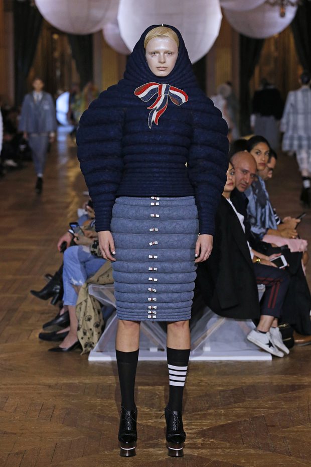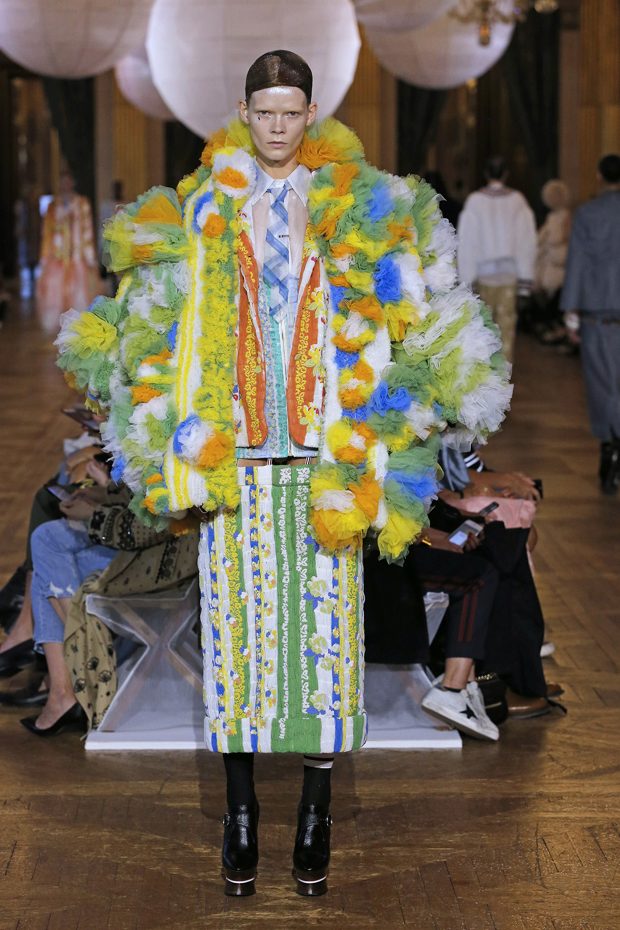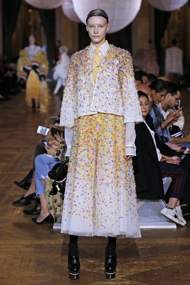 Thom Browne presents the spring summer 2018 collection at Paris Fashion Week. The collection is a dream of tulle; with tulle as the tool, light, frilly, and floating. A double dream, dreamt on another planet, dreaming of another beauty that is in fact reality. The fabric is twisted, gathered, and ruffled in shades of grey, blue, black, but also multicolor.