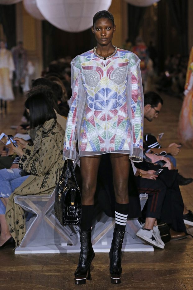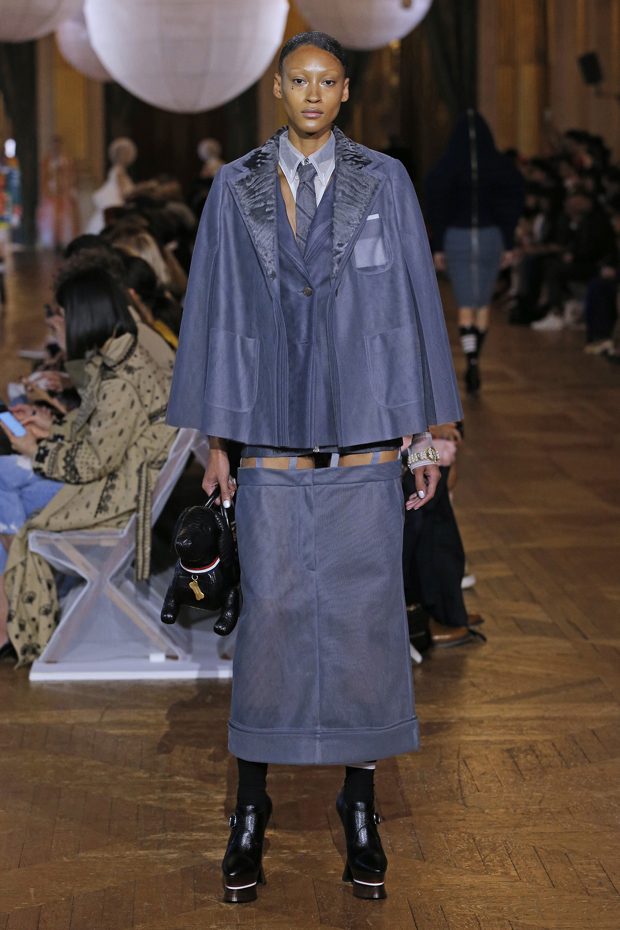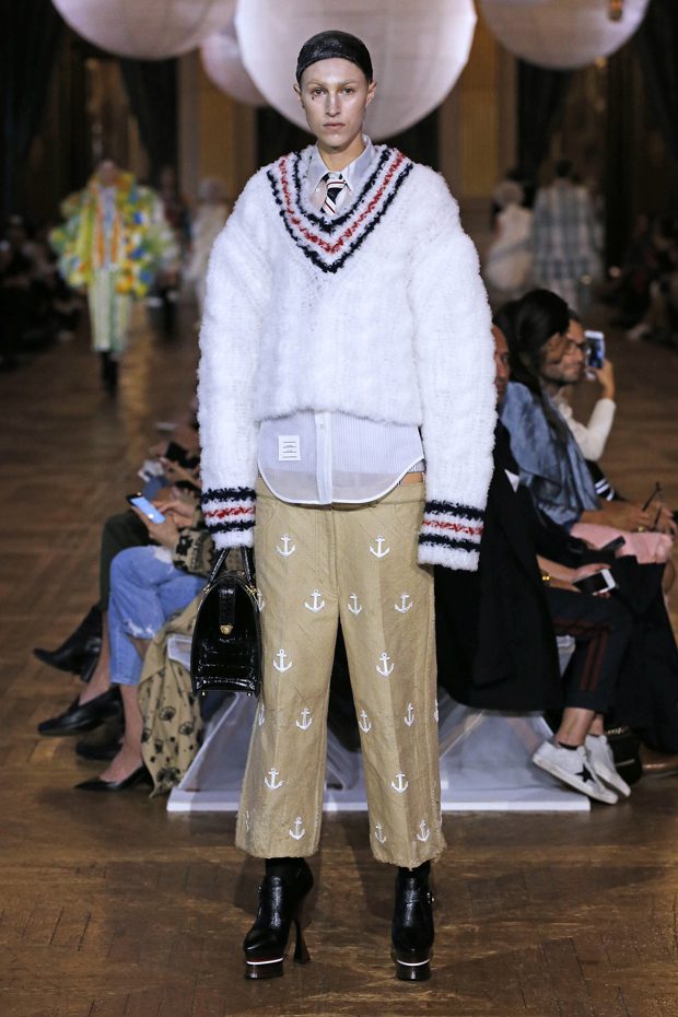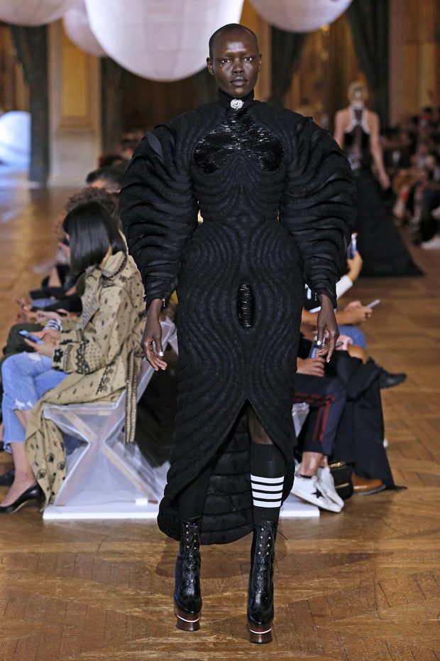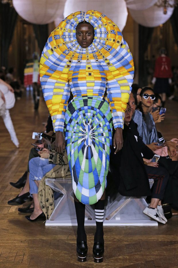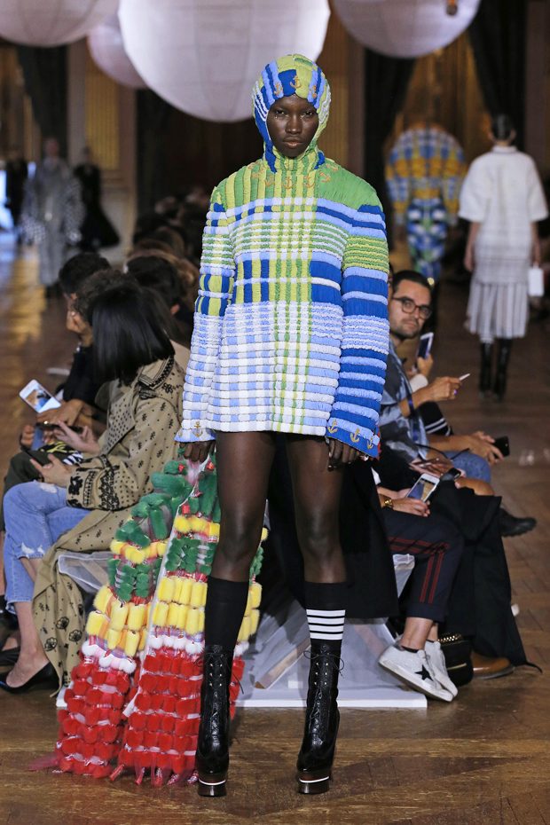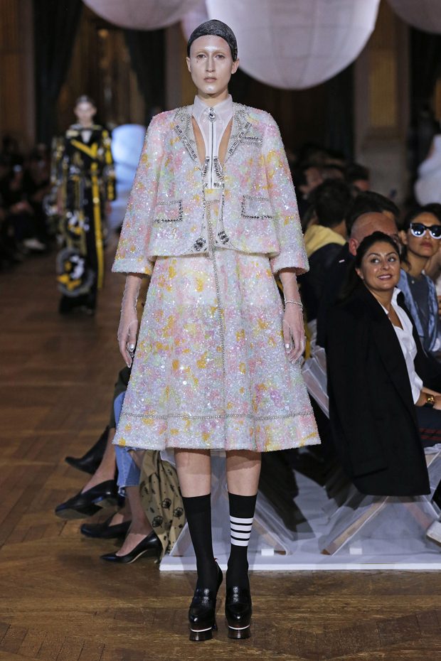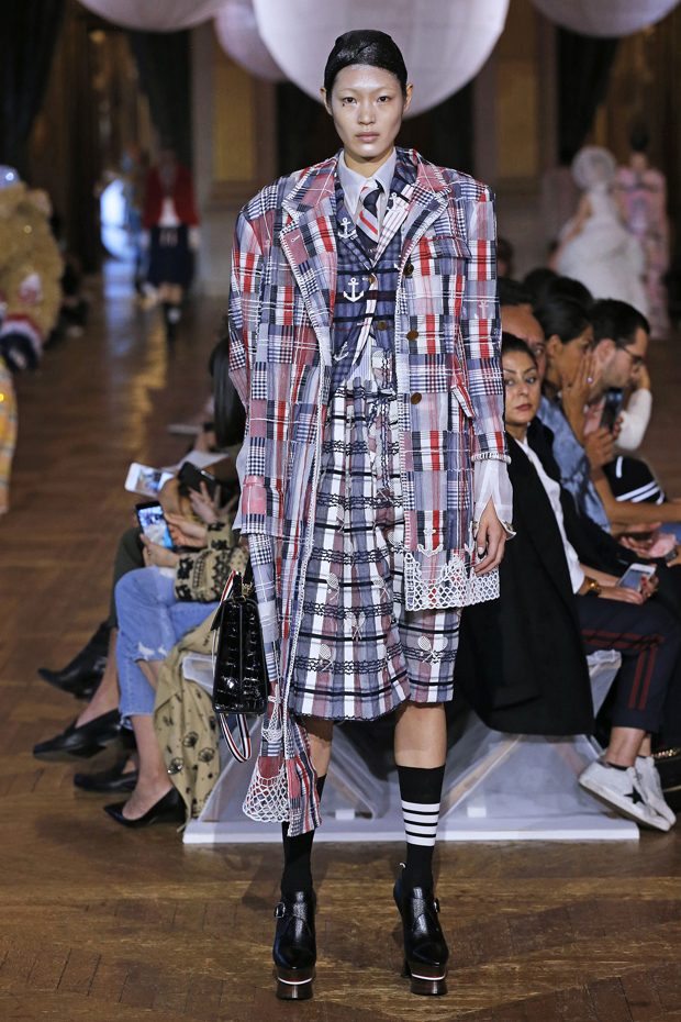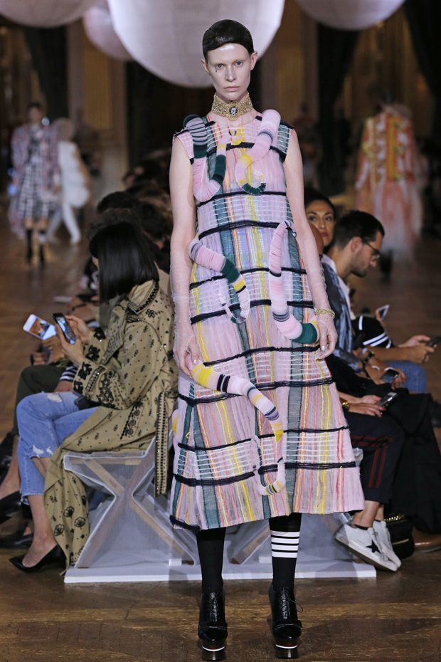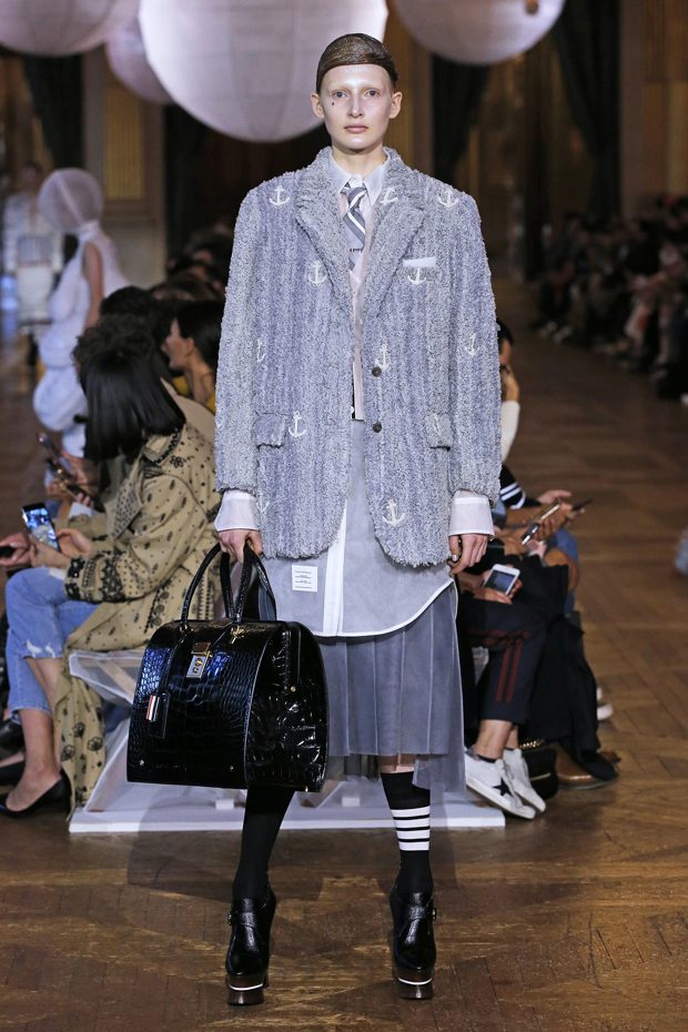 Thom Browne presents the spring summer 2018 collection at Paris Fashion Week. The collection is a dream of tulle; with tulle as the tool, light, frilly, and floating. A double dream, dreamt on another planet, dreaming of another beauty that is in fact reality. The fabric is twisted, gathered, and ruffled in shades of grey, blue, black, but also multicolor.