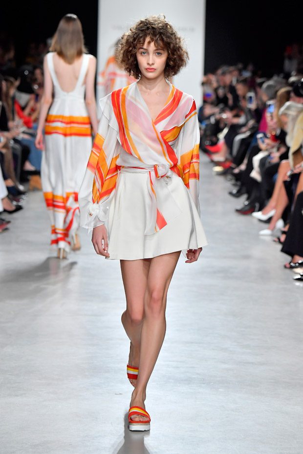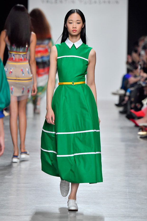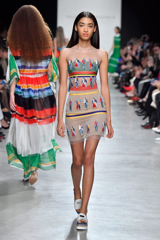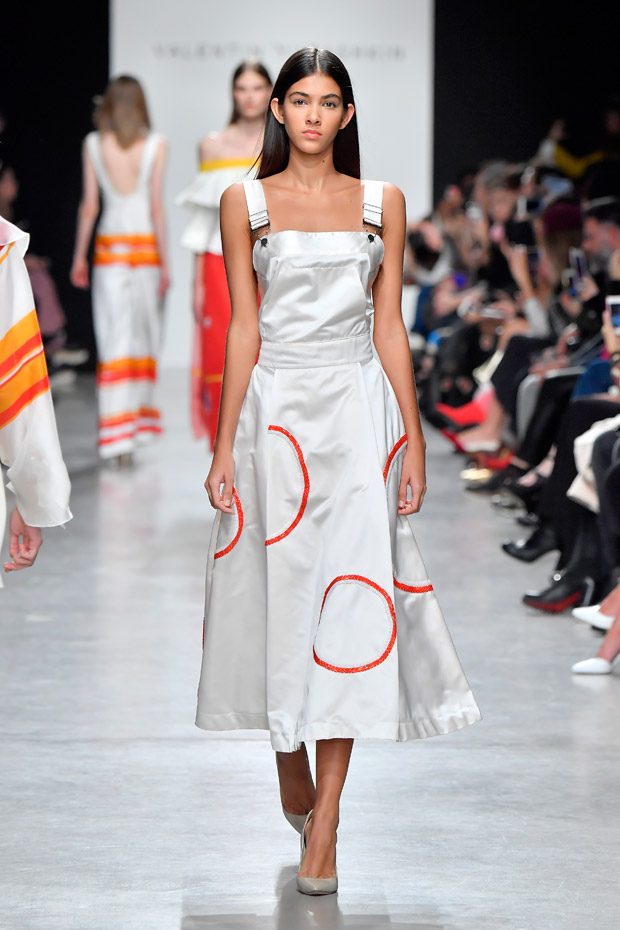 Combinations of multicolored planes and geometric shapes – a straight line, a rectangle, a square and a circle, as well as a combination of geometric figuresthat comes in different colors and sizes, all form Suprematist compositions that are reflected in the Valentin Yudashkin SS18 collection. The centerstage is taken by graphic prints with colorful squares and triangles as well as horizontal, vertical and oblique stripes.