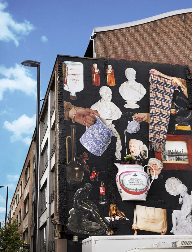 Christopher and I have kept in constant contact since our first mural in Clerkenwell, whose short but sweet lifespan only made it more pressing that we work together again. We decided to do three more, centred around the holiday season in New York, which is quite fitting as my favourite Christmas song is “Fairytale of New York”. Over the last couple of years I have been collecting antiques and objects, some more sentimental than others, and incorporating these into my works. These new murals are a composition, a curation of some of these objects that sit aside references to Burberry and British culture. – Blondey McCoy