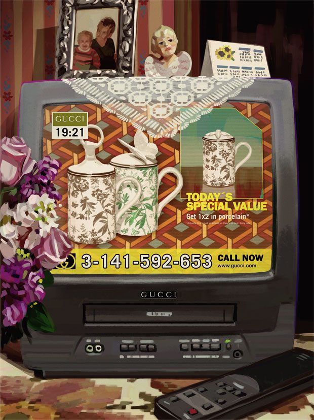 Furthermore the campaign focusing on the range of coveted jewellery, tshirts, handbags, childrenswear and the recently launched porcelain and candles is to have a massive digital backing by the fashion house. For GUCCI app special interactive features are created and already available for download, the team is bringing to life original filters and greetings cards. At the same time GUCCI shop windows will take part in the action as well, special software is created to animate the top location windows which is to allow potential shoppers to scan a sticker placed on the window.