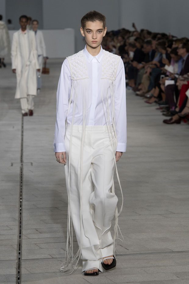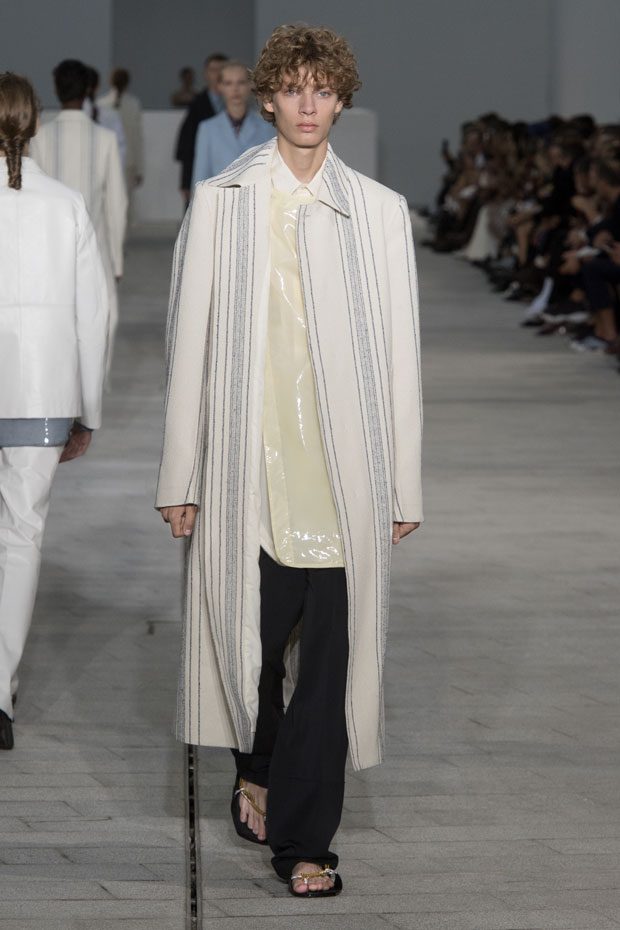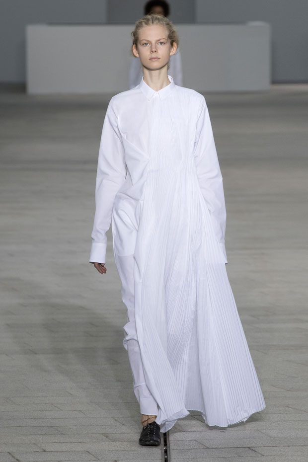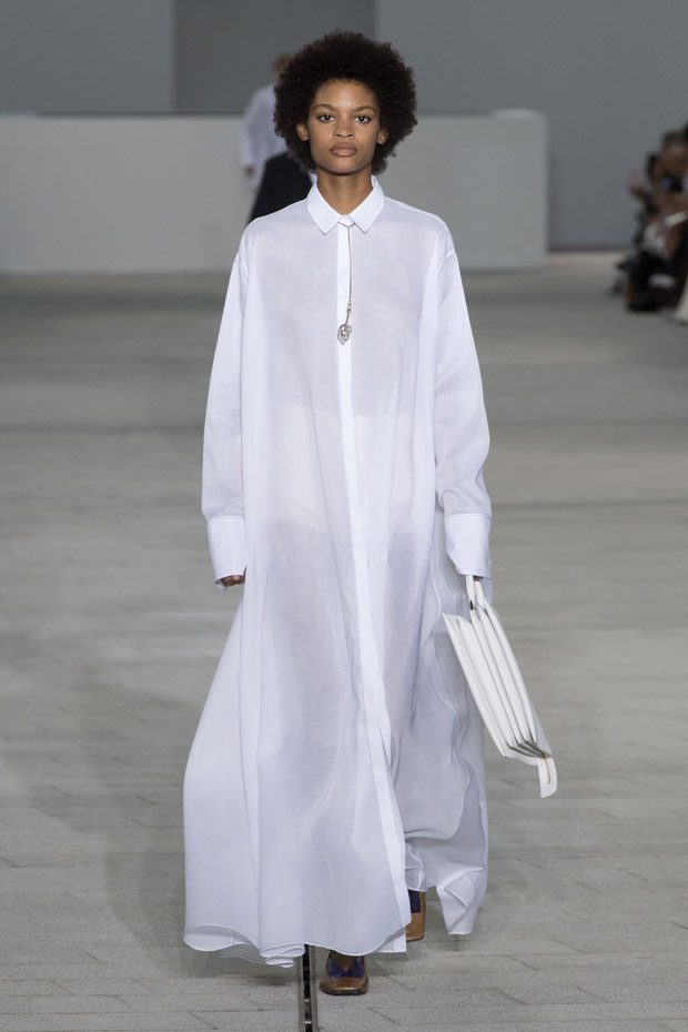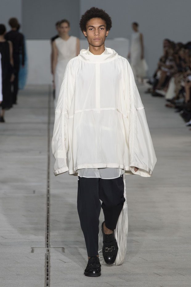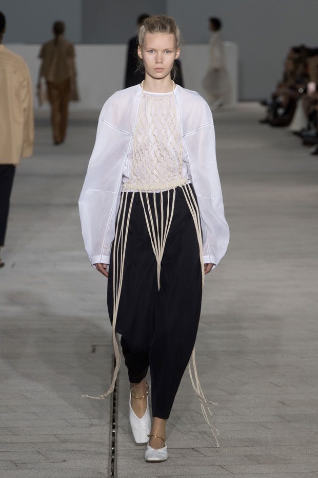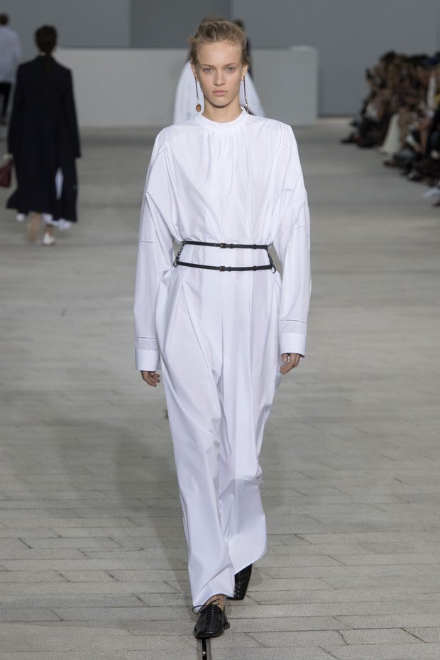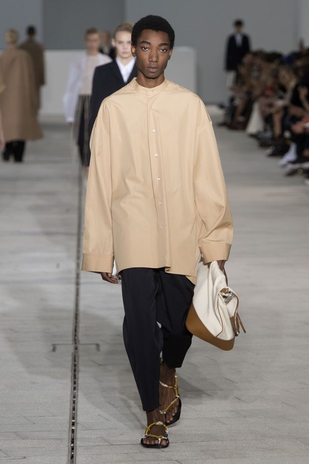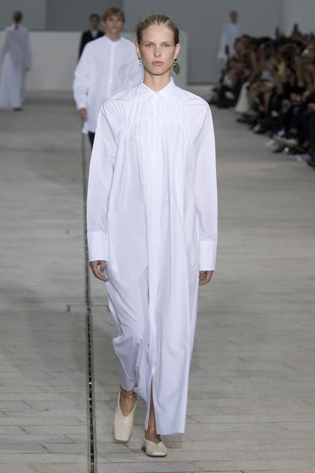The Spring/Summer 2018 collection, comprised of women’s and men’s looks, demonstrates sensitivity and purity in combination with modern construction and in novation. This contrast is fundamental to what the Meiers want to maintain within their work at the brand, celebrating nature and the human touch while embracing progressive ingenuity. This is precisely why the venue was selected: a work of human creation that frames the magnificence of nature. A pure palette of whites with navy, camel, and black recalls the house codes, while bright colors gives strength to voluminous knits. The white poplin shirt is revisited in several iterations; new proposals of tailoring construction are demonstrated against light, airy drapes; traditional and functional smock and elastic distortion connect masculine functionality with feminine volumes; handwork is essential to the preciousness of the macramé and embroidered detailing. – from Jil Sander