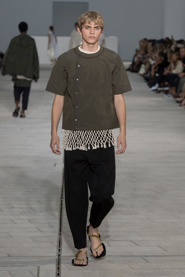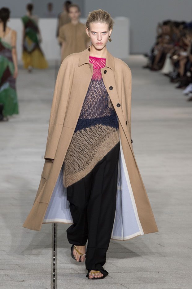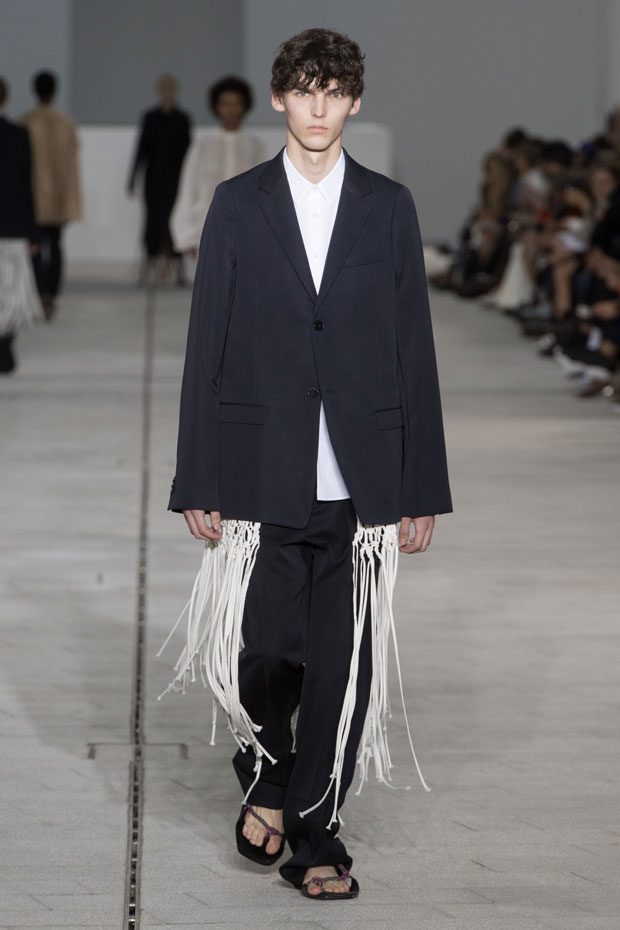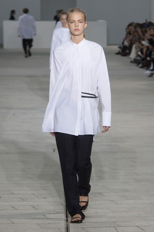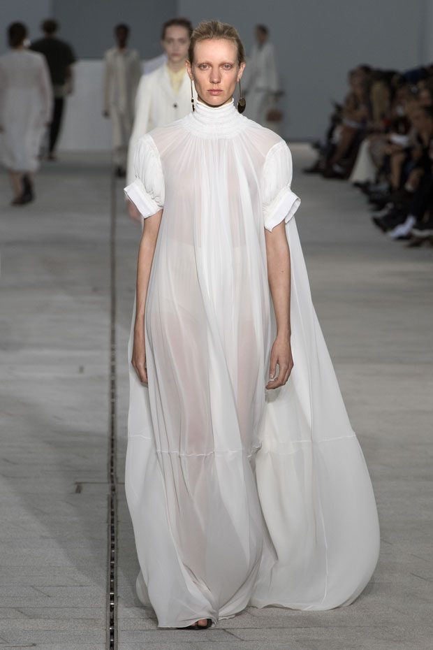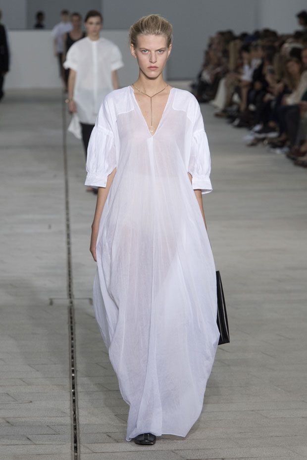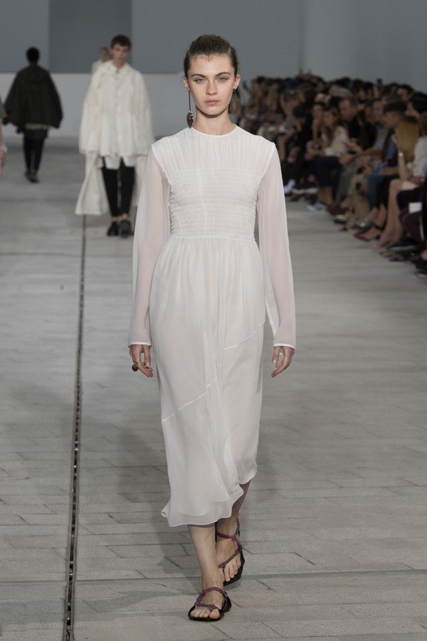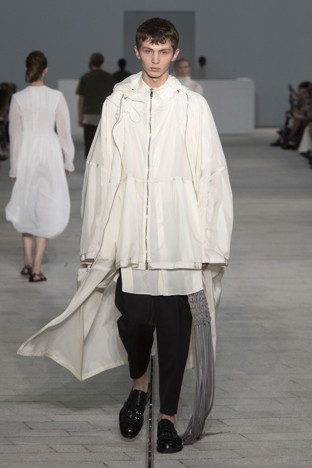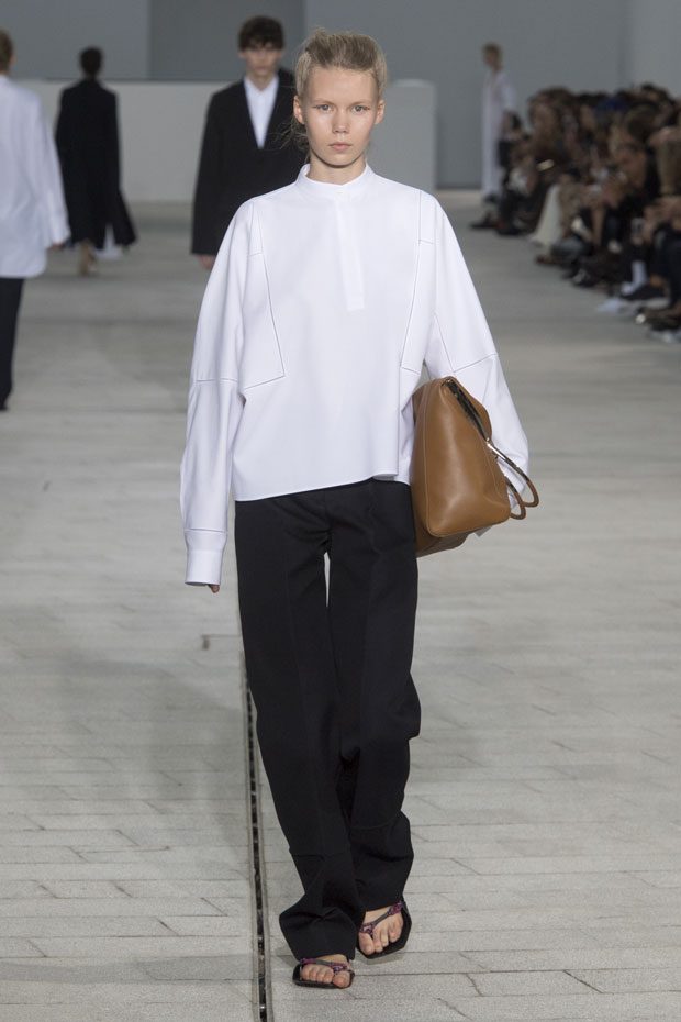 The Spring/Summer 2018 collection, comprised of women’s and men’s looks, demonstrates sensitivity and purity in combination with modern construction and in novation. This contrast is fundamental to what the Meiers want to maintain within their work at the brand, celebrating nature and the human touch while embracing progressive ingenuity. This is precisely why the venue was selected: a work of human creation that frames the magnificence of nature. A pure palette of whites with navy, camel, and black recalls the house codes, while bright colors gives strength to voluminous knits. The white poplin shirt is revisited in several iterations; new proposals of tailoring construction are demonstrated against light, airy drapes; traditional and functional smock and elastic distortion connect masculine functionality with feminine volumes; handwork is essential to the preciousness of the macramé and embroidered detailing. – from Jil Sander