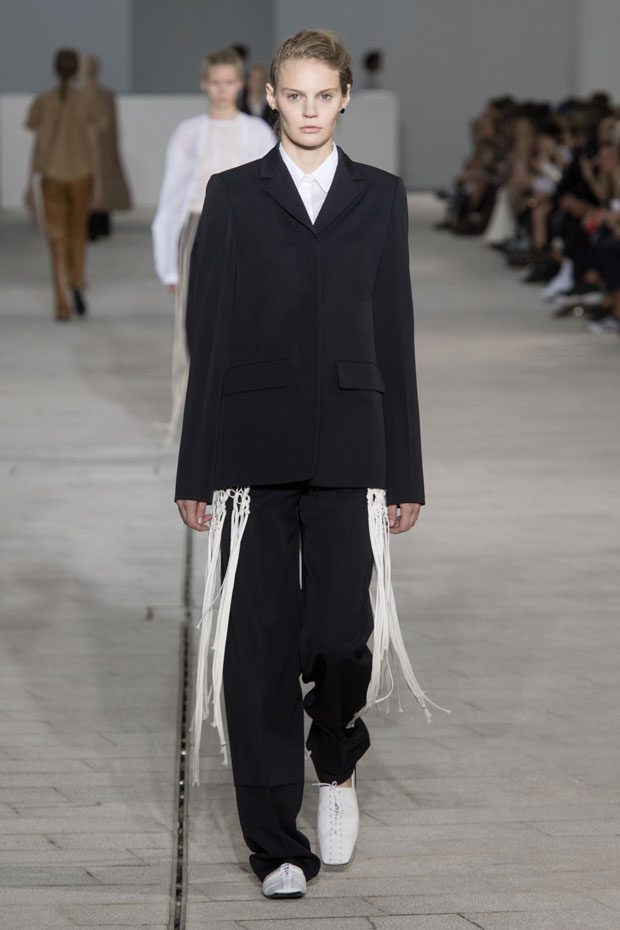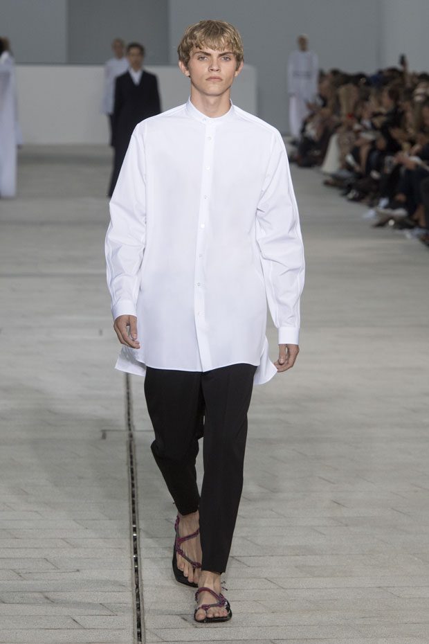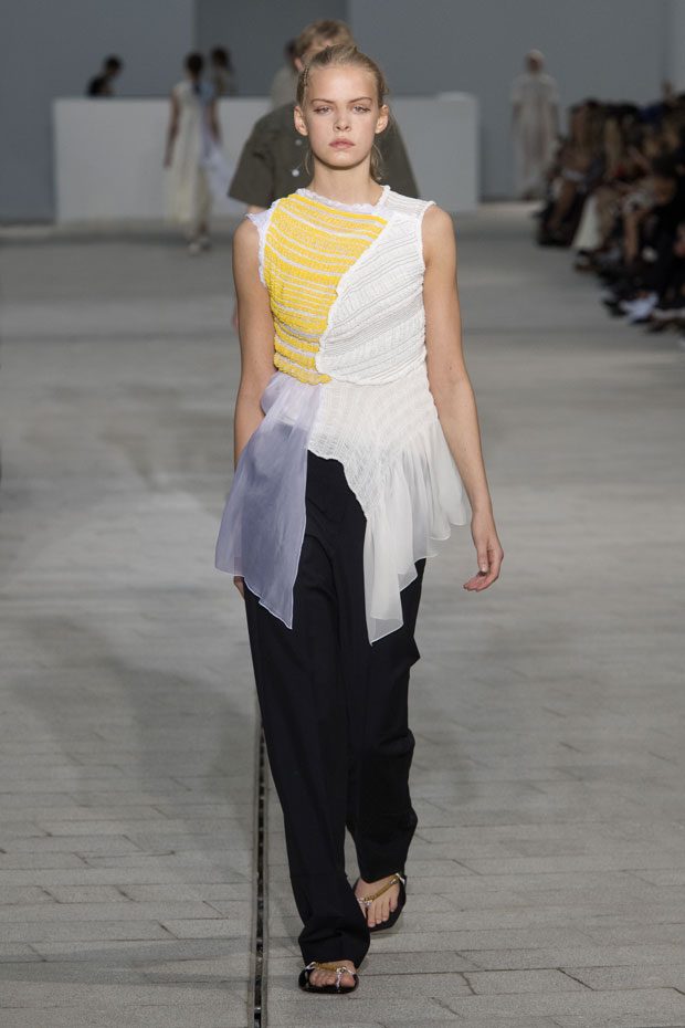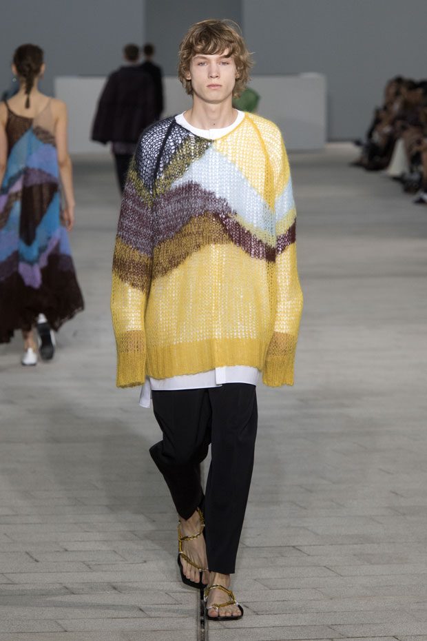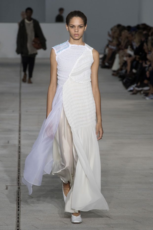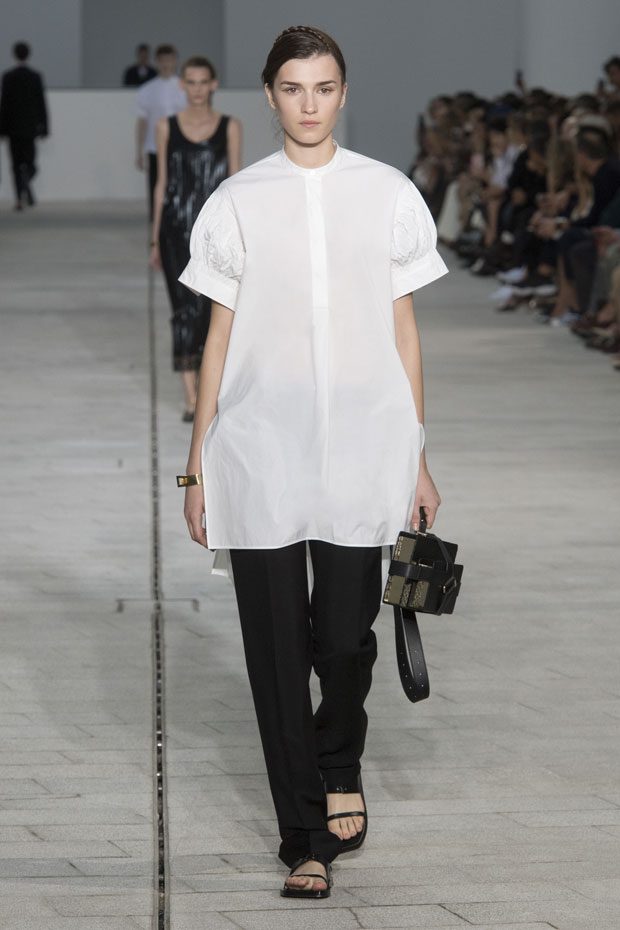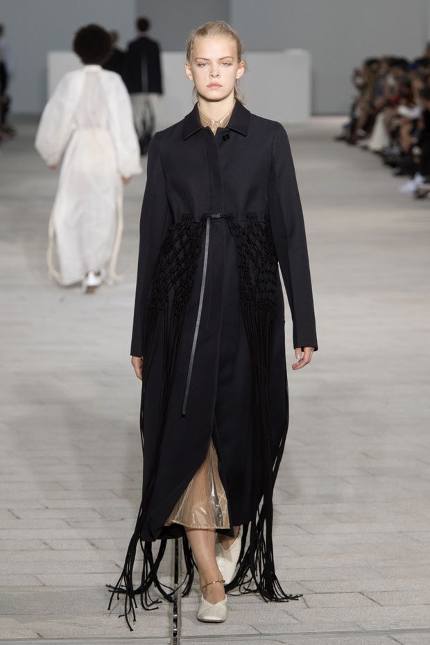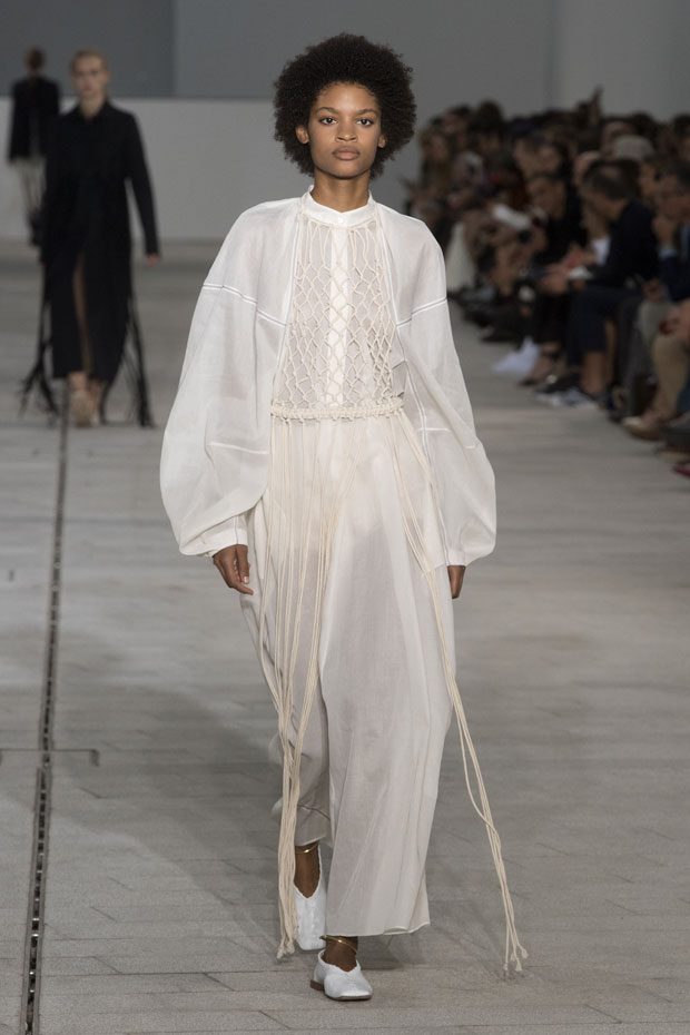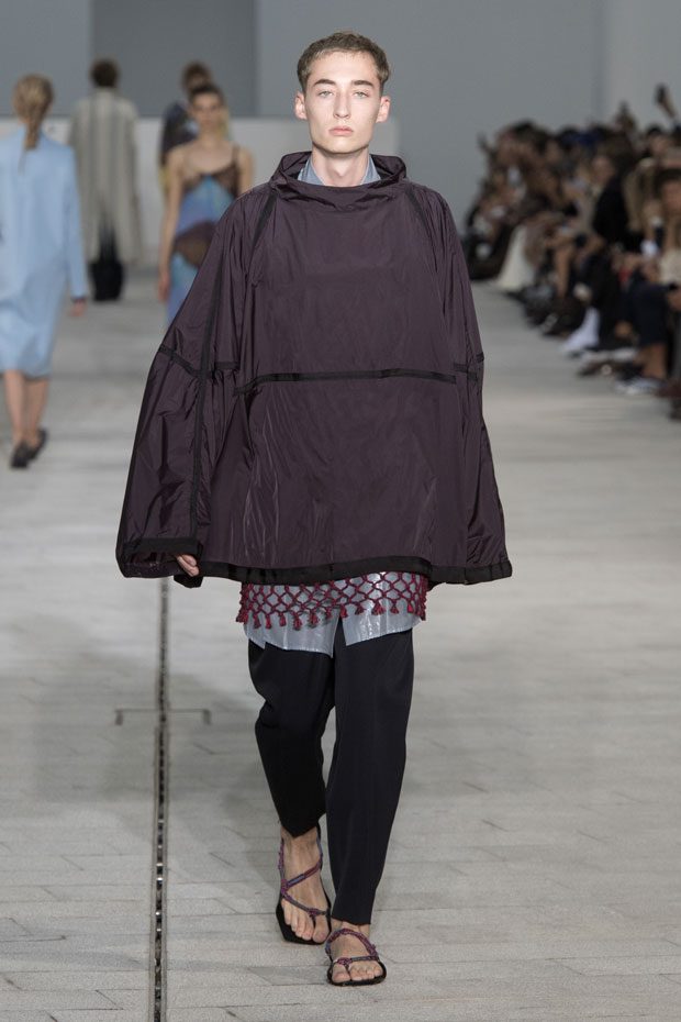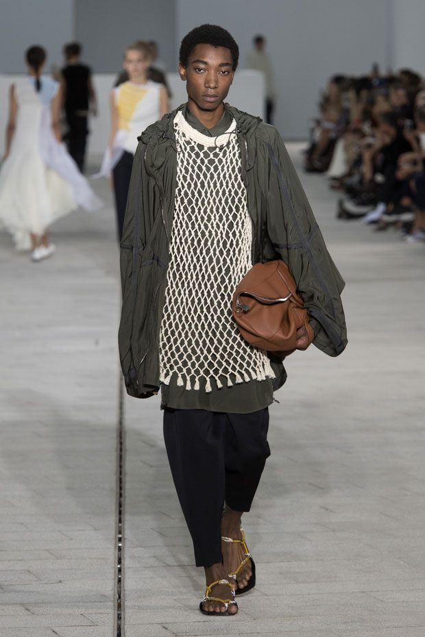 The Spring/Summer 2018 collection, comprised of women’s and men’s looks, demonstrates sensitivity and purity in combination with modern construction and in novation. This contrast is fundamental to what the Meiers want to maintain within their work at the brand, celebrating nature and the human touch while embracing progressive ingenuity. This is precisely why the venue was selected: a work of human creation that frames the magnificence of nature. A pure palette of whites with navy, camel, and black recalls the house codes, while bright colors gives strength to voluminous knits. The white poplin shirt is revisited in several iterations; new proposals of tailoring construction are demonstrated against light, airy drapes; traditional and functional smock and elastic distortion connect masculine functionality with feminine volumes; handwork is essential to the preciousness of the macramé and embroidered detailing. – from Jil Sander