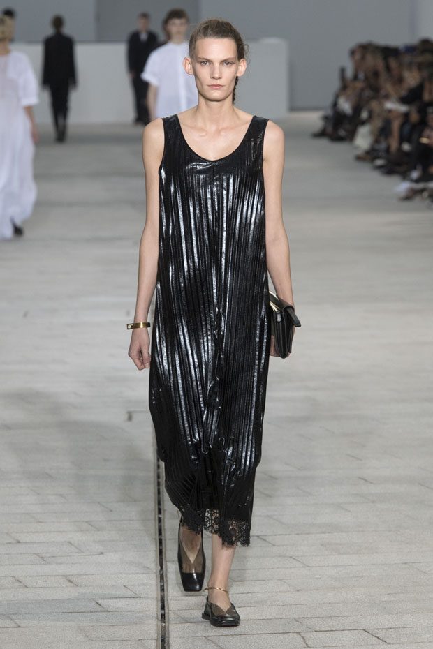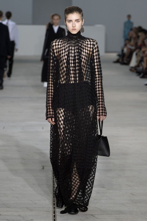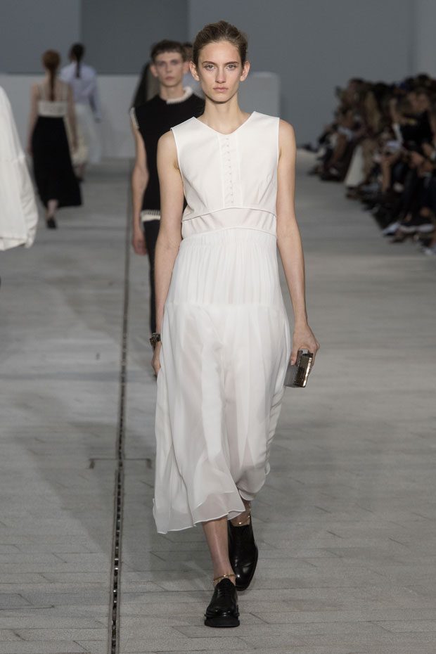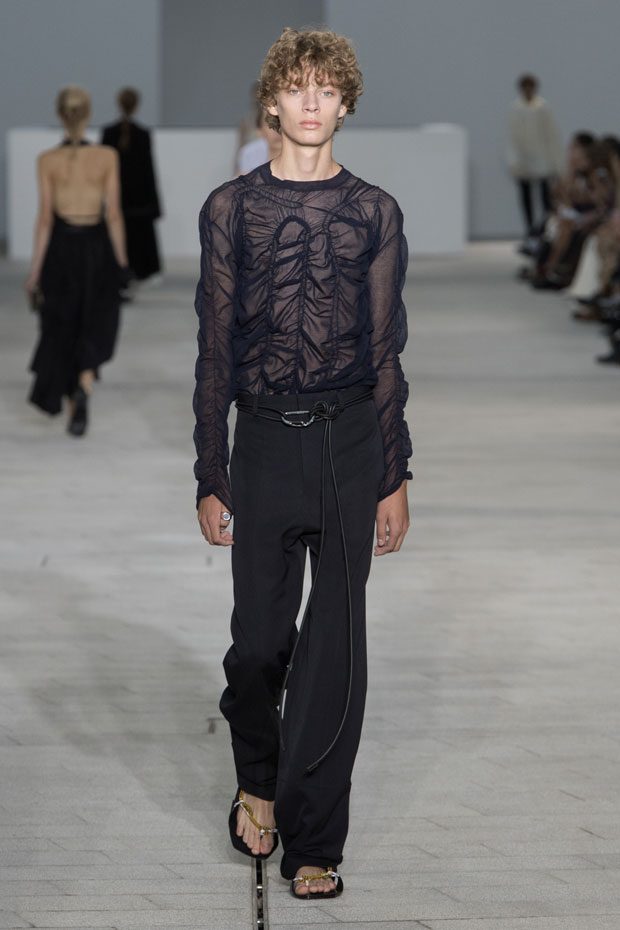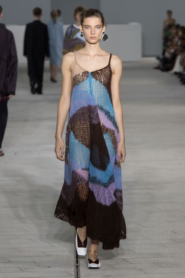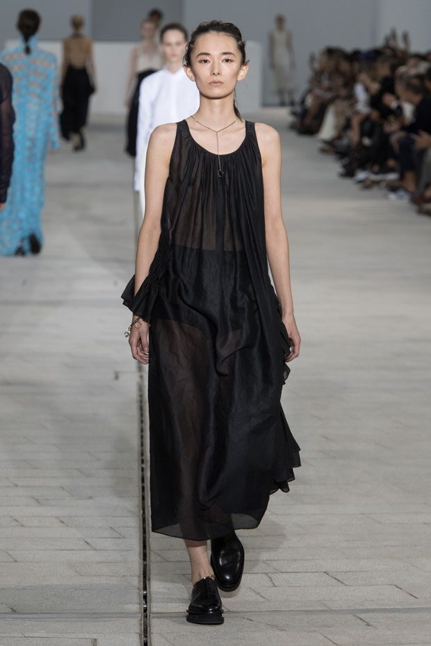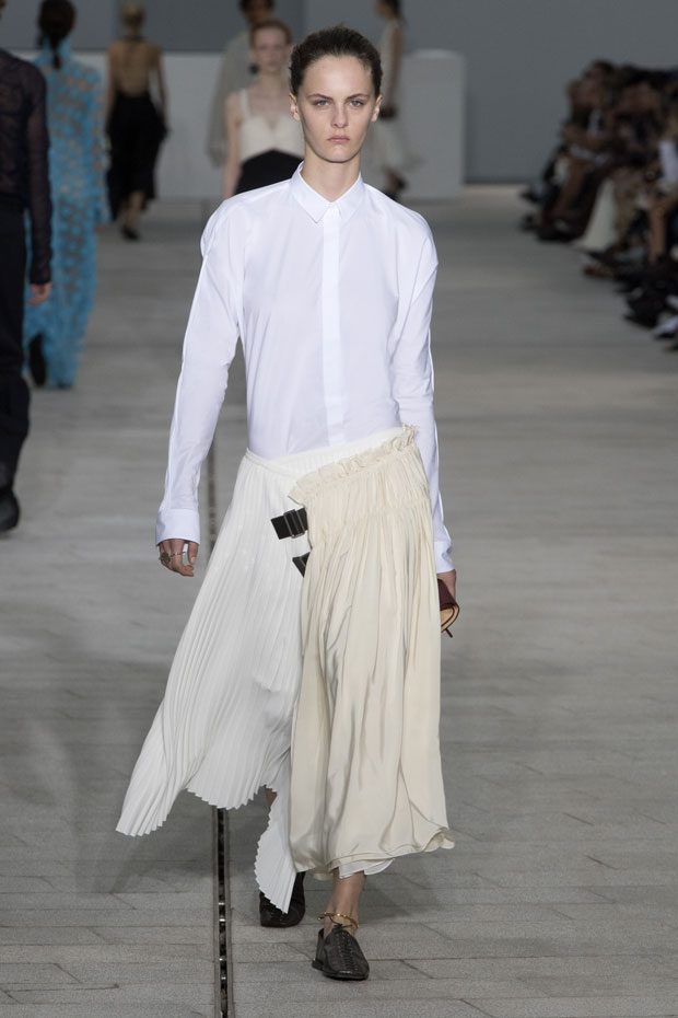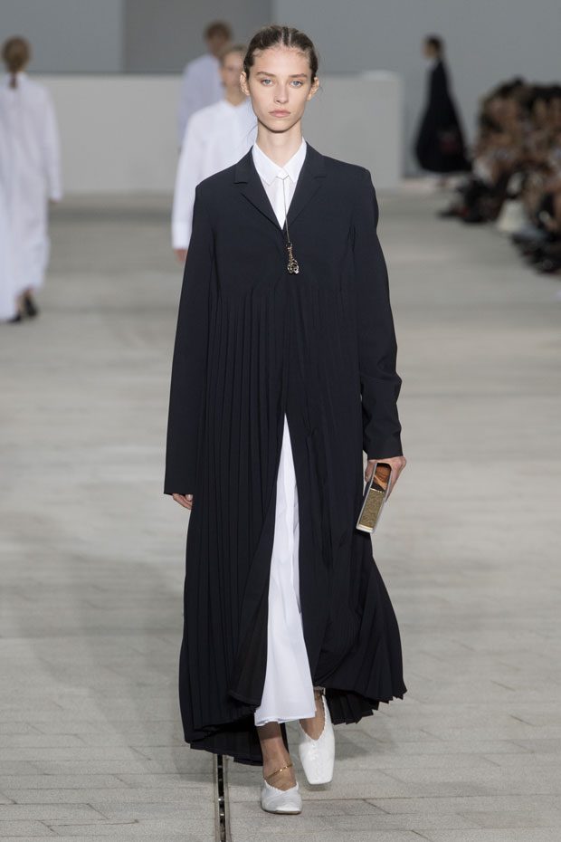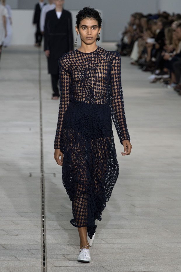 The Spring/Summer 2018 collection, comprised of women’s and men’s looks, demonstrates sensitivity and purity in combination with modern construction and in novation. This contrast is fundamental to what the Meiers want to maintain within their work at the brand, celebrating nature and the human touch while embracing progressive ingenuity. This is precisely why the venue was selected: a work of human creation that frames the magnificence of nature. A pure palette of whites with navy, camel, and black recalls the house codes, while bright colors gives strength to voluminous knits. The white poplin shirt is revisited in several iterations; new proposals of tailoring construction are demonstrated against light, airy drapes; traditional and functional smock and elastic distortion connect masculine functionality with feminine volumes; handwork is essential to the preciousness of the macramé and embroidered detailing. – from Jil Sander