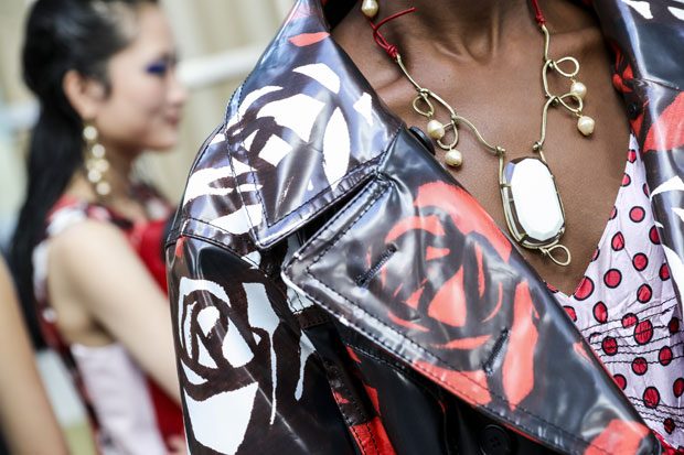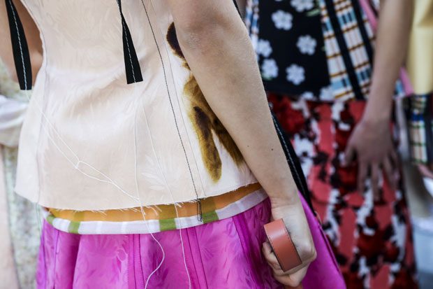 A multitude of women, surfing through a multitude of worlds. They scavenge into trunks full of objects, finding items that belong to different individuals and carry different stories: Fifties bathing suits and dressing gowns, humongous polo shirts and sumptuous skirts, outsized pants and impalpable slip dresses. They play, dissect, adopt, adapt. Joyfully. They magnify, distort, distress, glorify. Spontaneously. Their idea of beauty is a bizarre cocktail: shaken, not stirred. The ingredients range wide: couture nods and Twenties languors, balloon poises and skaters’ slouch, ravers and flappers. – from Marni