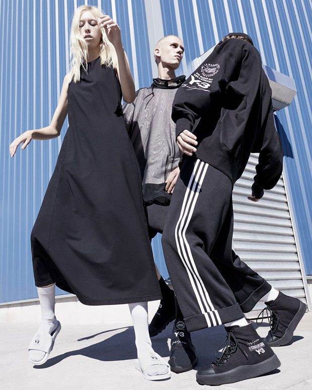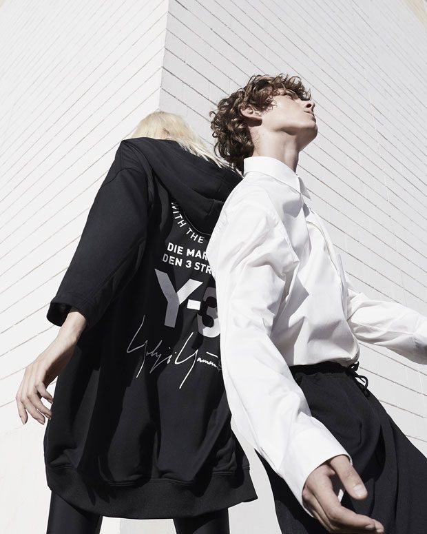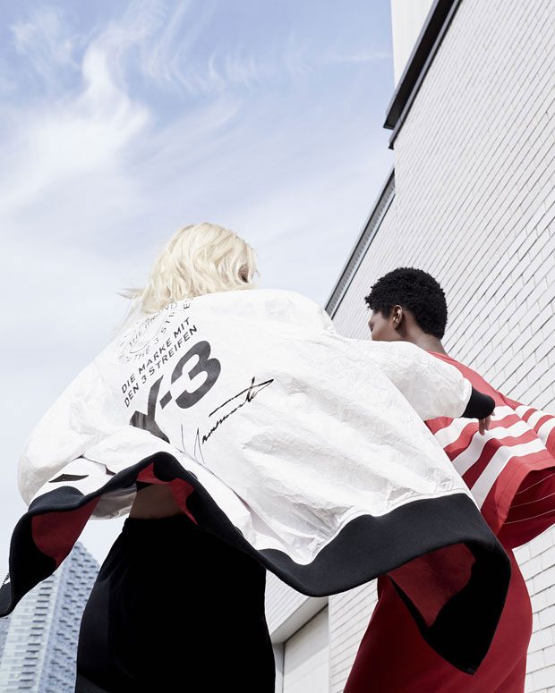 Chapter 1 captures a dynamic energy as models stalk the urban outdoors in the season’s bold graphics. Poetry meets punk as models communicate a modern strength and grace against a gritty industrial backdrop. They delicately fall into each other to create unique contorted shapes that Bolzoni captures from surprising angles. The stark imagery complements the simple graphic emblazoned across the collection: a stacked logo motif combining the Y-3 logo, Yohji Yamamoto signature, and the slogan “brand with the 3 stripes” in multiple languages. Stamped across coach jackets, street kimonos, hooded sweaters, sling bags, and Adilettes, this graphic becomes the collection’s icon and a contemporary symbol of the Y-3 collaboration. – from Y-3