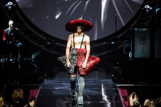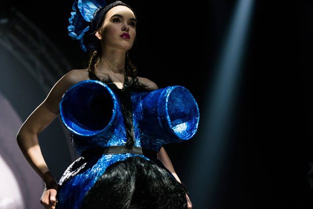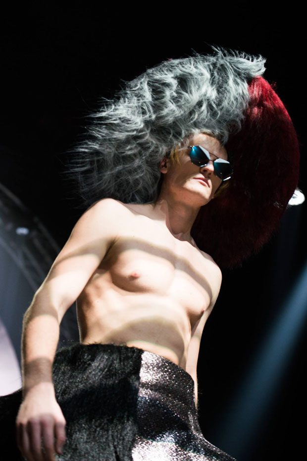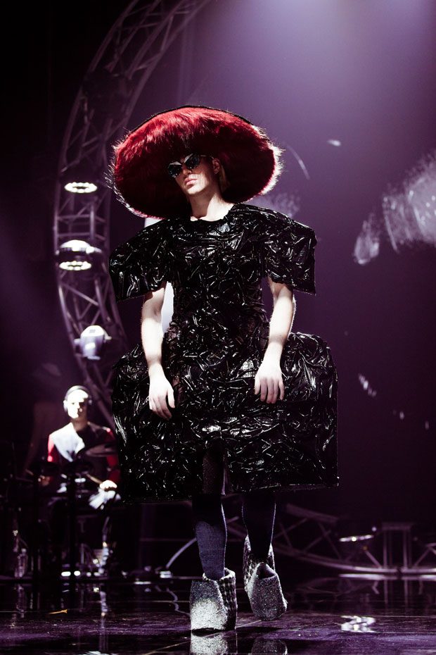 Within the collection the artists emphasized on the concept of staying beyond the human body, adjusting to extraordinary shapes, assuming the latter is a natural state. Its concept of silhouette and the eccentric forms is an integration of body and garment through mutual metamorphosis. The collection has become the presentation of images of the people of the future – warriors antagonizing the system, commonplace and boredom by means of their unusual outfits. Thus they are victorious due to the fact of being courageous enough to change and stay out of frame. For the sake of collection according to their tradition Beissoul & Einius resorted to different materials which could be hardly combined or with no reference towards fashion. Glassware, artificial fur, latex conveyed vigor to their collection and made it full in size. The key material were numerous overlaid tissue paper sheets, tightly pressed together, transforming the clothing into peculiar texture. – from Beissoul & Einius