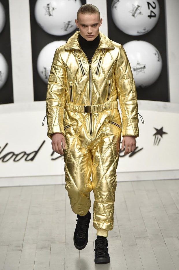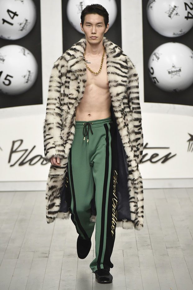 Reflecting the ‘loaded expectancy’ of the current generation, the lottery provides a get-rich-quick escape plan in an era defined by instant gratification. Exploring the theme of quick wins and ‘loadsamoney’, Blood Brother looks at the sinister side of immediate excess. The vulgarity and overindulgence that comes with a huge windfall, blowing it all on monogrammed swimming pools, souped up custom motorbikes and a helipad. Graphic prints continue to be a key feature of the Blood Brother style, featuring scratch cards, player receipts and symbols of ostentatious success such as the ‘Hot Tub Club’ and ‘Money Bags’. Satin suit pieces in retro jewel colours, featuring the ultimate extravagance – a pet tiger, paying homage to the depressing faded opulence of Las Vegas. Taking inspiration from a lifestyle of excess, the collection references 80’s ski wear, exotic animals and the ultimate ‘new money’ style icons – the gangsters. Diamond quilted puffas and ski suits in Rolex green and metallic gold, gives a nod to luxury Chesterfield sofas, whilst oversized ski salopettes and chalet knits in chenille wool complete the apres-ski look. The theme of garish luxury is realised in clashing animal faux furs and snakeskin prints that are in perfect contrast to the menacing simplicity of the leather ‘gangster fit’ coats. Repeat print Swarovski crystal embellishment across crisp white denim and luxurious tracksuits reflect the outlook of those with a penchant for life in the fast lane.- from Blood Brother