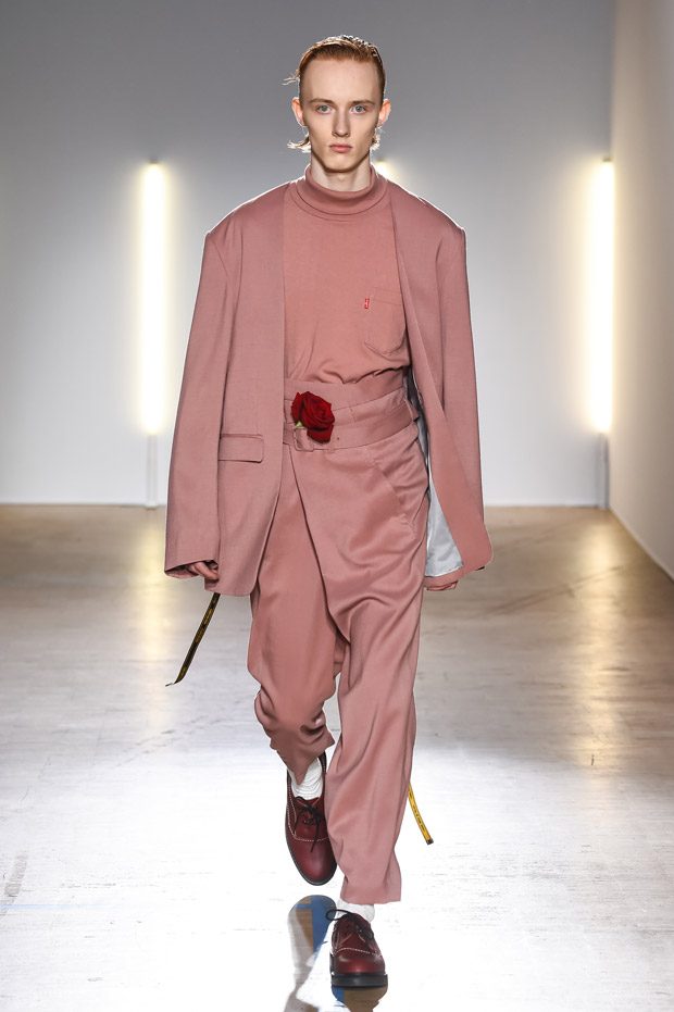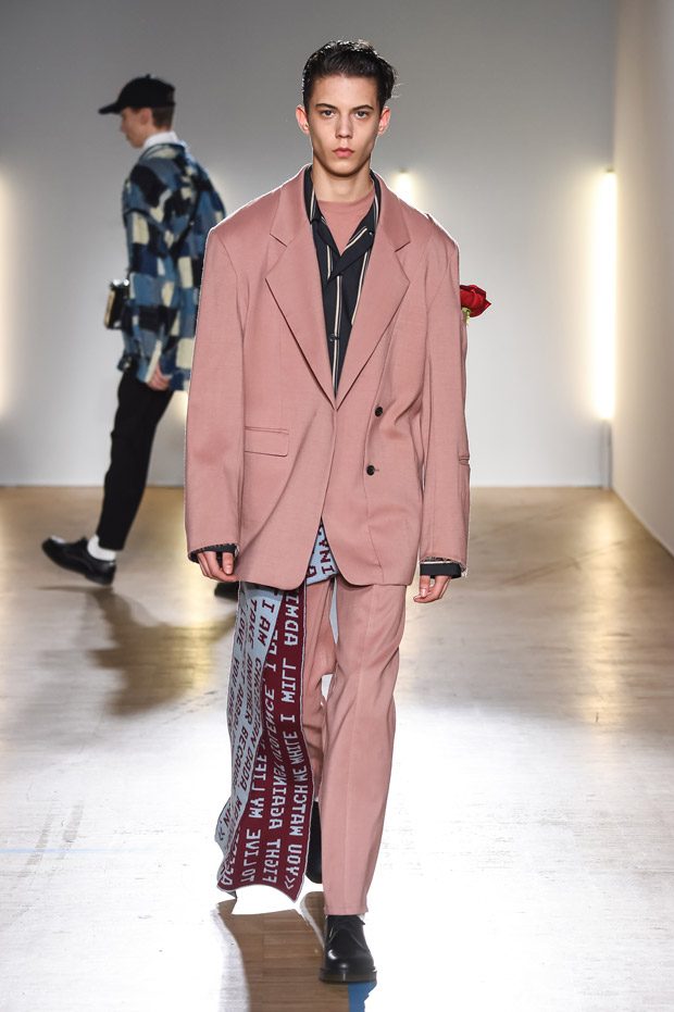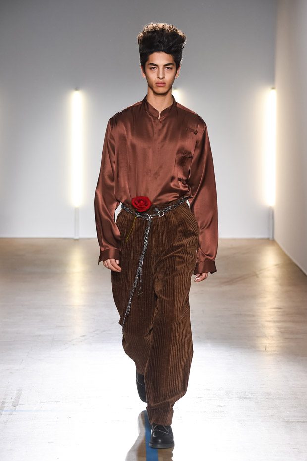 “While David Lynch’s oeuvre’s influence is unmistakable with the graphic motifs highlighted in the collection – rose motif from the movie Blue Velvet embroidered on satin souvenir jackets and jacquard-knitted on the front of sweaters–, Morikawa continues to stay true to his design ethos of blending Eastern and Western design elements: tailored jackets and overcoats cut with kimono-inspired collars, a chic Eastern ethnic gesture to the otherwise Western silhouettes.