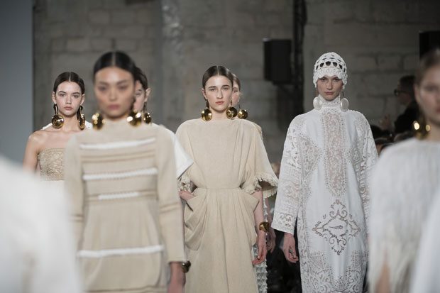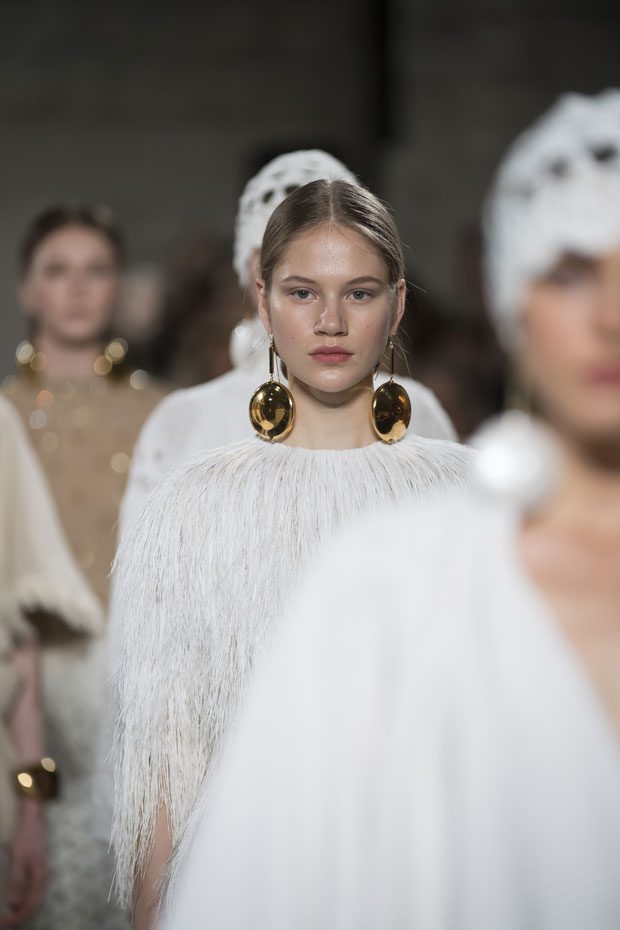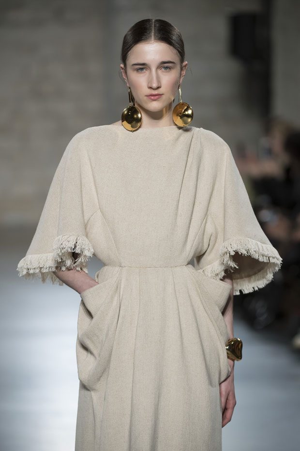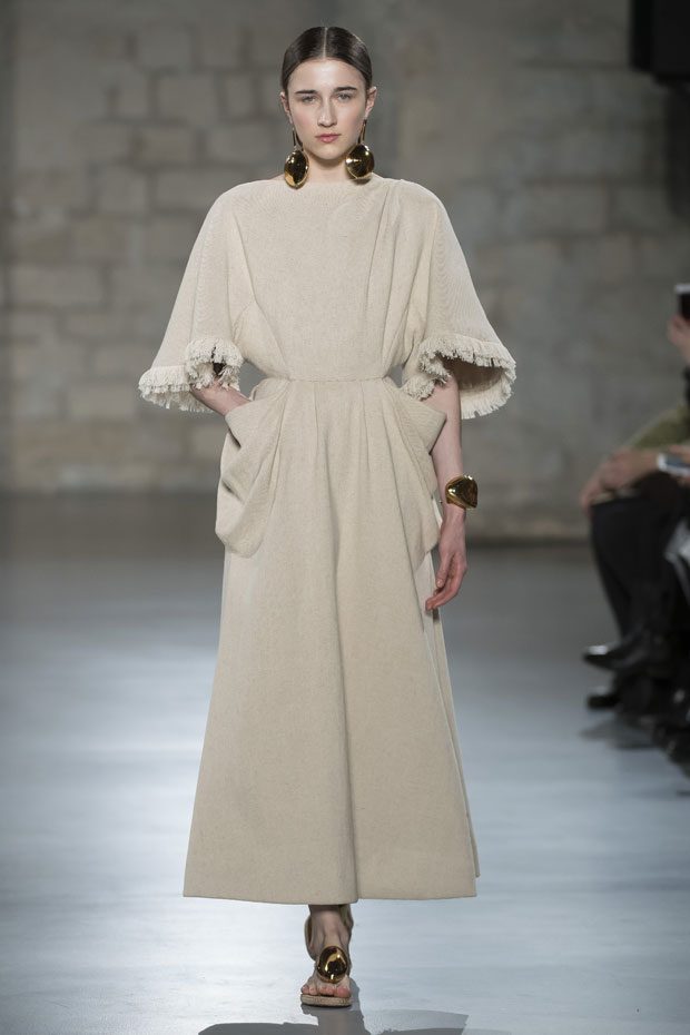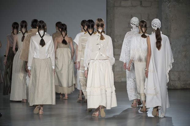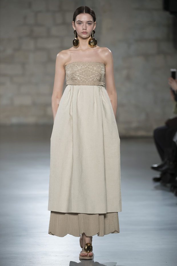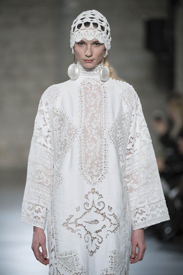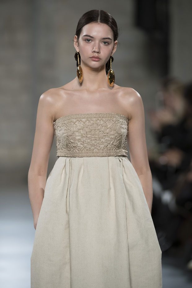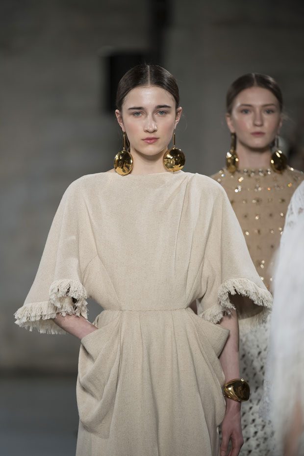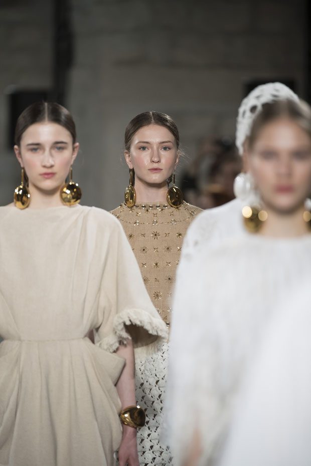 Beyond the derisory din of time, Nature, in its eternal, humming renewal, offers variety in its long-term, unchanging modernity… The Christophe Josse spring/summer Couture collection is a pastoral ode to the emergence of a world of diaphanous lightness and exquisite dawns, where shepherds in long homespun cloaks pace tranquil, radiant fields far from this sombre commotion. Christophe Josse takes us on a dreamlike journey through a contemporary fantasy Arcadia, where laces typical of Thomas Hardy’s Dorset peasant women mingle and echo each other in sure harmony with honeycomb taffetas, linens woven in contrasting shades of amber and wheat, embroidered motifs from Central Europe, the Middle Atlas and Peru, and the diffuse gloss of washed leather satins. He extols refinement, contained fluidity and impromptu mixes of materials, making play on their contrasts. Beneath his caressing lines, he traces the furrow, the real measure of true beauty. – from Christophe Josse