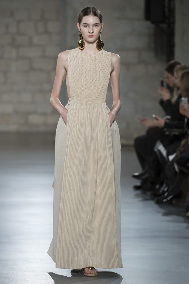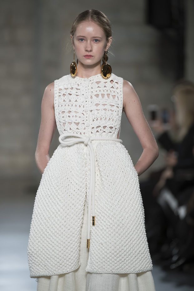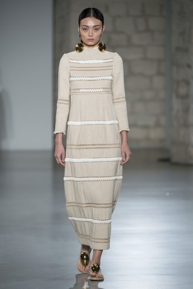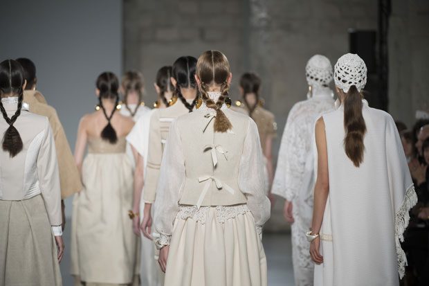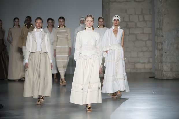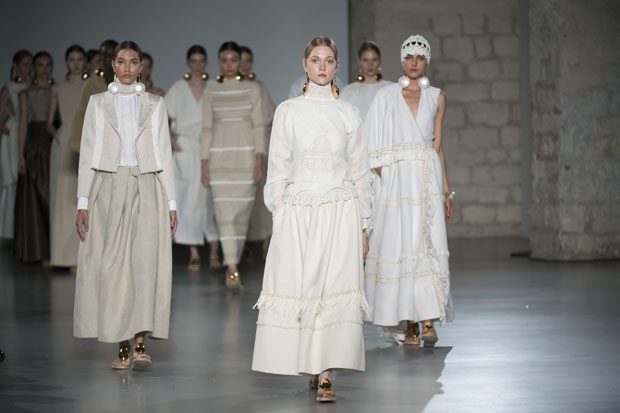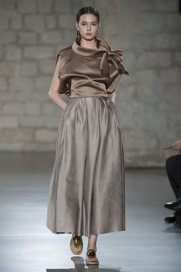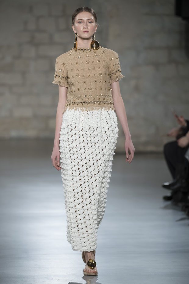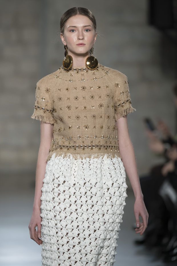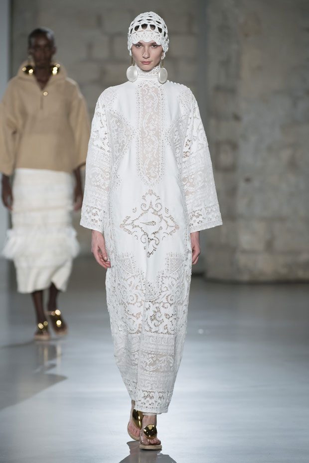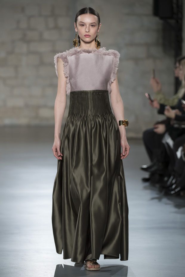Beyond the derisory din of time, Nature, in its eternal, humming renewal, offers variety in its long-term, unchanging modernity… The Christophe Josse spring/summer Couture collection is a pastoral ode to the emergence of a world of diaphanous lightness and exquisite dawns, where shepherds in long homespun cloaks pace tranquil, radiant fields far from this sombre commotion. Christophe Josse takes us on a dreamlike journey through a contemporary fantasy Arcadia, where laces typical of Thomas Hardy’s Dorset peasant women mingle and echo each other in sure harmony with honeycomb taffetas, linens woven in contrasting shades of amber and wheat, embroidered motifs from Central Europe, the Middle Atlas and Peru, and the diffuse gloss of washed leather satins. He extols refinement, contained fluidity and impromptu mixes of materials, making play on their contrasts. Beneath his caressing lines, he traces the furrow, the real measure of true beauty. – from Christophe Josse