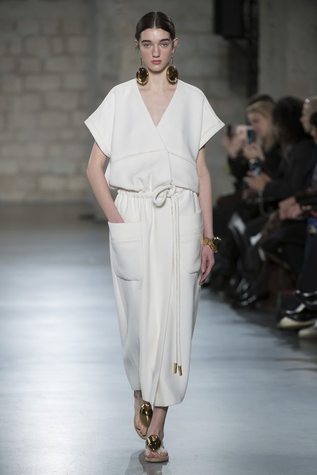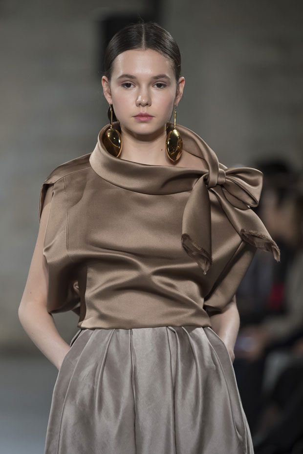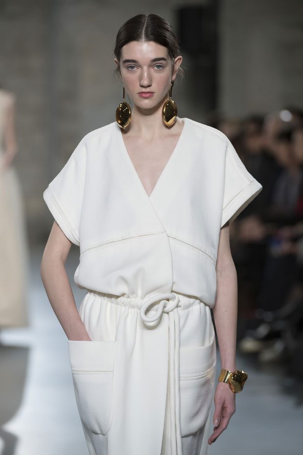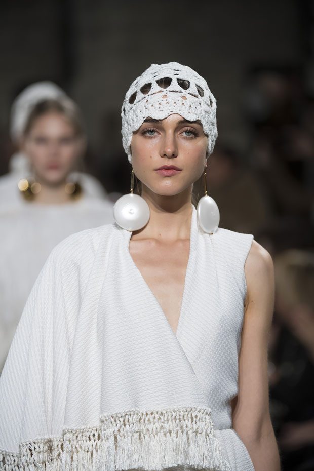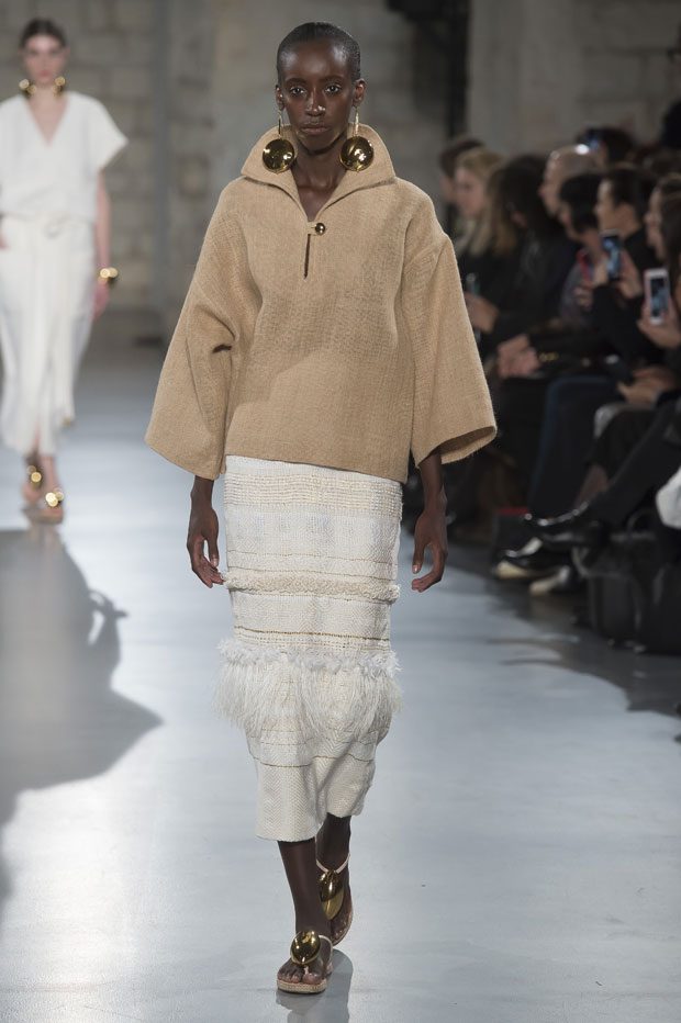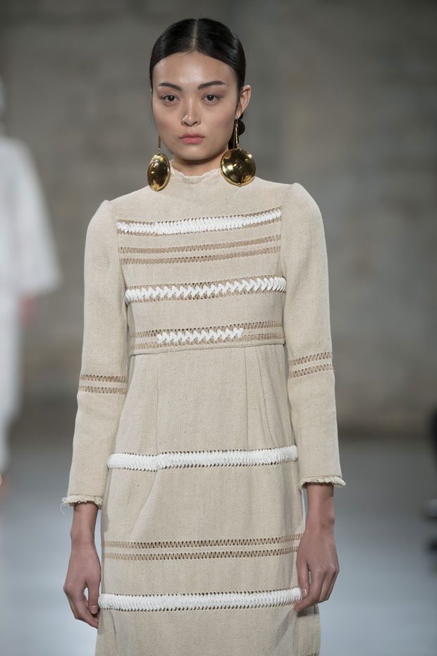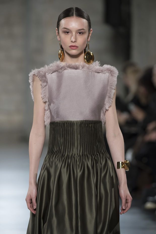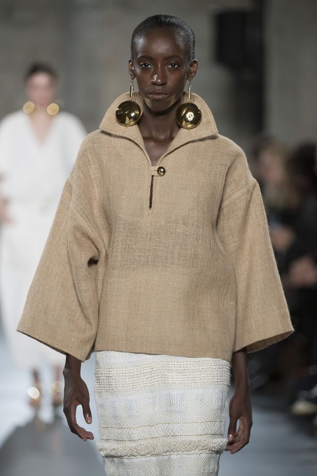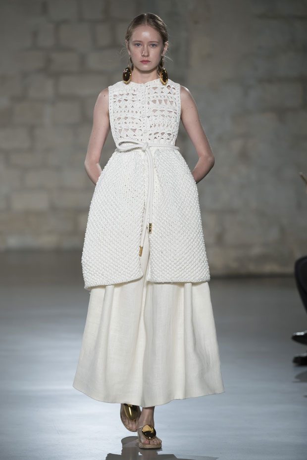 Beyond the derisory din of time, Nature, in its eternal, humming renewal, offers variety in its long-term, unchanging modernity… The Christophe Josse spring/summer Couture collection is a pastoral ode to the emergence of a world of diaphanous lightness and exquisite dawns, where shepherds in long homespun cloaks pace tranquil, radiant fields far from this sombre commotion. Christophe Josse takes us on a dreamlike journey through a contemporary fantasy Arcadia, where laces typical of Thomas Hardy’s Dorset peasant women mingle and echo each other in sure harmony with honeycomb taffetas, linens woven in contrasting shades of amber and wheat, embroidered motifs from Central Europe, the Middle Atlas and Peru, and the diffuse gloss of washed leather satins. He extols refinement, contained fluidity and impromptu mixes of materials, making play on their contrasts. Beneath his caressing lines, he traces the furrow, the real measure of true beauty. – from Christophe Josse