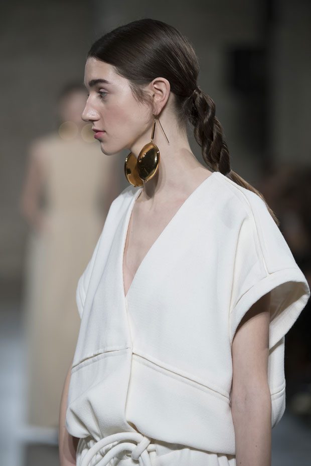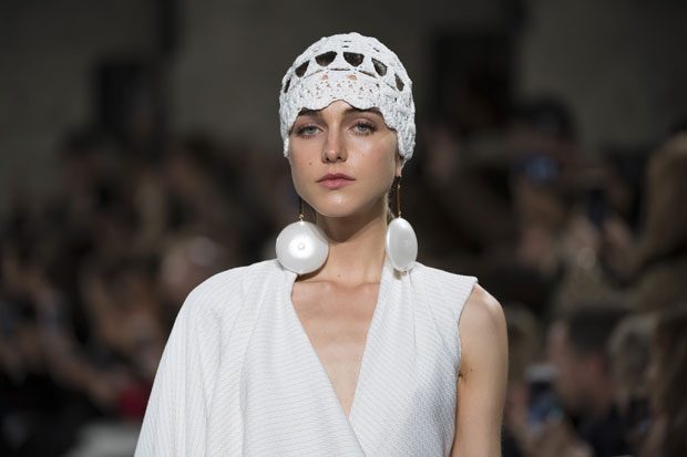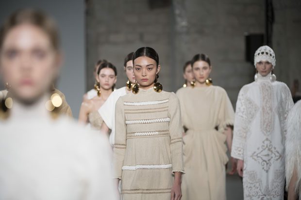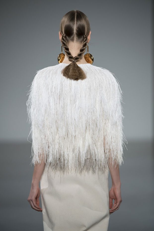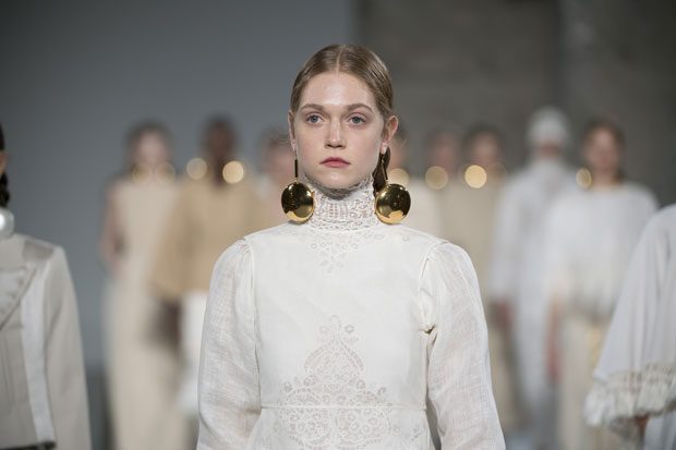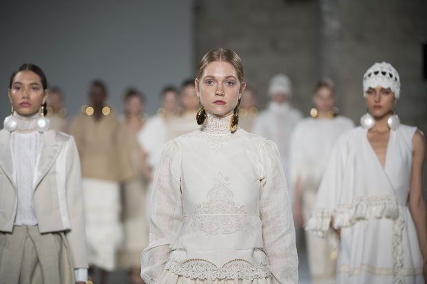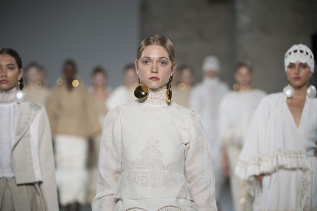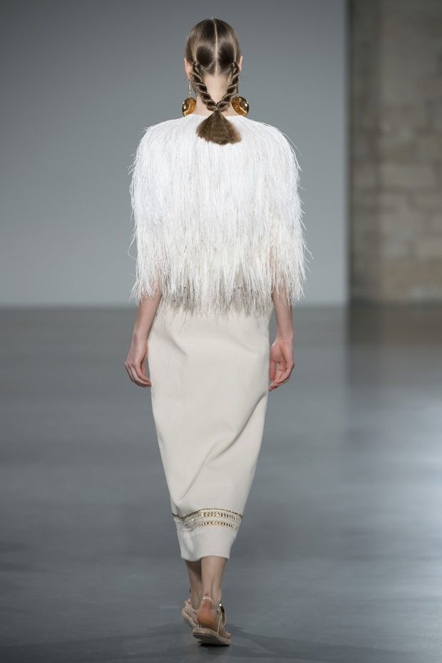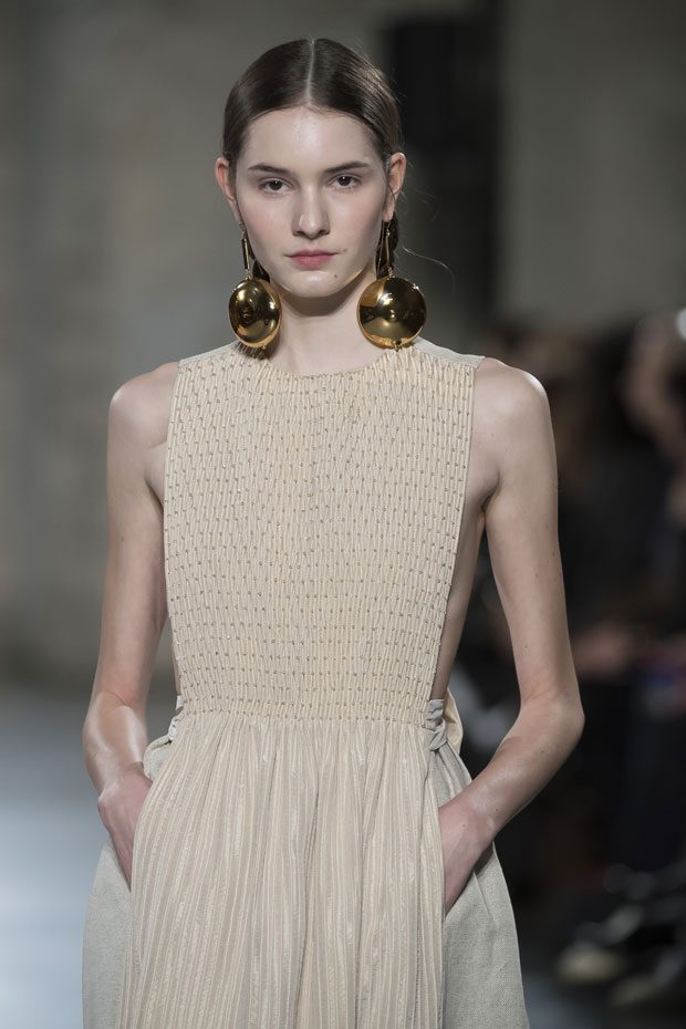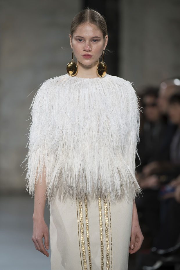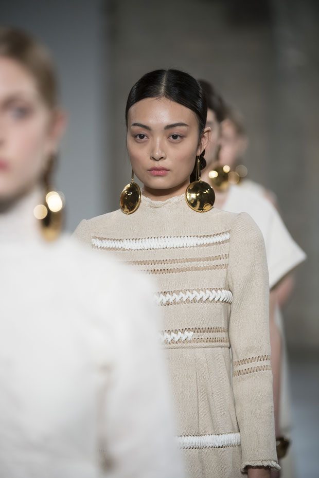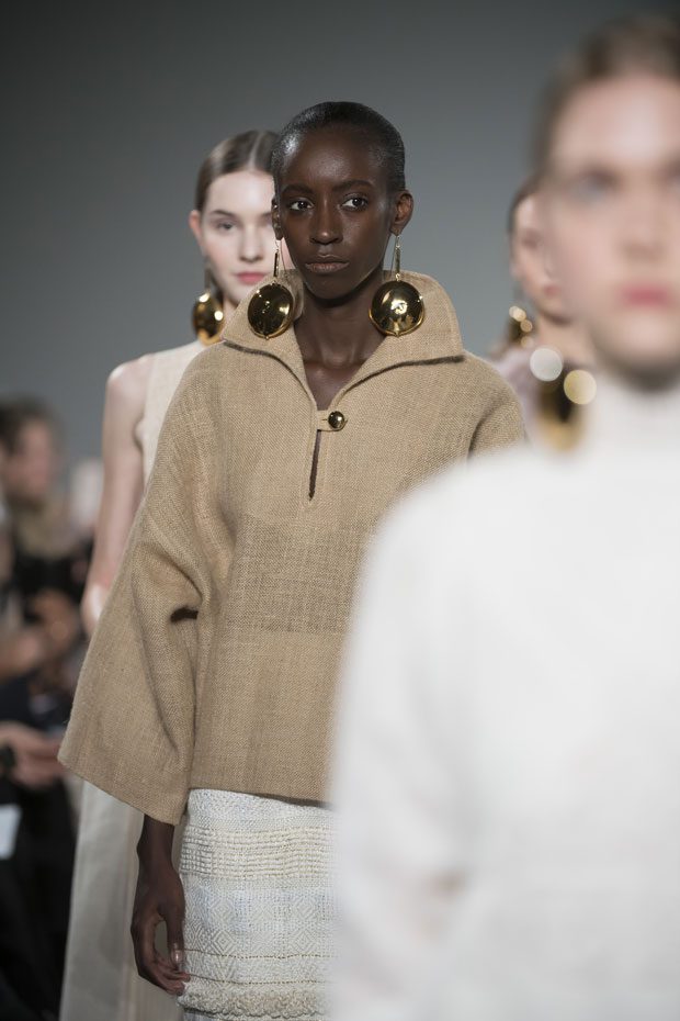 Beyond the derisory din of time, Nature, in its eternal, humming renewal, offers variety in its long-term, unchanging modernity… The Christophe Josse spring/summer Couture collection is a pastoral ode to the emergence of a world of diaphanous lightness and exquisite dawns, where shepherds in long homespun cloaks pace tranquil, radiant fields far from this sombre commotion. Christophe Josse takes us on a dreamlike journey through a contemporary fantasy Arcadia, where laces typical of Thomas Hardy’s Dorset peasant women mingle and echo each other in sure harmony with honeycomb taffetas, linens woven in contrasting shades of amber and wheat, embroidered motifs from Central Europe, the Middle Atlas and Peru, and the diffuse gloss of washed leather satins. He extols refinement, contained fluidity and impromptu mixes of materials, making play on their contrasts. Beneath his caressing lines, he traces the furrow, the real measure of true beauty. – from Christophe Josse