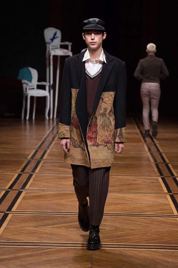 “Henri Alexander has refined and twisted reoccurring symbolism from the brands DNA once again, with parliament light and American spirit heels. Kandinsky and Magritte referenced checks teamed with century old tapestries that have been cut up and reformed into sharp fit teddy boy tailoring alongside full velvet and corduroy suits. A garment is a garment and a violin is a violin, but when examined through Henri Alexander Levy’s temperament the garment acts inconsequently as a reducer of meaning, excusing and sanctioning the power of the creative demon.