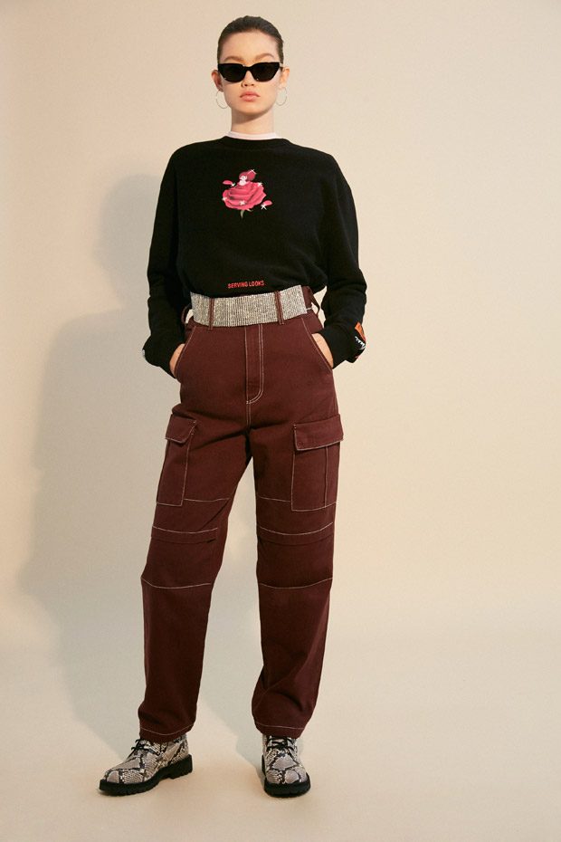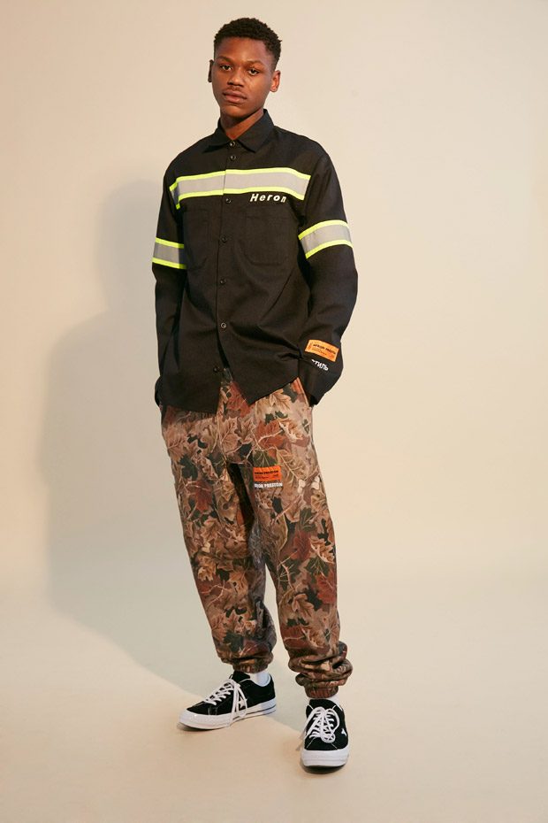 “Graphics in the new collection bestow pseudo-titles like “Influencer” and “Public Figure”, a playful take on the intensely curated self-display that we see en masse on social media, meant to be worn and made visible in meta-context. The labels appear across the front of camouflage pants—with a new take on the print that focuses on leaves with rich colors—as well as on denim jackets and polos. “If you buy a polo from Heron Preston you are an influencer,” the designer jokes. “Who is to argue that?”