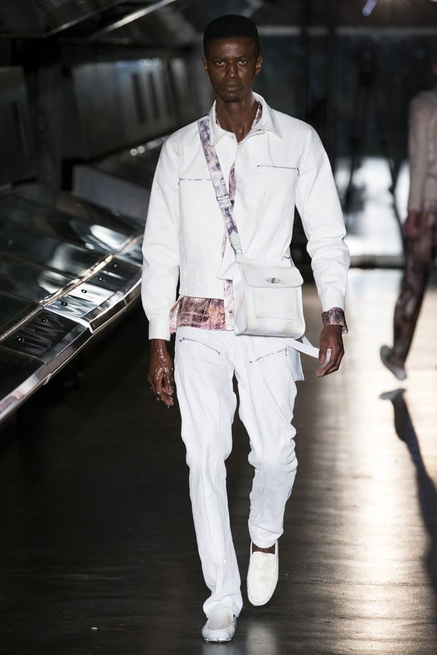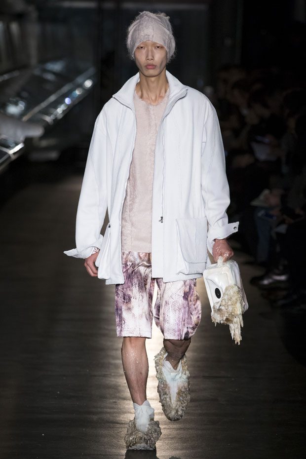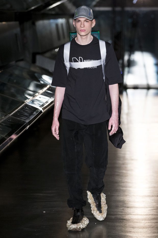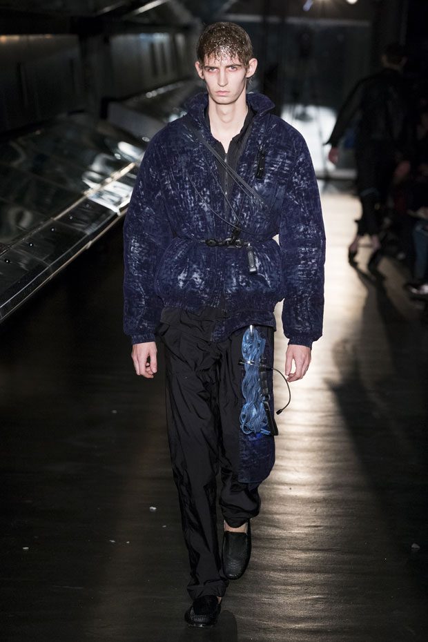 Autumn Winter 18 emerges from subterranean lakes of the Krizna Jama cave network. The technical equipment of miners and cavers evolves with the organic structures and phosphorescent colours of the caves. Merino wool is pulled and distressed to form base layers and accessories. Mulberry leather bags are recoloured, textured and polished. The tension between natural and synthetic, real and artificial, remains central to COTTWEILER’s design practice. – from Cottweiler