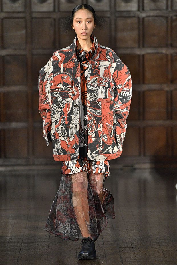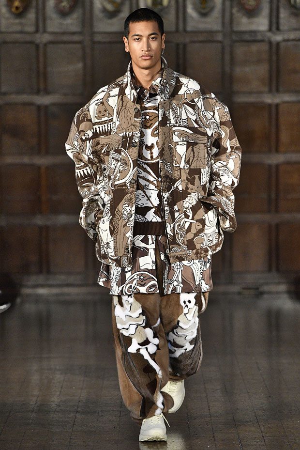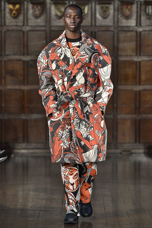 Edward Crutchley presented his Autumn Winter 2018 collection during the first day of the London Fashion Week Men’s. Looking to the past and the present for visual cues, the collection is mainly inspired by folk religion, mythology, philosophy. Shapes take inspiration from cultures across the the world and through the ages; YSL’s ‘Scandal’ collection, chi poa, Les Incroyables,1960’s Mod dresses, zoot suits and the L.A. riots of 1943, TLC’s ‘Creep’ video and early 1980’s Armani and the beginnings of Power Dressing.