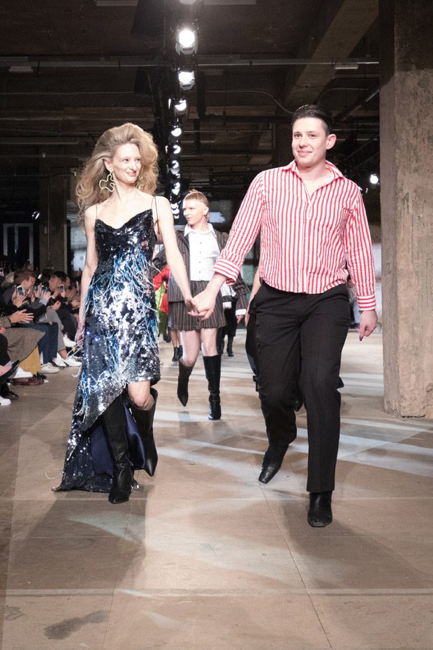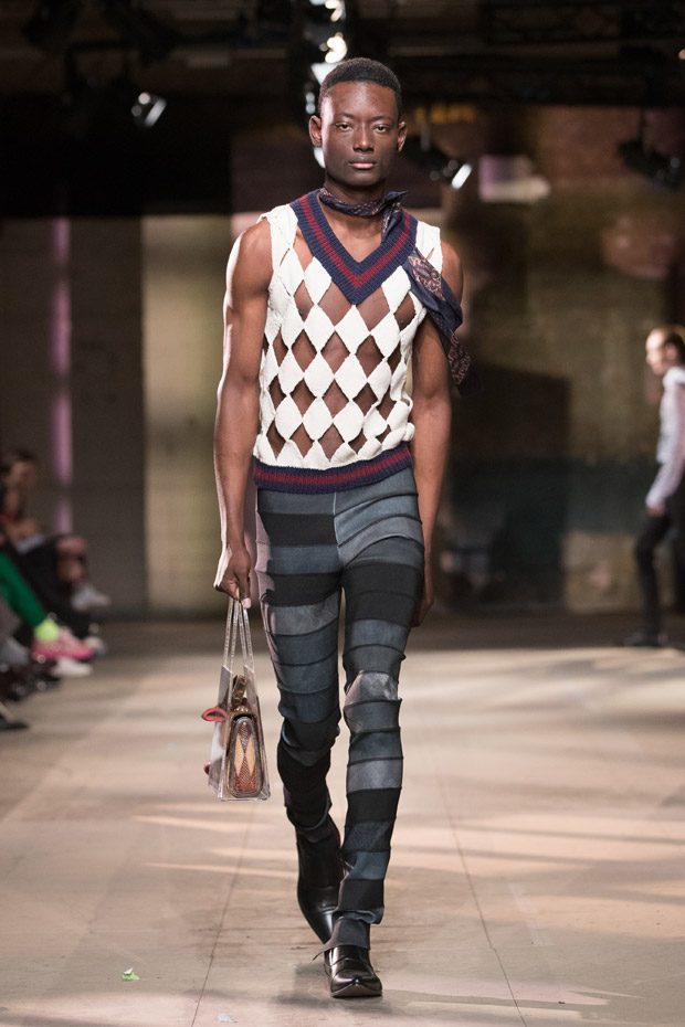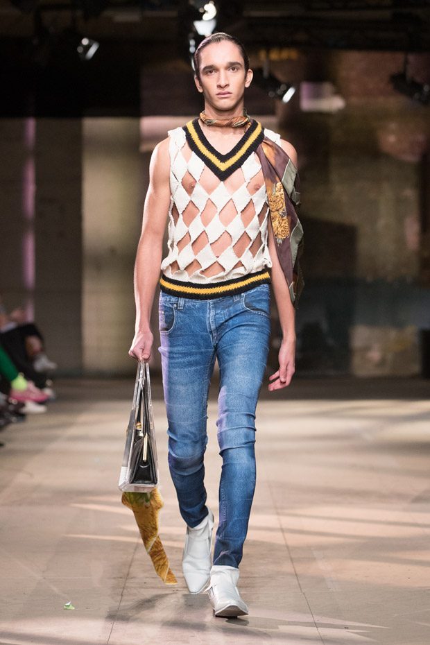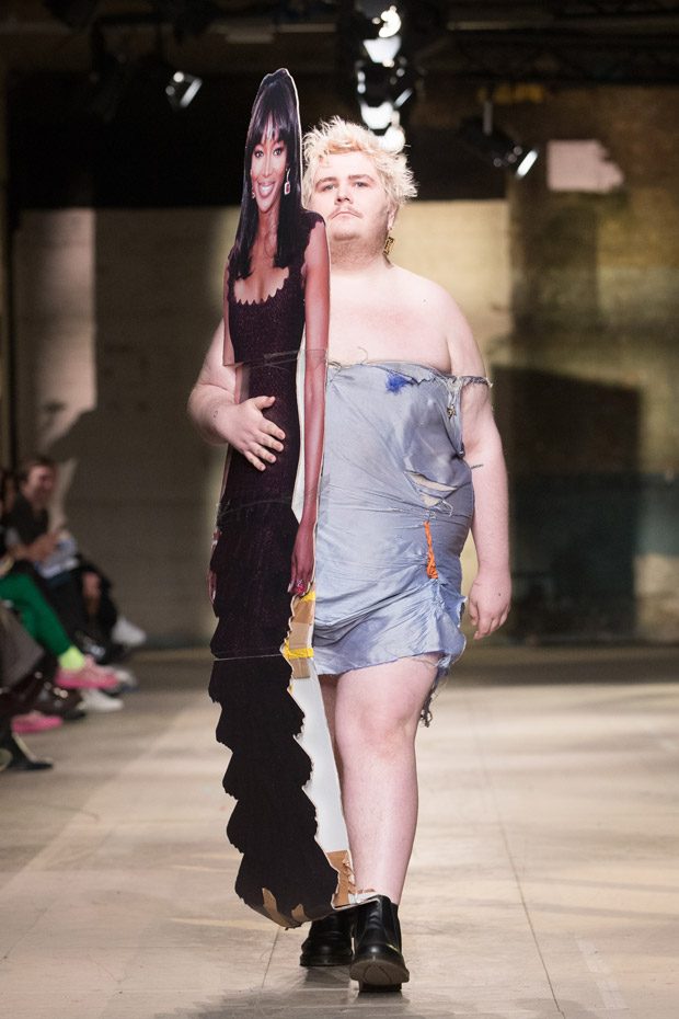 “Rottingdean Bazaar is the brainchild of dynamic duo James Theseus Buck and Luke Brooks. Working together since 2015, the label was born upon moving to the seaside village of Rottingdean in East Sussex where their work took shape around a perversely original use of found objects. The pair also work as art directors and stylists, producing shoots for Man About Town, i-D, Buffalo Zine and Dazed. AW18 is Rottingdean Bazaar’s fourth season with the support of Fashion East and their second catwalk show as part of MAN.“