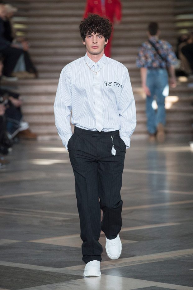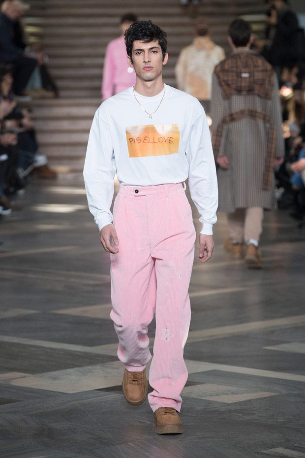 “A cast of current students walks the Autumn Winter 2018 runway within the walls of the university of Milan, their clothes bridging the shackles of institution with the quiet rebellion of the individual. Ceremony meets utility – banker’s suits, satin shirts and boyish sportswear are mixed and matched with the new MSGM jeans collection, where parkas, cropped jeans and jogging shapes are cut in washed blue denim. In felt wool, fleece and nylon, block paneled puffer jackets and tailored coats are spliced with college patches, whilst Italian schoolboy graffiti tags become new MSGM mottos on tees and embroidered workwear badges.“