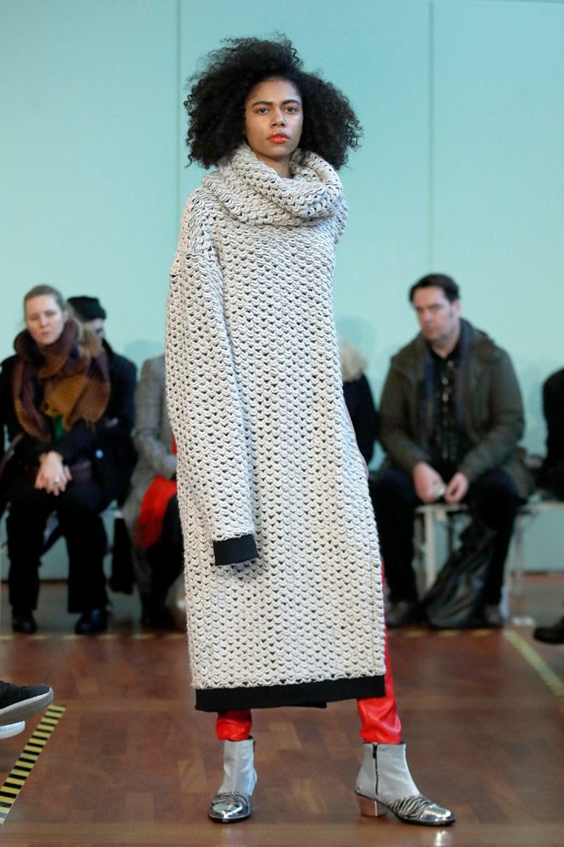 Austrian designer Rebekka Ruétz presented her Autumn/ Winter 2018/19 collection “Riots Daughter” on the 17th of January 2018, the second show day of Mercedes- Benz Fashion Week Berlin. As location, the Austrian embassy was chosen. This special setting underlined the very special flair of this collection. Being significant for this collection is its very playful, creative and urban- cool character. Those unique pieces seem to be made for the coolest kids in the block. Due to their fun prints, such as “RIOTS NOT DIETS“, “NOPE” or “UNSTOPPABLE” and eye- popping nuances, for instance metallic blue (our absolute favourite) or lime green those creations certainly stay in mind.