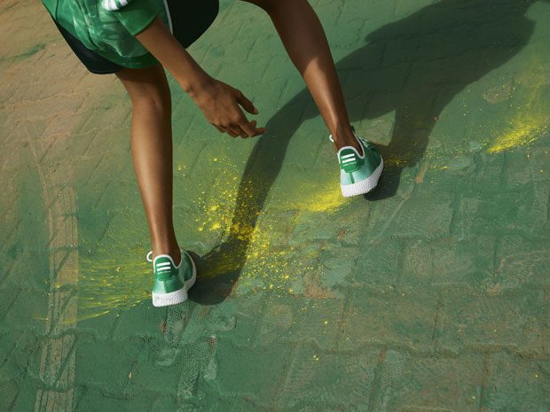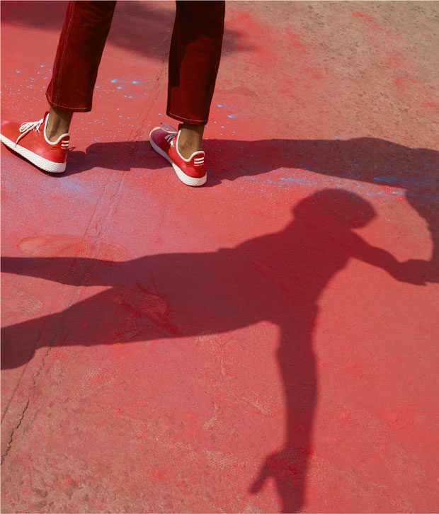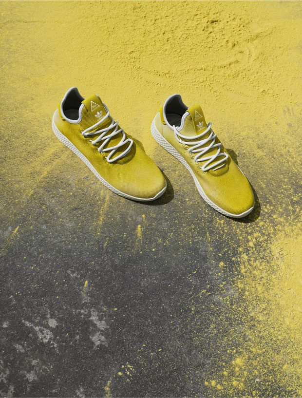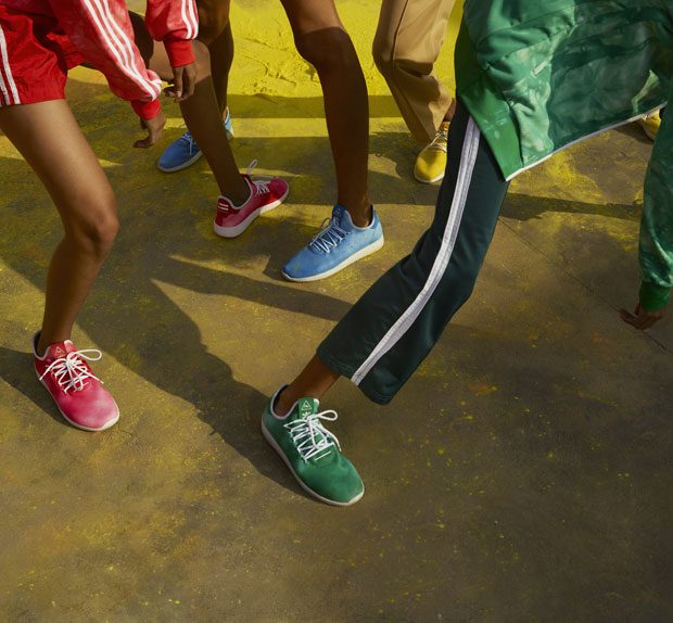 This third and final chapter of the Hu Holi story delivers apparel and footwear in the playfully iconic adicolor palette of blue, green, yellow, and red—a cultural icon for the streets. A riot of bold primary hues, the range channels the soulfulness of the adidas Originals by Pharrell Williams collaboration, reflecting Pharrell’s founding vision of color as an equalizing force among peoples. Graphic and bright yet simple in composition, Hu Holi adicolor pieces feature bold tone on-tone combinations. They exude an honest and playful vibe, able to be worn and styled for multiple occasions. The product and the colors are equal heroes in the design—striking in both texture and saturation. The collection features four track essentials: the top, tee, shorts, and pants. In footwear, the sleek Tennis Hu Pk pairs its adicolor powder-dyed uppers with a contrasting crisp white leather lining. With his vision of an adidas icon—filtered through the inspiring narrative of the Holi Festival—Pharrell issues yet another powerful, magical chapter of Hu. – from adidas Originals
