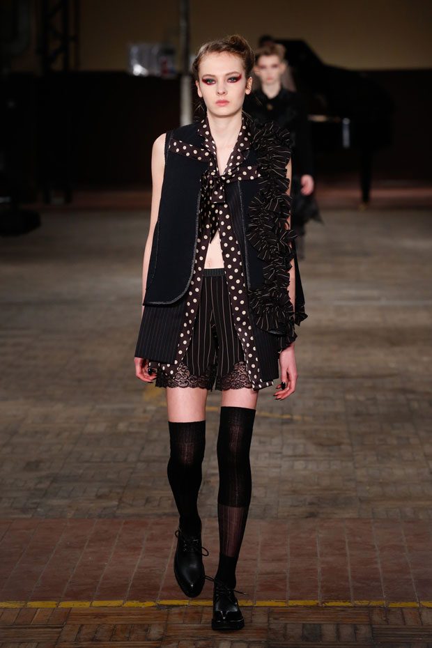 Both men and women are taking on a note from the text book of 60s teenagers, with an array of blanket check materials, a-line skirts and varsity knits. When it came to womenswear for a shorter trim, Marras and his team display socks in chic black with chunky shoes or elegant boots. Length is no issue, since the new collection even spotlights floor length dresses, just like the designer and his team bring back a sublime silk polka-dott pattern floor length dress to the stage.