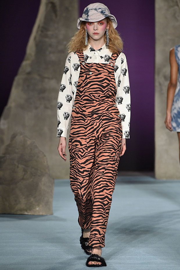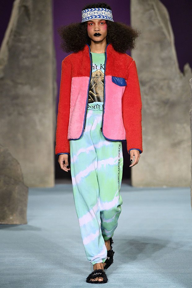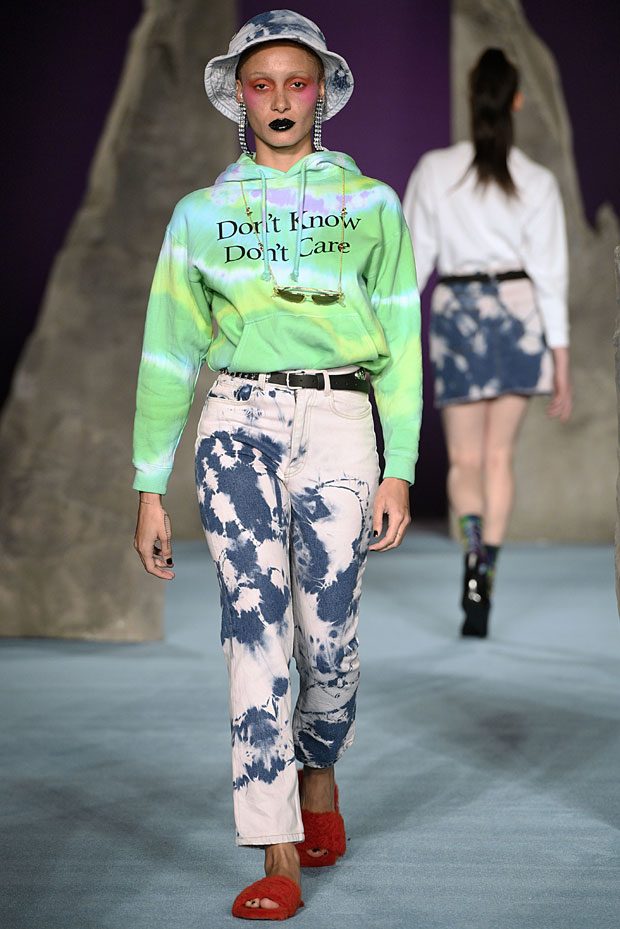 Oh New Years eve, the Ashley Williams girl made a pact to ditch technology and set about exploring the UK and all its monolithic marvels. Grabbing her charisma, uniqueness, nerve and talent she hopped on board a passing Megabus for a life enhancing expedition as a modern antiquarian. Whilst on the road, she realised she hadn’t packed appropriately so she swerved towards local hiking shops and set about customising their practical clobber en route. Like a delectable druid or an extraordinary Odinist, she would tie dye her dungarees whilst visiting breathtaking ruins, back in the glow of the summer solstice while studding her sliders with trademark diamanté slogans, and dance on the cusp of a Highland spring whilst sporting a landing neon fleece and bucket hat combo.