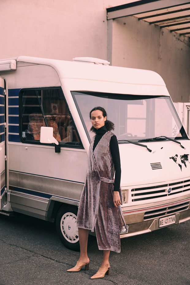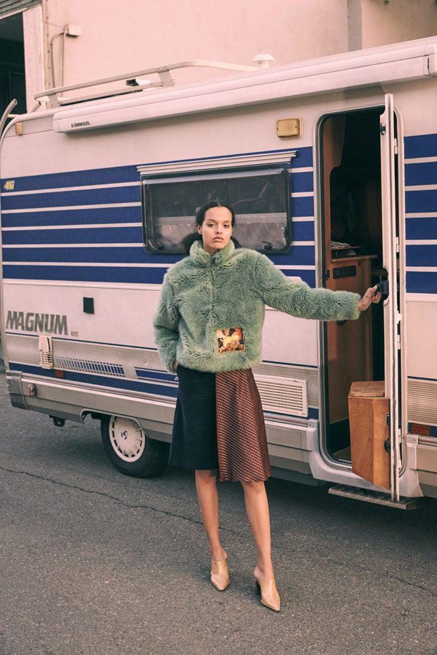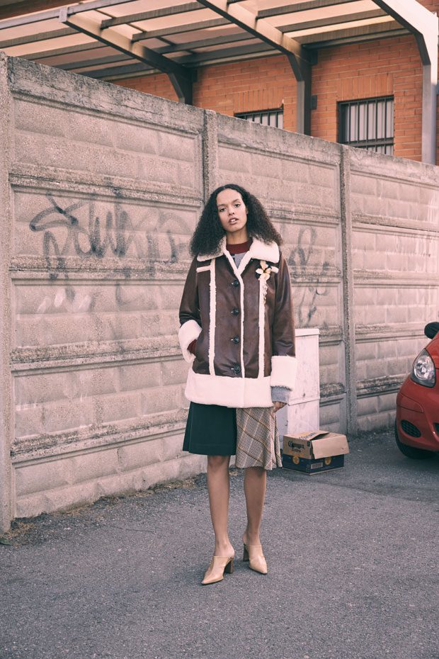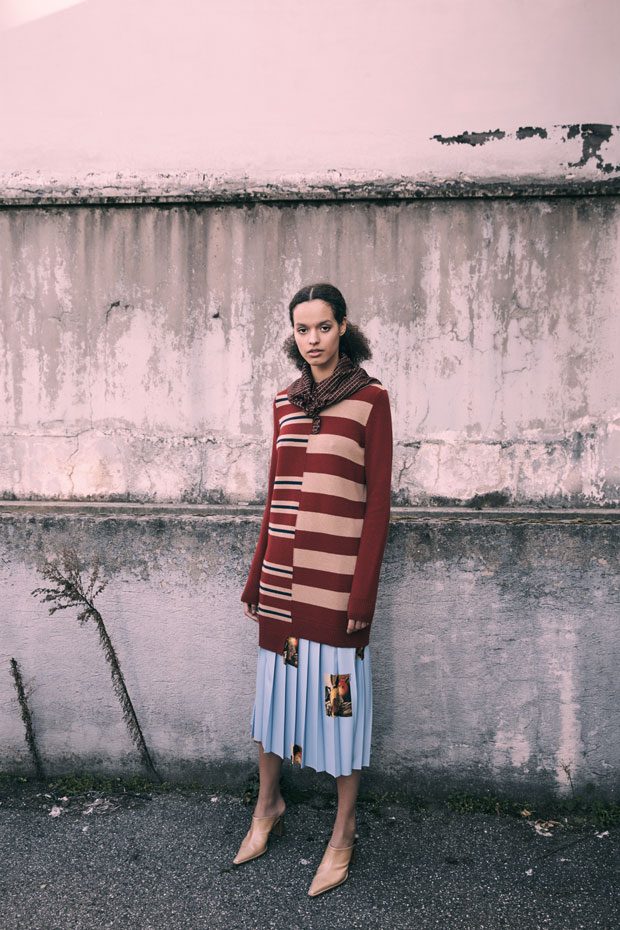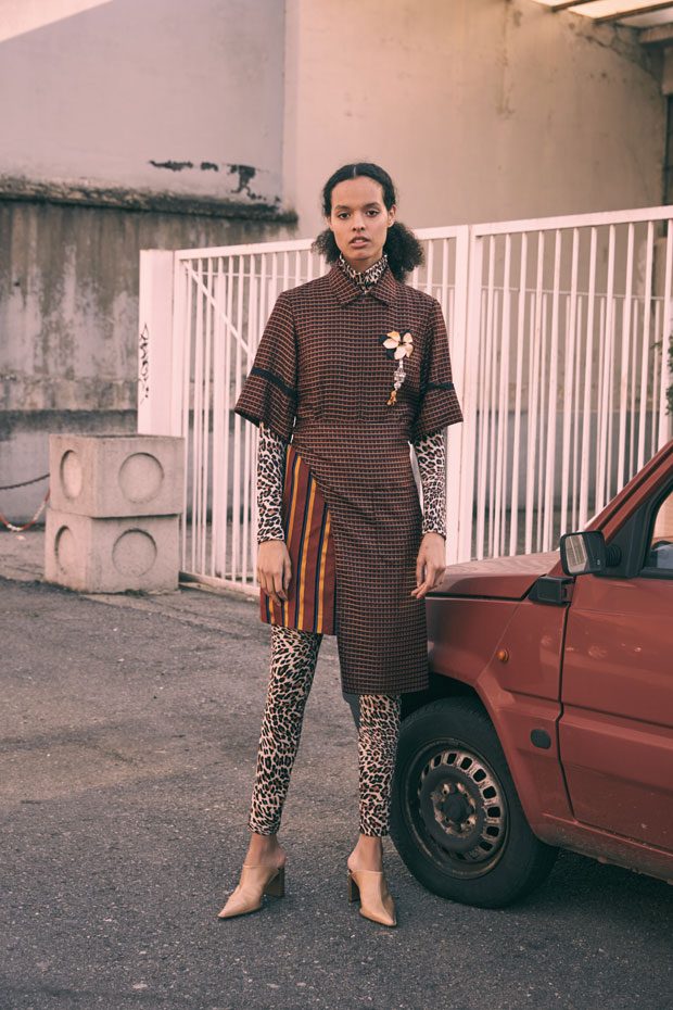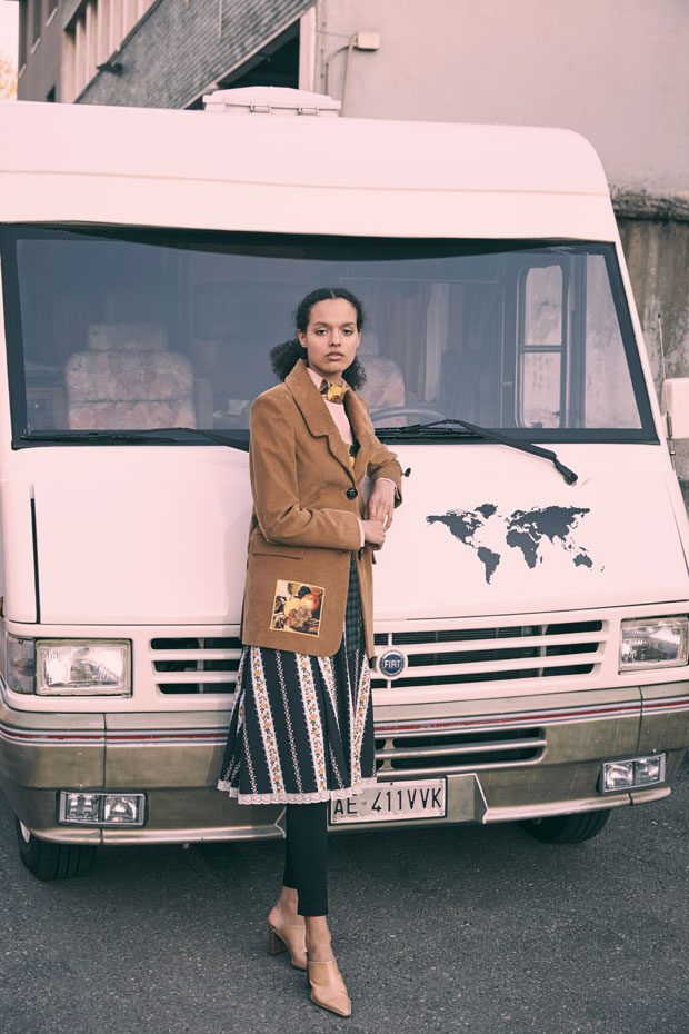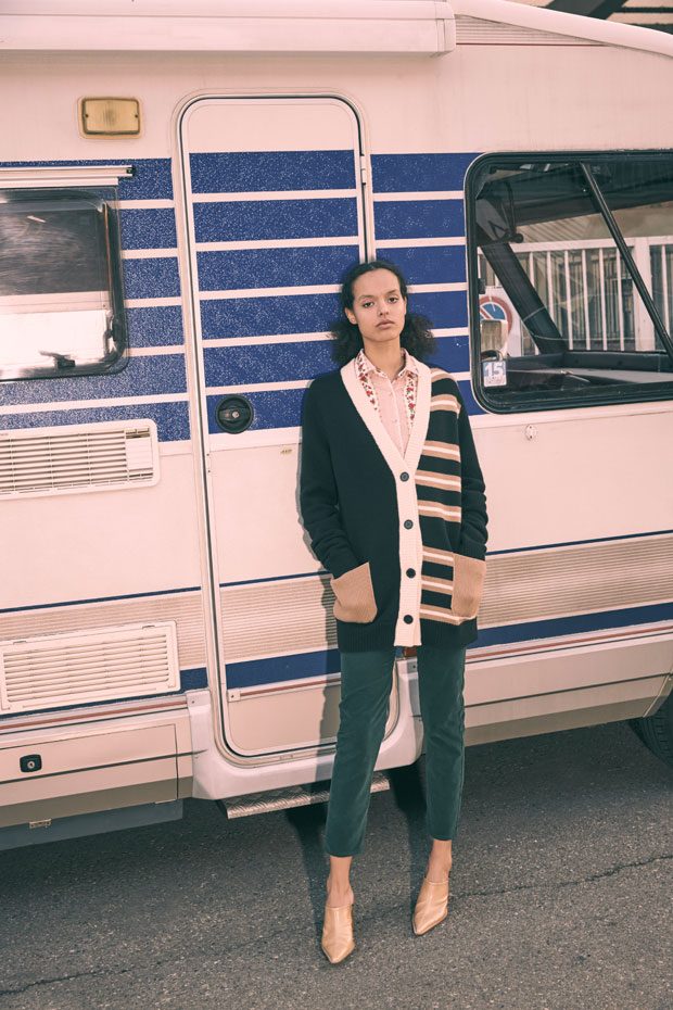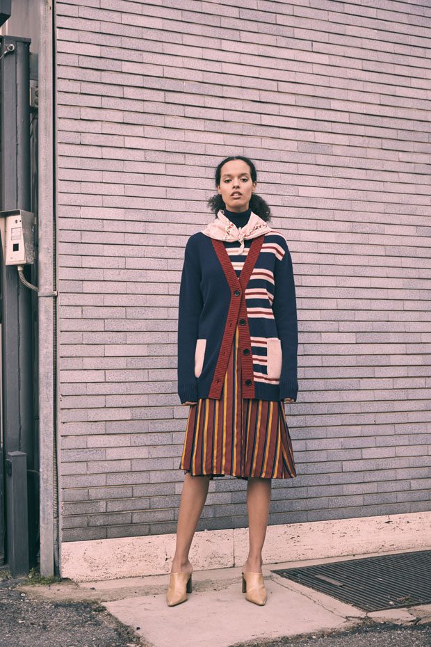 Different places and cultures, not completely defined, and a melting pot of people and their own styles evoke a gipsy vibe, giving rise to an authentic representation of personal identity. The material research is wide, different fabrics are combined together in a harmonic patchwork: flannels, check woollen fabrics, silk and viscose fluid jacquards, corduroy and vintage-like froissé velvet and faux fur. Wool and cashmere knitwear comes as an interpretation of classic cardigans and jumpers, stripes are interrupted by solid colours, defining a geometric and masculine look but with a relaxed fit. Pullovers and sweatshirts have an incorporated scarf, whose design recalls men’s neckties. The silhouette is defined through layering, showing an organized accumulation of items. Coats and dresses are constructed with overlapping panels and layers in different contrasts of textures. Embroideries come in different styles and materials: crimson red flowers, also combined with crystals for the brooches, small fruits thread embroidered, a playful mix of multicolour sequins and hand stitched plexi drops. The colour palette is mostly warm: Burgundy, saffron, orange, powder pink and camel, tempered by forest green and royal blue. – from Au Jour Le Jour