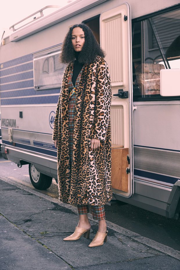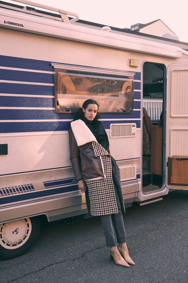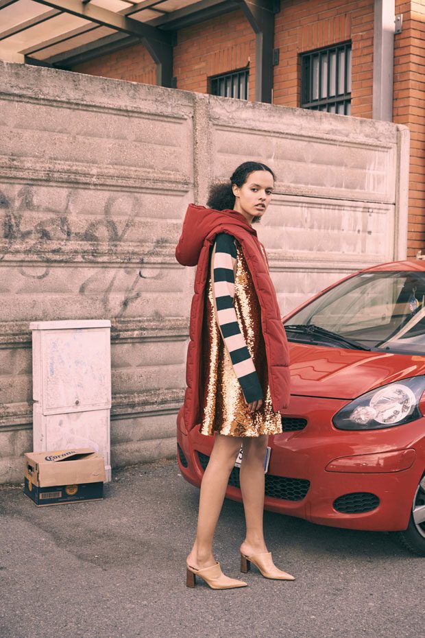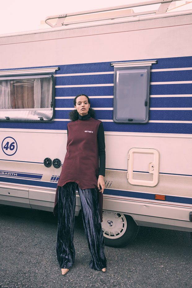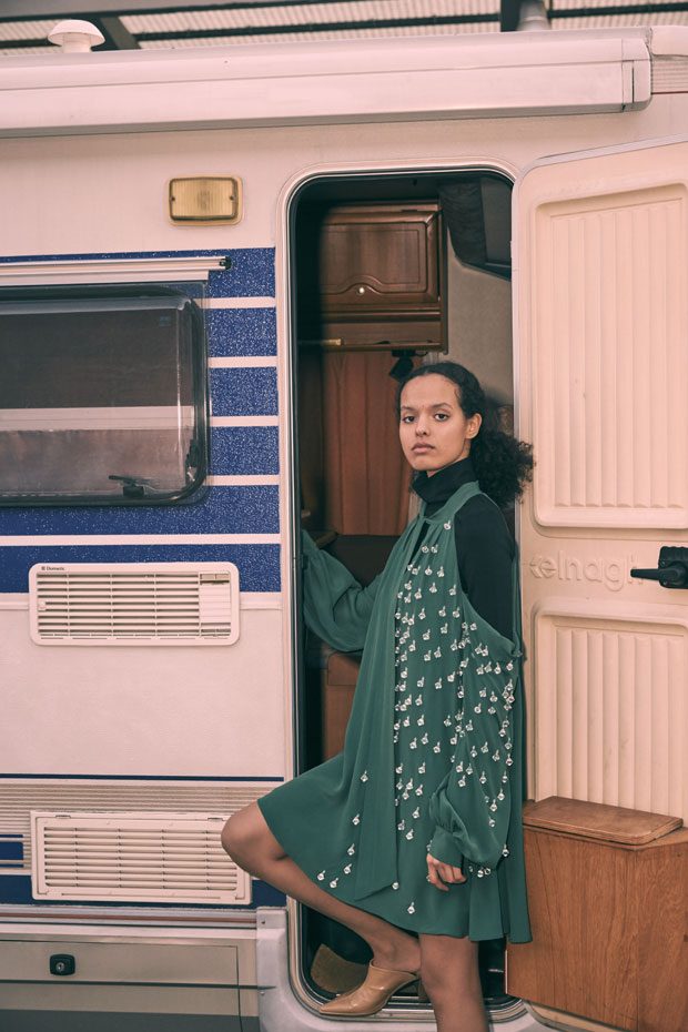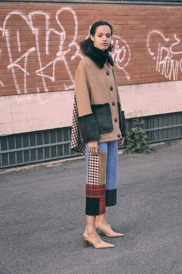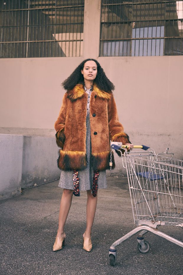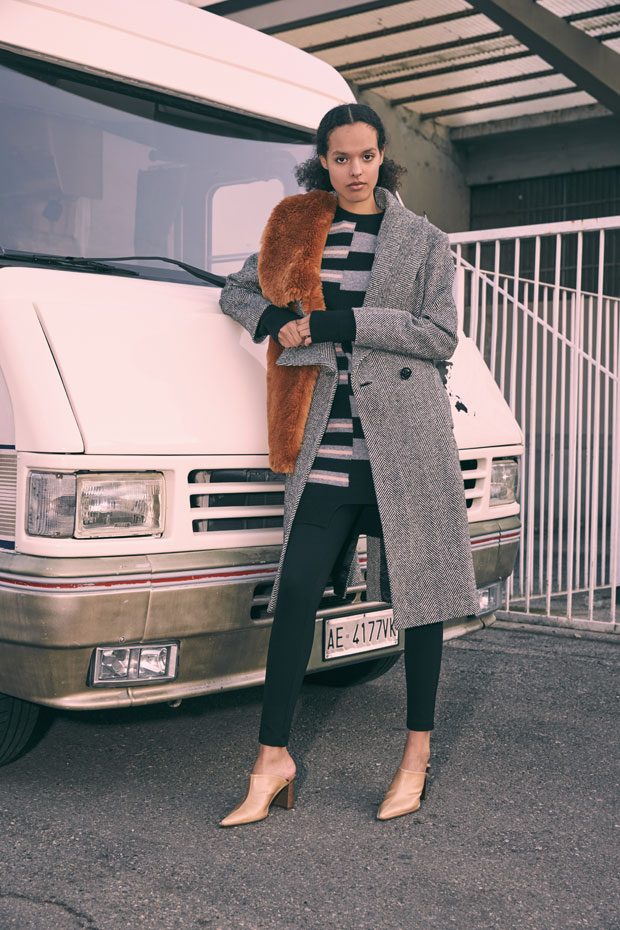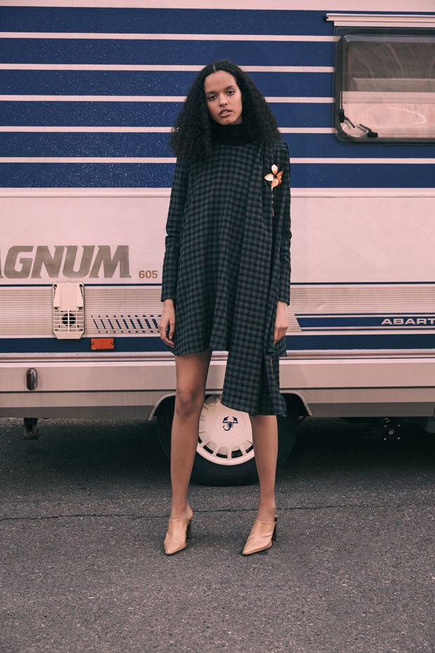 Different places and cultures, not completely defined, and a melting pot of people and their own styles evoke a gipsy vibe, giving rise to an authentic representation of personal identity. The material research is wide, different fabrics are combined together in a harmonic patchwork: flannels, check woollen fabrics, silk and viscose fluid jacquards, corduroy and vintage-like froissé velvet and faux fur. Wool and cashmere knitwear comes as an interpretation of classic cardigans and jumpers, stripes are interrupted by solid colours, defining a geometric and masculine look but with a relaxed fit. Pullovers and sweatshirts have an incorporated scarf, whose design recalls men’s neckties. The silhouette is defined through layering, showing an organized accumulation of items. Coats and dresses are constructed with overlapping panels and layers in different contrasts of textures. Embroideries come in different styles and materials: crimson red flowers, also combined with crystals for the brooches, small fruits thread embroidered, a playful mix of multicolour sequins and hand stitched plexi drops. The colour palette is mostly warm: Burgundy, saffron, orange, powder pink and camel, tempered by forest green and royal blue. – from Au Jour Le Jour