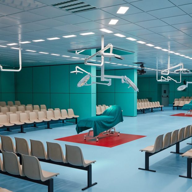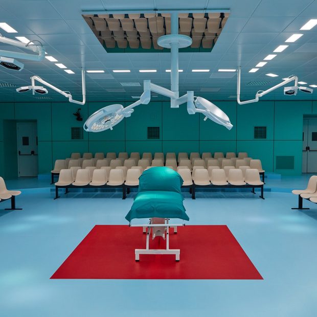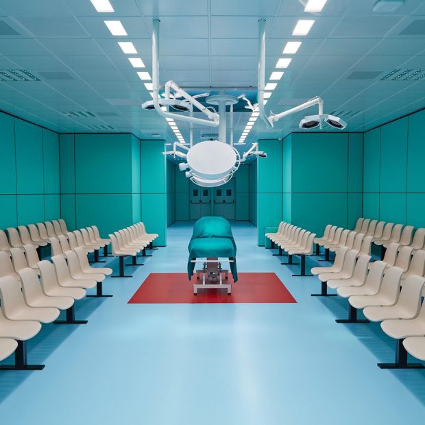 The concept reflects the work of a designer—the act of cutting, splicing and reconstructing materials and fabrics to create a new personality and identity with them. The materials used are typical of an operating room and the environment around it: PVC on the walls and floors, fire doors with panic-bars, LED lamps, and plastic chairs like those in a waiting room. The LED lighting is stark, white and blinding. – from Gucci